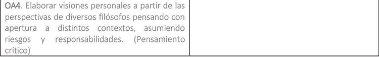 La asignatura Filosofía tiene como objetivo iniciar al estudiante en la reflexión crítica, metódica y rigurosa, así como en el conocimiento de los problemas filosóficos. Estos objetivos están intrínsecamente unidos y tienen como horizonte formativo que el estudiante sea capaz de filosofar por sí mismo. De esta forma, se facilitará la indagación con rigor y espíritu crítico acerca de preguntas filosóficas actuales, y también de hacerse cargo de razonamientos y textos fundamentales de la tradición filosófica desde sus orígenes hasta nuestros días. Esta asignatura, además, es un espacio pertinente para promover actitudes y virtudes intelectuales necesarias para que los estudiantes logren un desarrollo integral. La capacidad de asombro, de precisión argumentativa, de detenerse y cuestionar aquello que aparece como dado y de pensar por sí mismos, son disposiciones fundamentales para que los estudiantes avancen en el desarrollo de sus hábitos intelectuales, logrando con ello fortalecer su autonomía y enriquecer a la comunidad en la que participan.