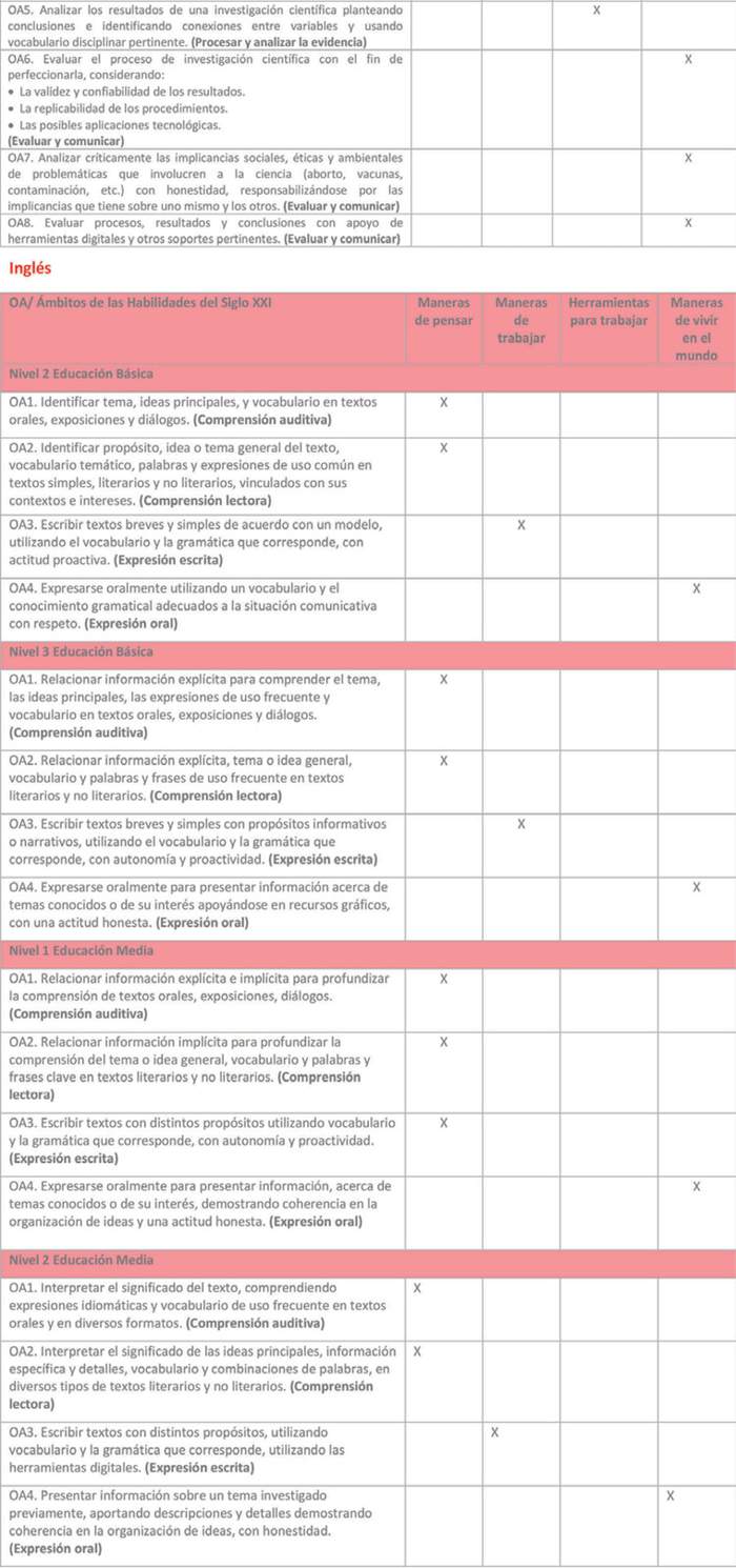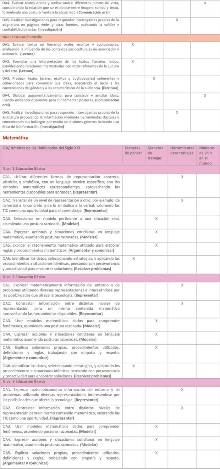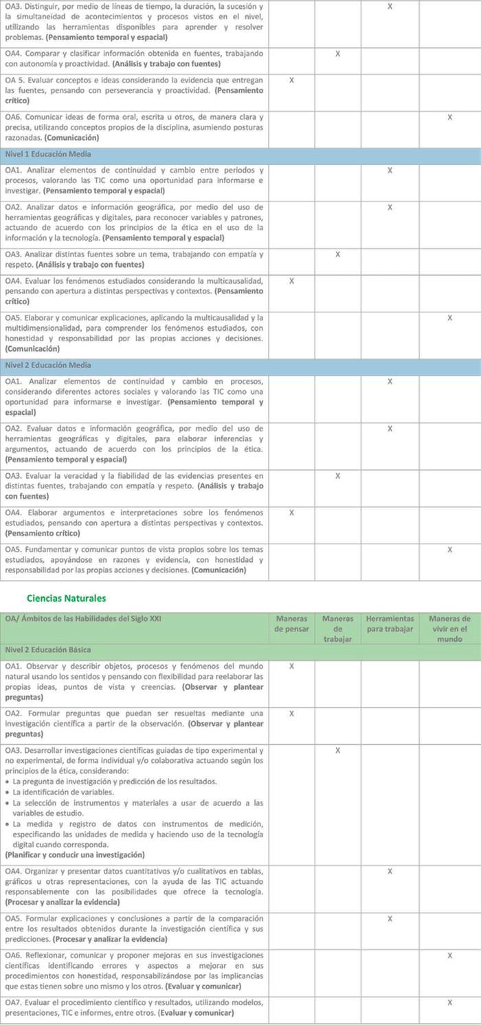 Estas bases curriculares proponen un rediseño curricular que ha sido elaborado a partir del marco de las Habilidades del siglo XXI, que opera como foco formativo del currículo y principio de construcción de los objetivos de aprendizaje. Las habilidades del siglo XXI son un conjunto de habilidades, actitudes y disposiciones que se consideran fundamentales, y que están interrelacionadas con el conocimiento que, en su conjunto, permiten a los estudiantes contar con las herramientas necesarias y una formación integral que les permitirán desenvolverse adecuadamente con el fin de satisfacer las cambiantes demandas de la sociedad y del mercado laboral, enfrentando con mayor preparación los desafíos del futuro.