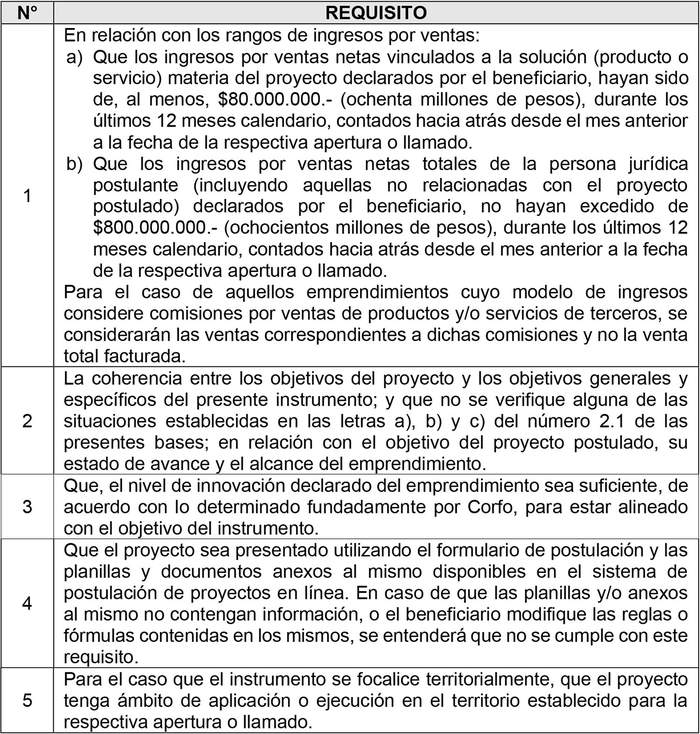 Los emprendimientos postulados deberán contar con un modelo de negocios validado y demostrar ingresos por ventas del producto o servicio (dentro de los rangos señalados en las letras b) y c) del número 4.1 siguiente).