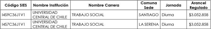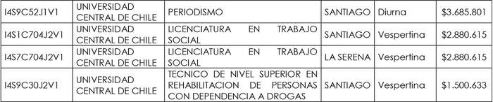 Artículo segundo.- Modifícase la resolución exenta Nº 5.425, de 2023, complementada por la resolución exenta Nº 3.265, de 2024, ambas de la Subsecretaría de Educación Superior, en el sentido de reemplazar los valores regulados de aranceles para las carreras impartidas por la Universidad Central, por los siguientes: