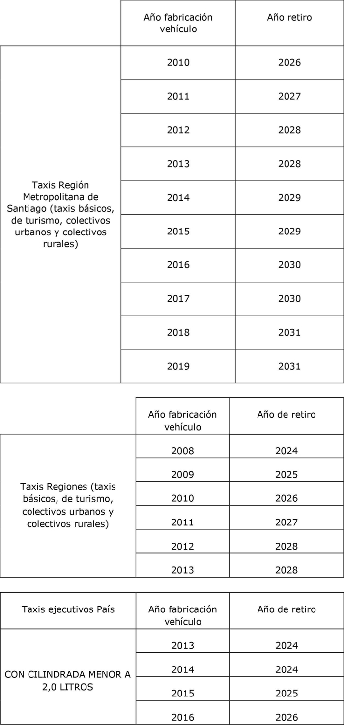 "Artículo 19°.- Los taxis, en todas sus modalidades, deberán cancelar su inscripción en el Registro Nacional de Servicios de Transporte de Pasajeros, por cumplimiento de su antigüedad máxima, al 31 de diciembre del año que corresponda, según las tablas siguientes: