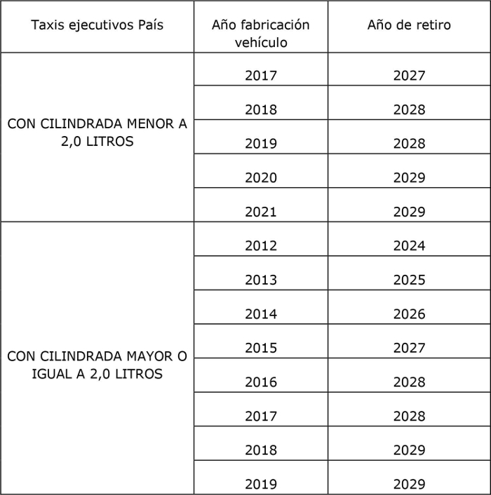 7° Que, por otro lado, el decreto supremo N° 212, de 1992, del Ministerio de Transportes y Telecomunicaciones establece que los vehículos que prestan servicios de taxis básicos, de turismo y taxis colectivos urbanos y rurales, señalando que, para prestar servicios de taxi deberán tener antigüedad de fabricación o modelo no superior a doce (12) años, entendiéndose por año de modelo o fabricación el anotado en el Registro de Vehículos Motorizados. Esta exigencia no regirá para los vehículos inscritos en cualquier Registro Regional distinto al de la Región Metropolitana, los cuales podrán extender su antigüedad hasta los quince (15) años, siempre que a contar del año trece realicen y aprueben revisiones técnicas cada cuatro meses. Para el caso de los taxis ejecutivos, deberán contar con una antigüedad máxima de ocho (8) años en el caso de vehículos que cuenten con un motor de menos de 2,0 litros de cilindrada y de diez (10) años para aquellos vehículos que cuenten con un motor igual o superior a 2,0 litros de cilindrada.