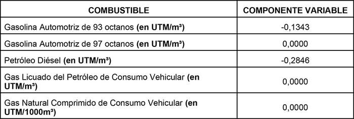 1.- Determínanse los siguientes componentes variables de los impuestos específicos establecidos en la ley N° 18.502, que Establece impuestos a los combustibles que señala, en virtud de lo señalado en el artículo 3 de la ley N° 20.765: