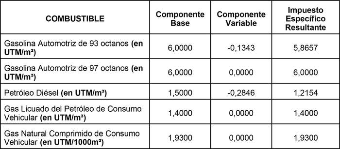3.- Determínanse, como consecuencia de lo anterior, las tasas de los Impuestos Específicos de los Combustibles establecidos en la ley N° 18.502, los cuales serán iguales a su componente base, considerando además el componente variable, que puede ser sumado o restado según lo previsto en el artículo 3 de la ley N° 20.765 y lo dispuesto en el artículo 8 de su Reglamento.