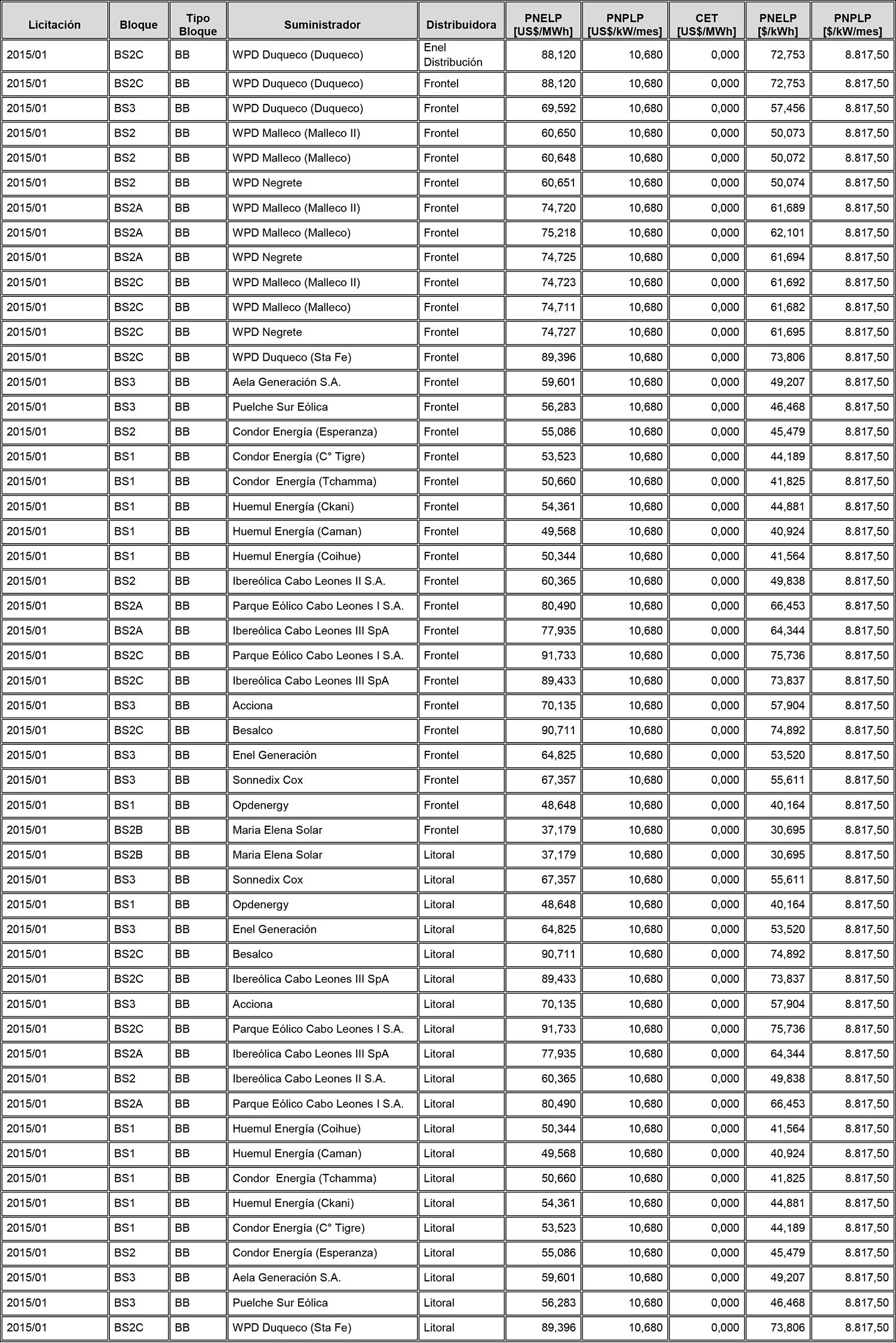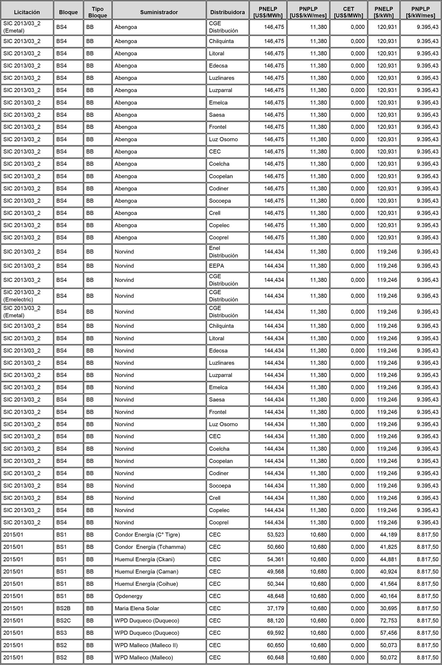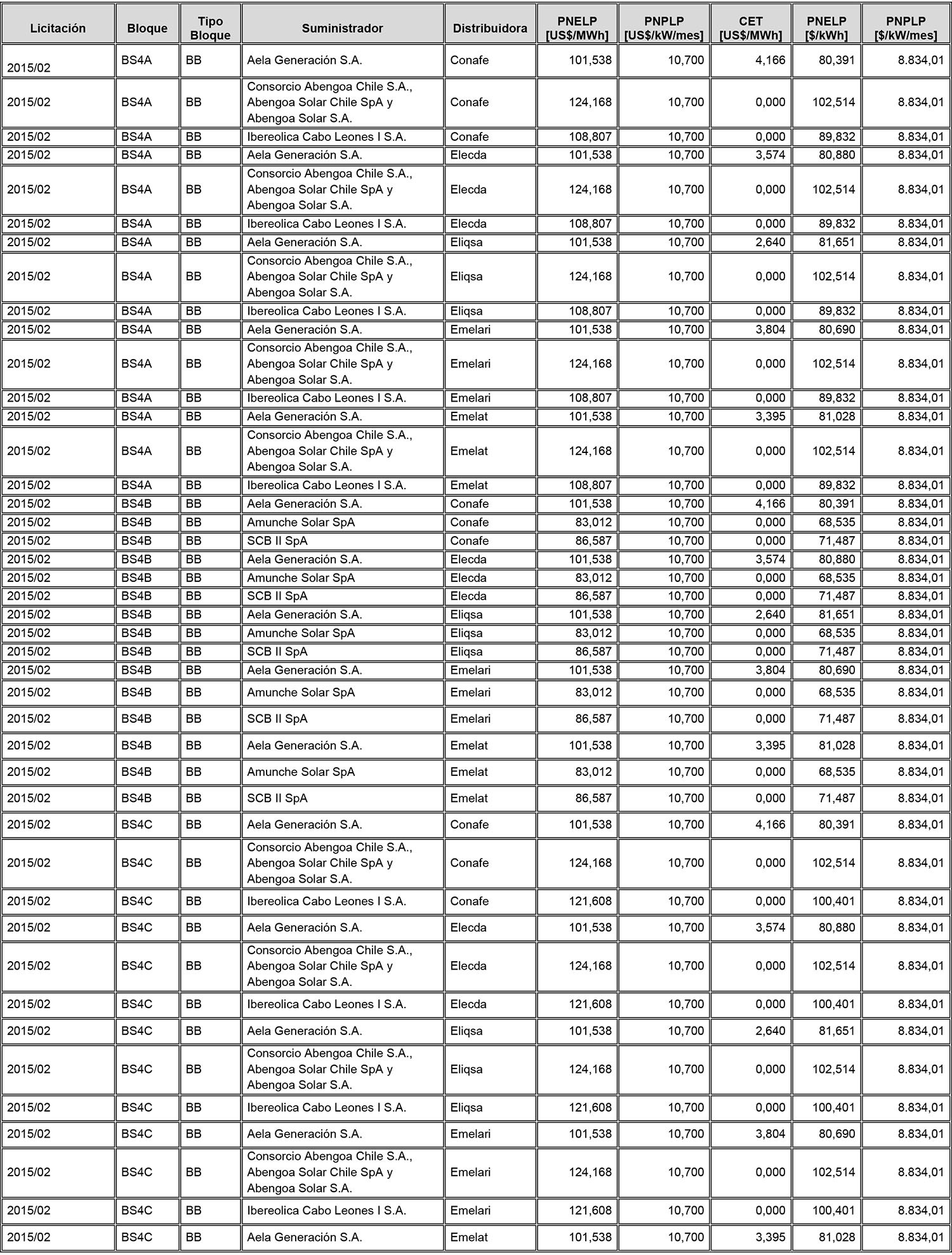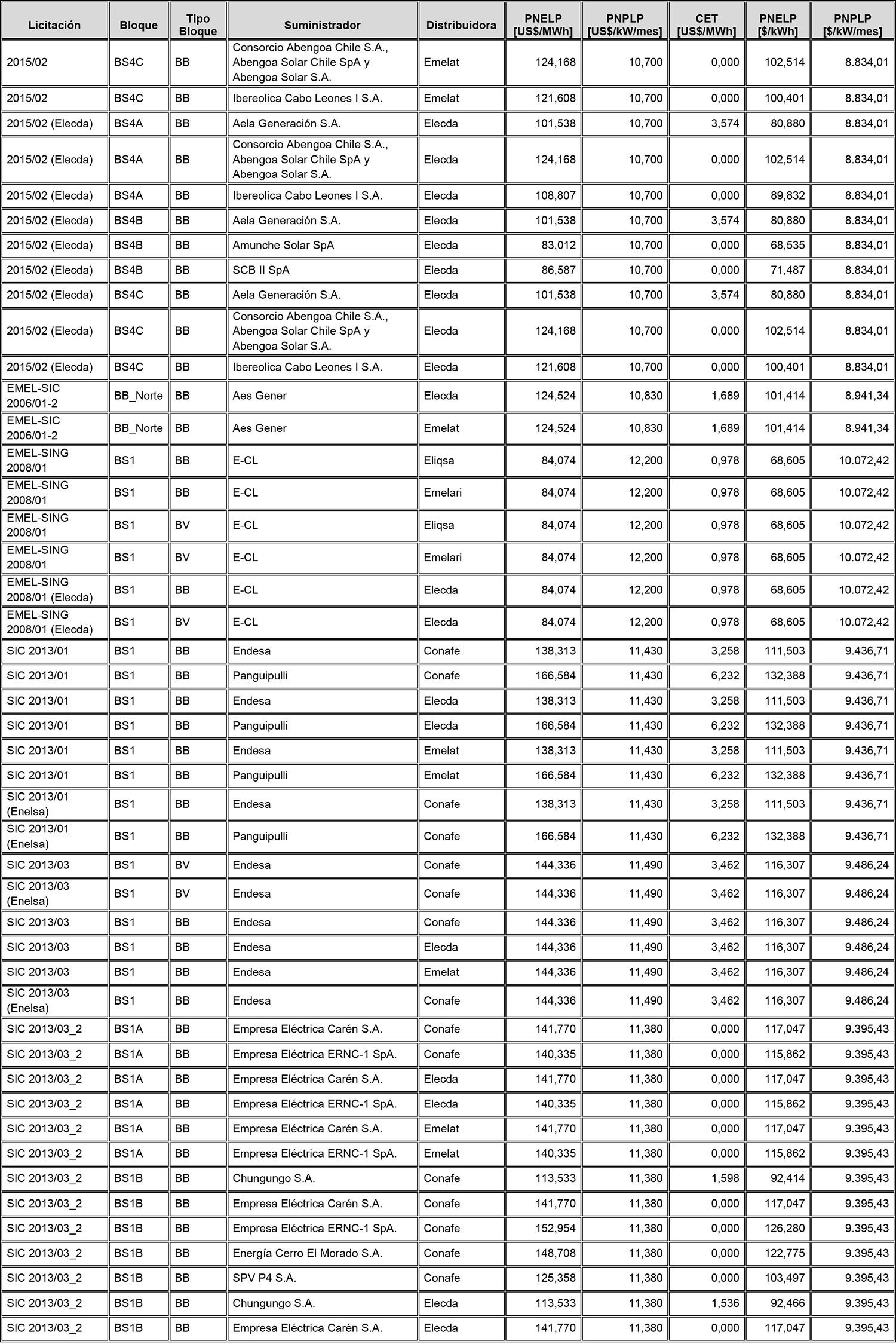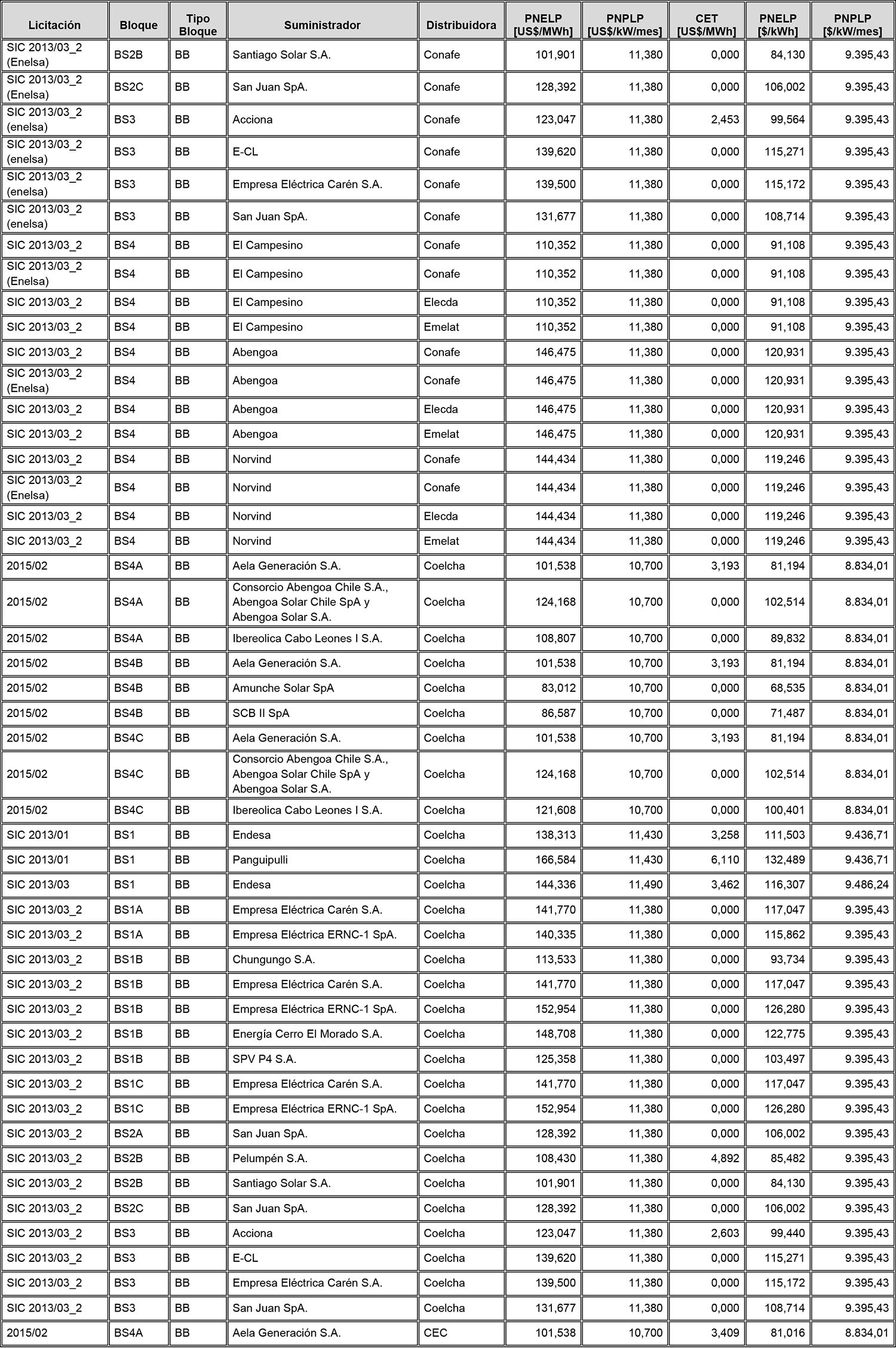 Los Precios de Nudo de Largo Plazo de energía y potencia, de acuerdo con lo señalado en los artículos 6° y 11° de la resolución exenta N° 703, y los descuentos del monto del Cargo Equivalente de Transmisión Final ("CET") en el precio total de energía de los contratos modificados de acuerdo a lo señalado en el artículo vigesimoquinto transitorio, letra E. número i., de la ley N° 20.936 y en la resolución exenta N° 7, son los que se indican en la siguiente tabla: