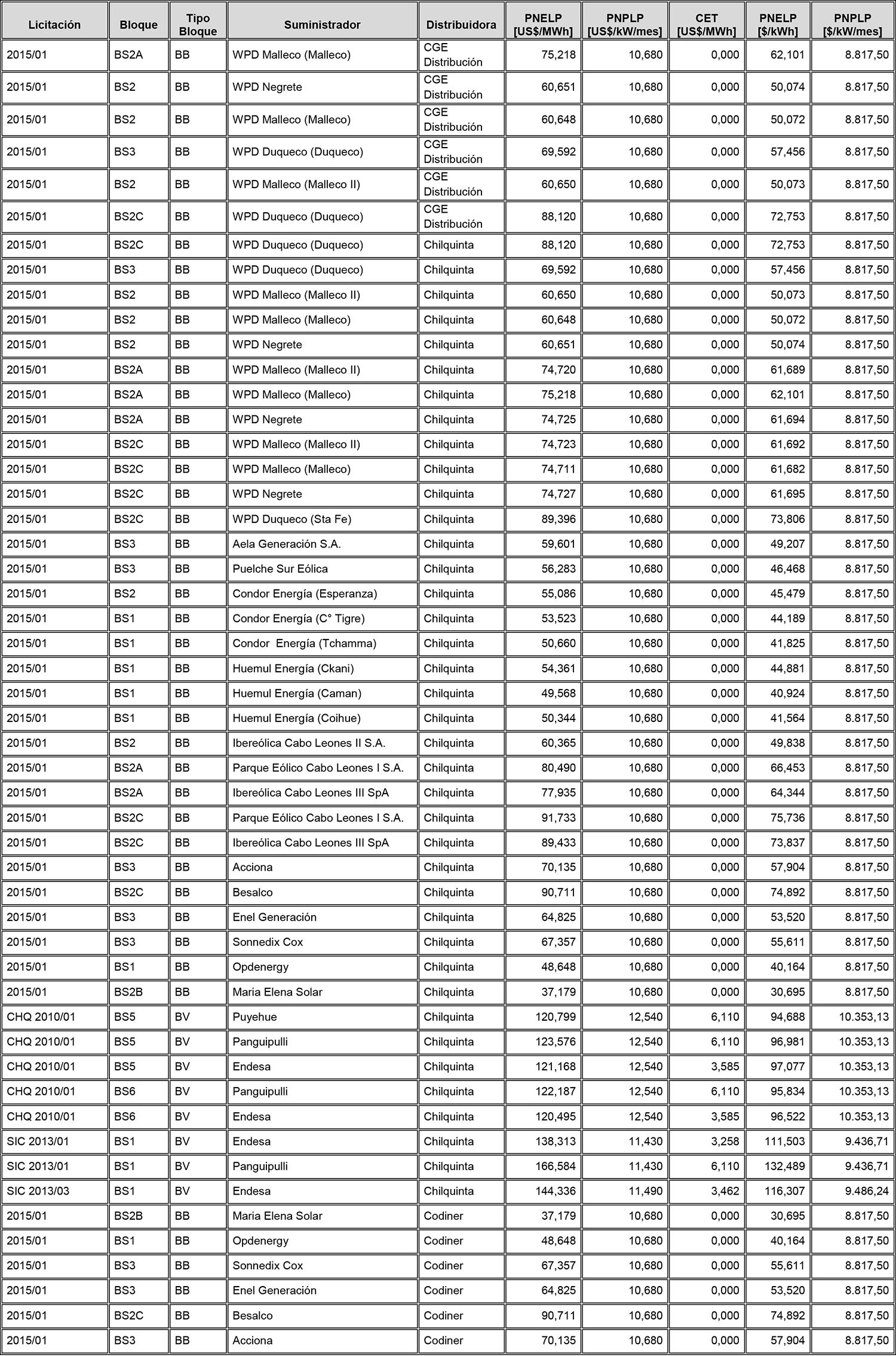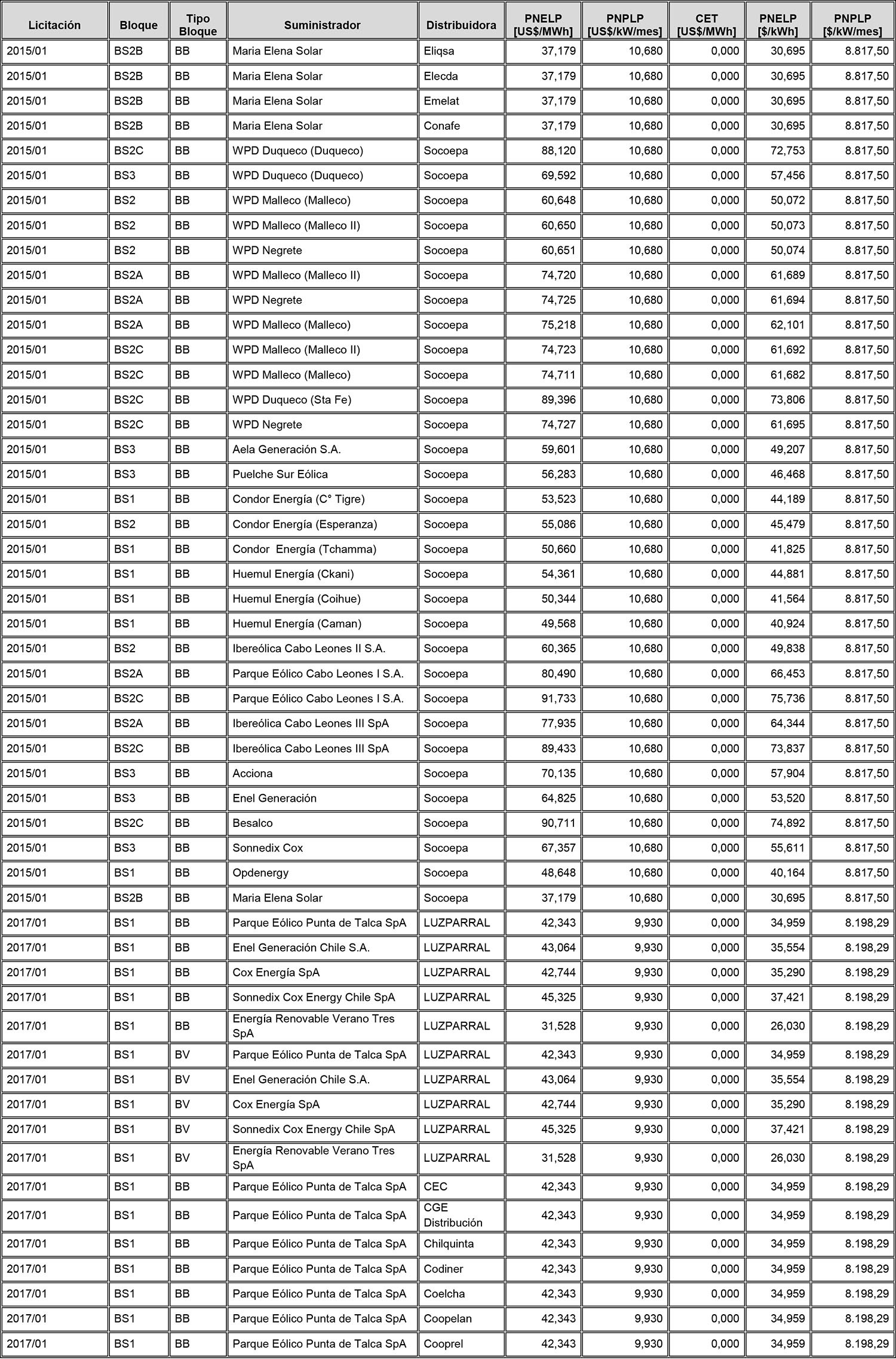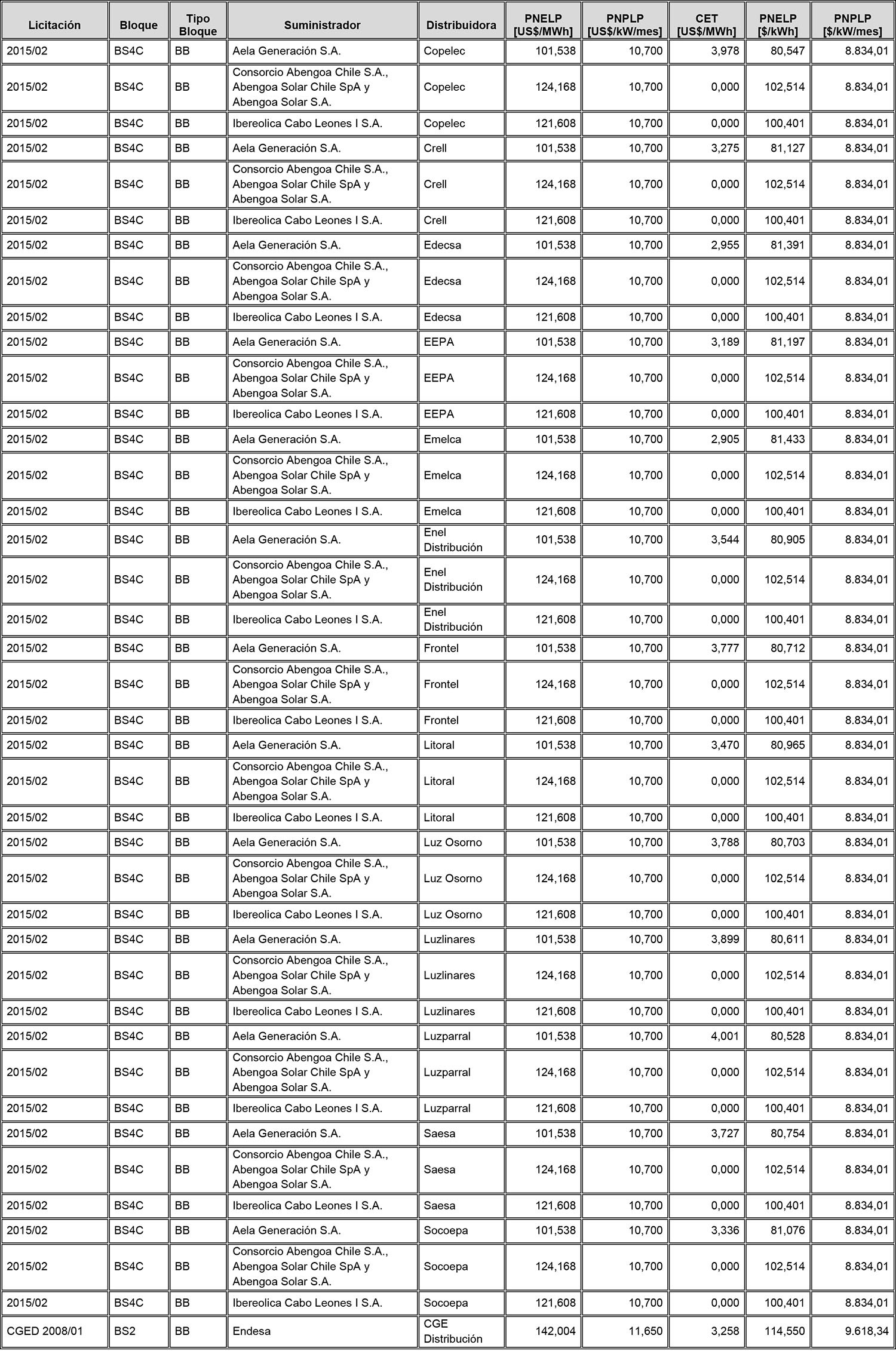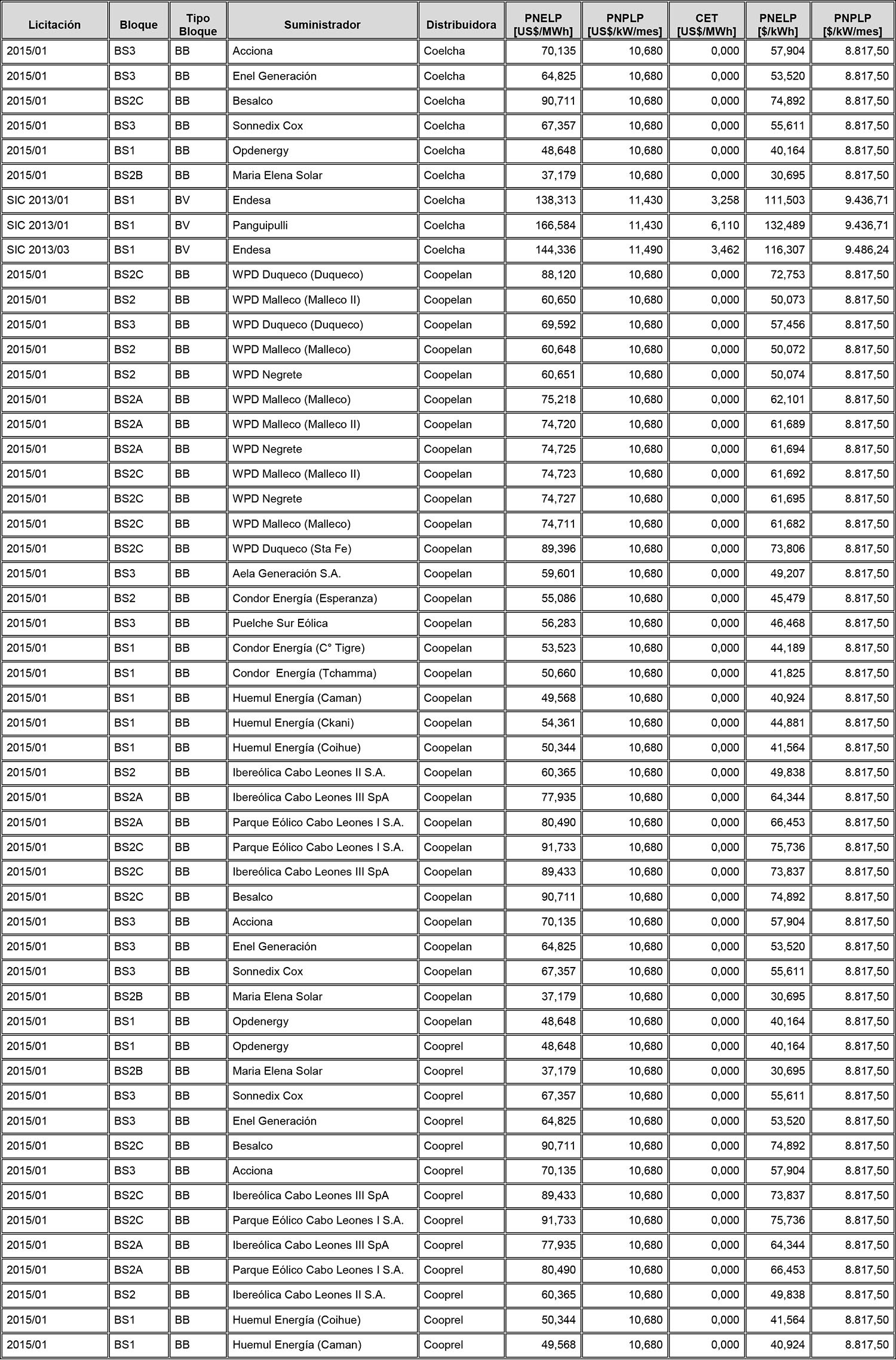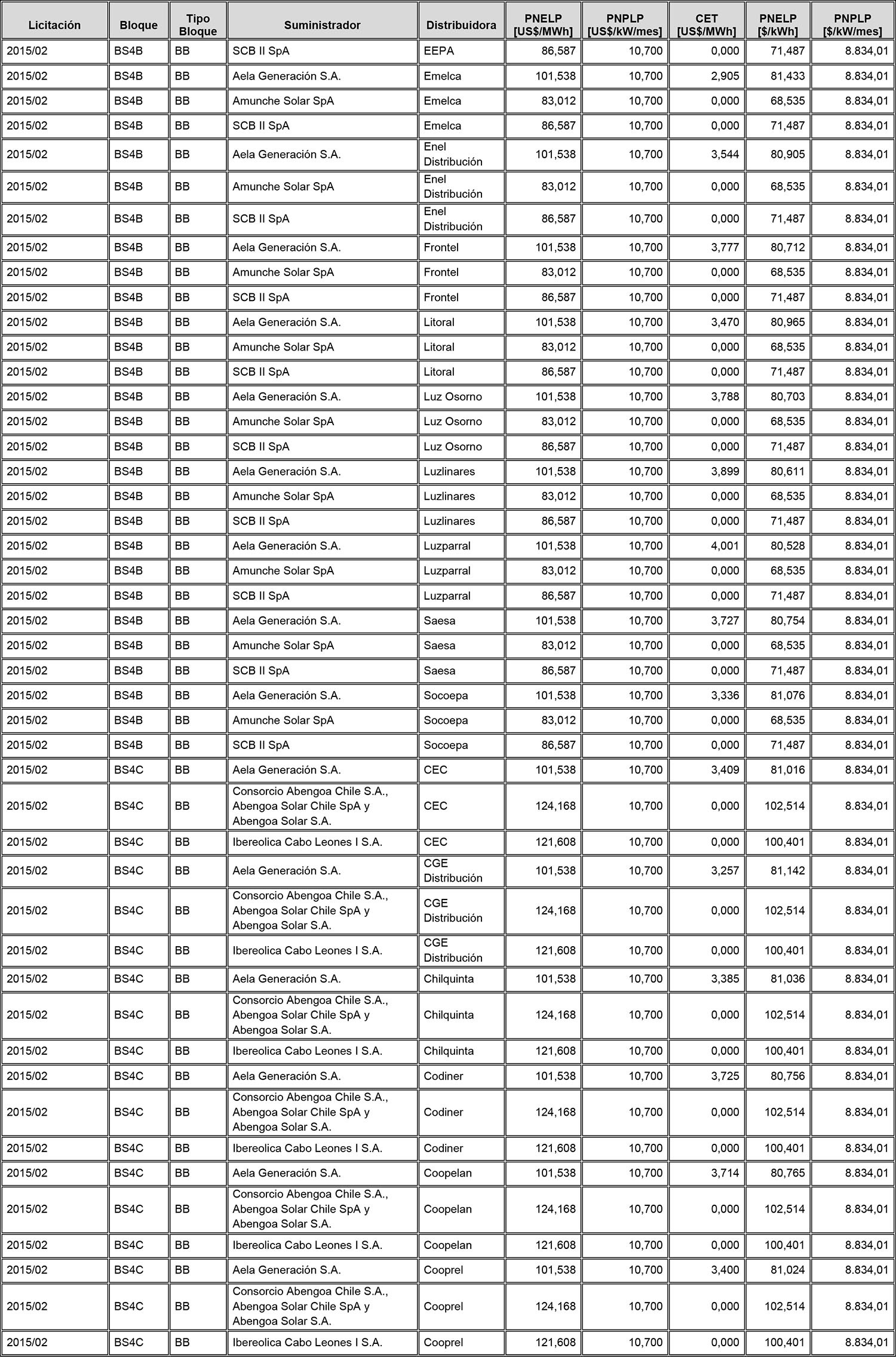 Los Precios de Nudo de Largo Plazo de energía y potencia, de acuerdo con lo señalado en los artículos 6° y 11° de la resolución exenta N° 703, y los descuentos del monto del Cargo Equivalente de Transmisión Final ("CET") en el precio total de energía de los contratos modificados de acuerdo a lo señalado en el artículo vigesimoquinto transitorio, letra E. número i., de la ley N° 20.936 y en la resolución exenta N° 7, son los que se indican en la siguiente tabla: