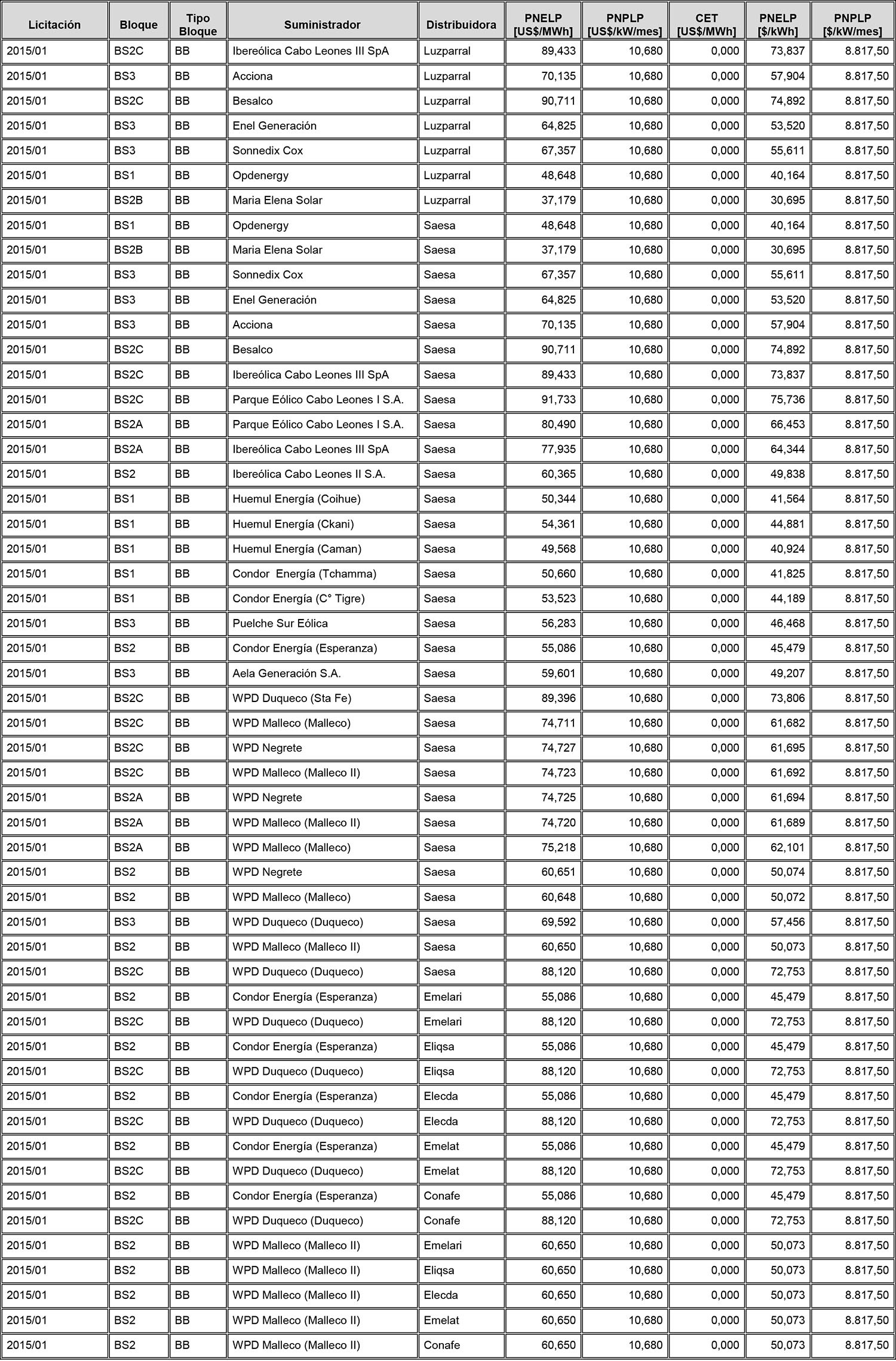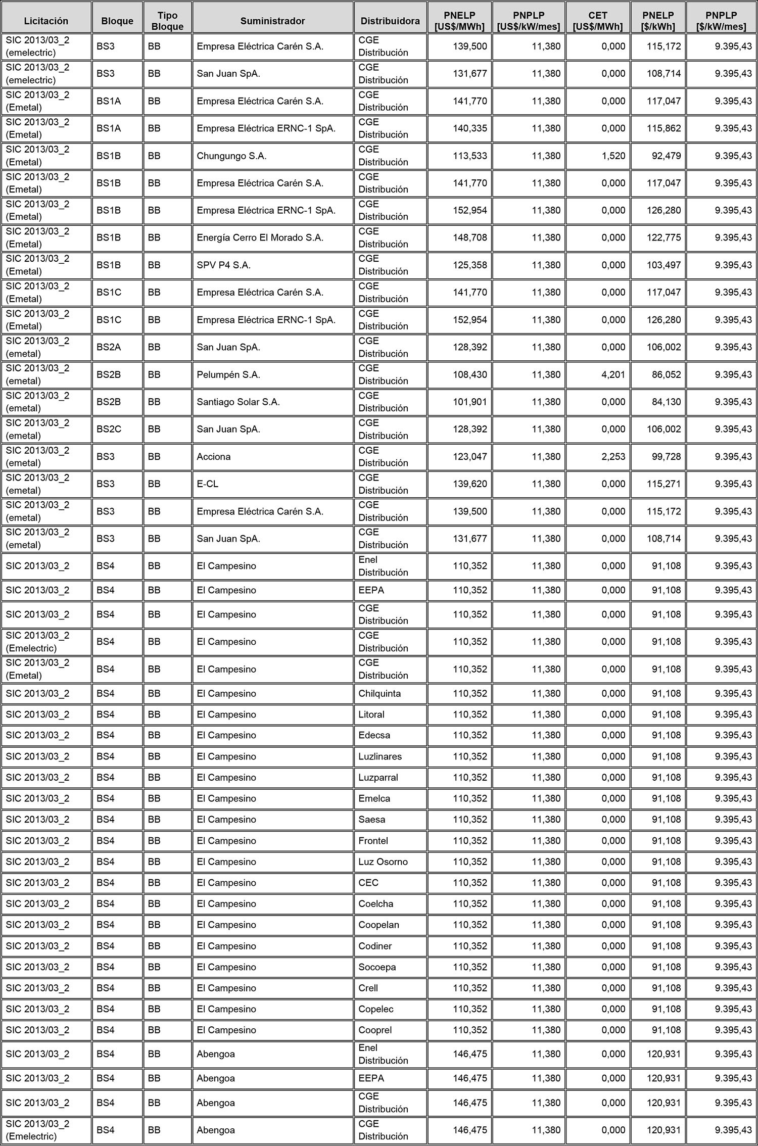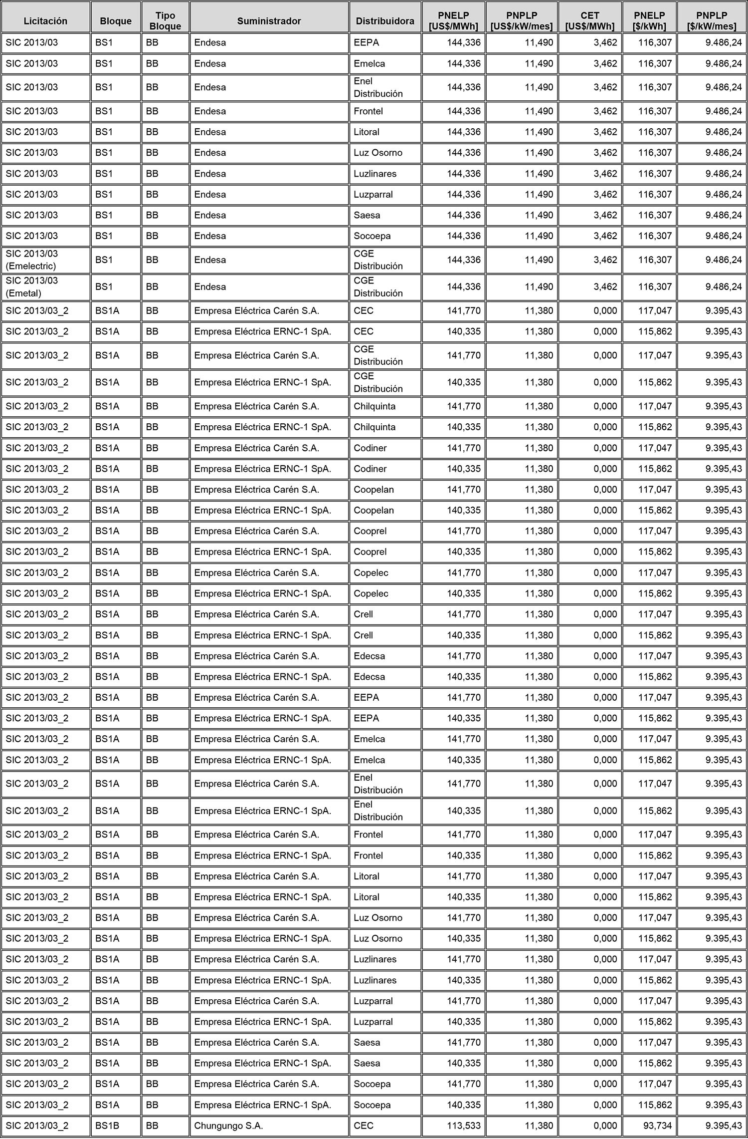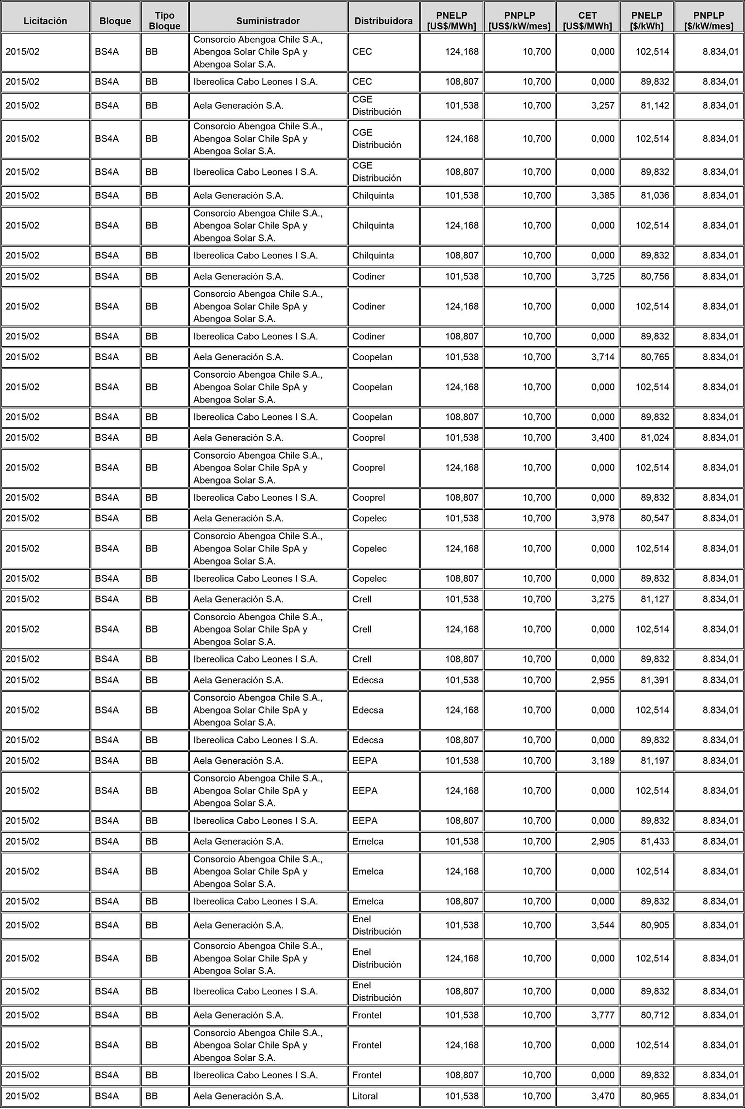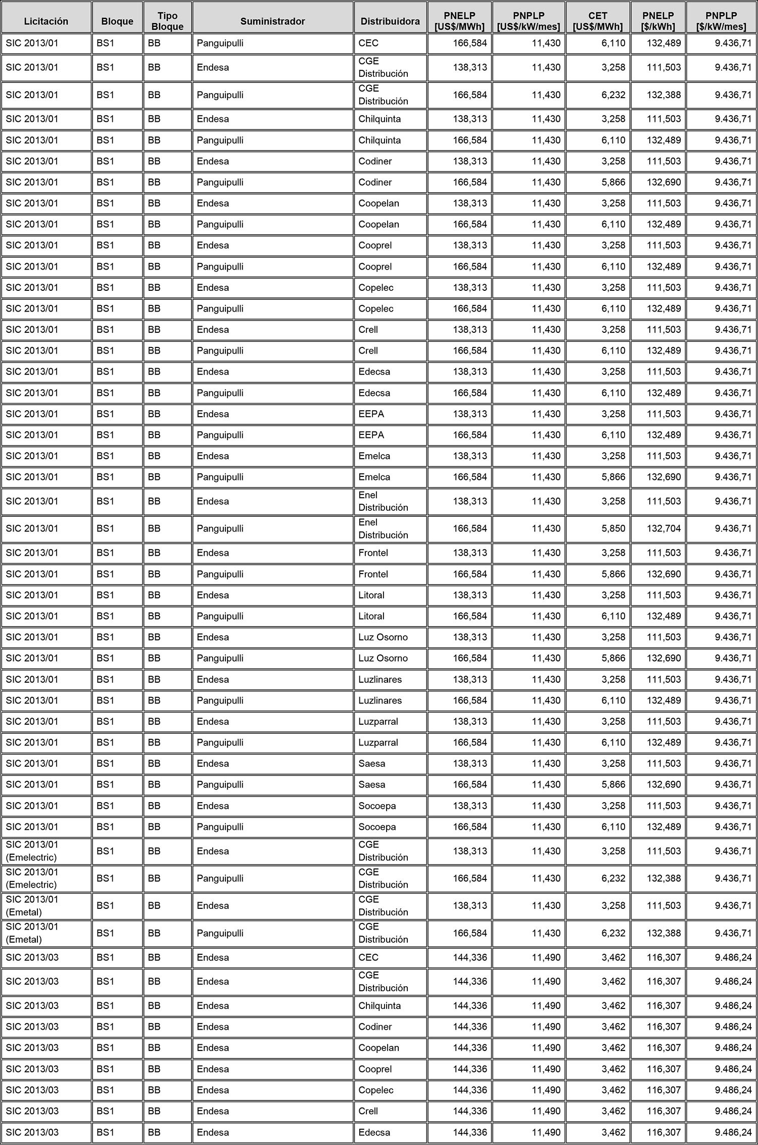 Los Precios de Nudo de Largo Plazo de energía y potencia, de acuerdo con lo señalado en los artículos 6° y 11° de la resolución exenta N° 703, y los descuentos del monto del Cargo Equivalente de Transmisión Final ("CET") en el precio total de energía de los contratos modificados de acuerdo a lo señalado en el artículo vigesimoquinto transitorio, letra E. número i., de la ley N° 20.936 y en la resolución exenta N° 7, son los que se indican en la siguiente tabla: