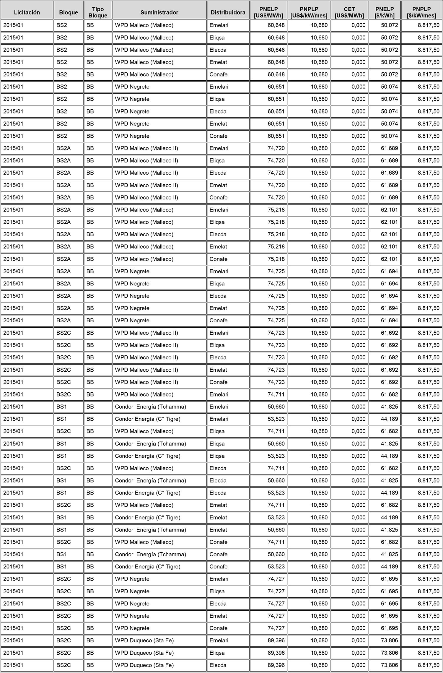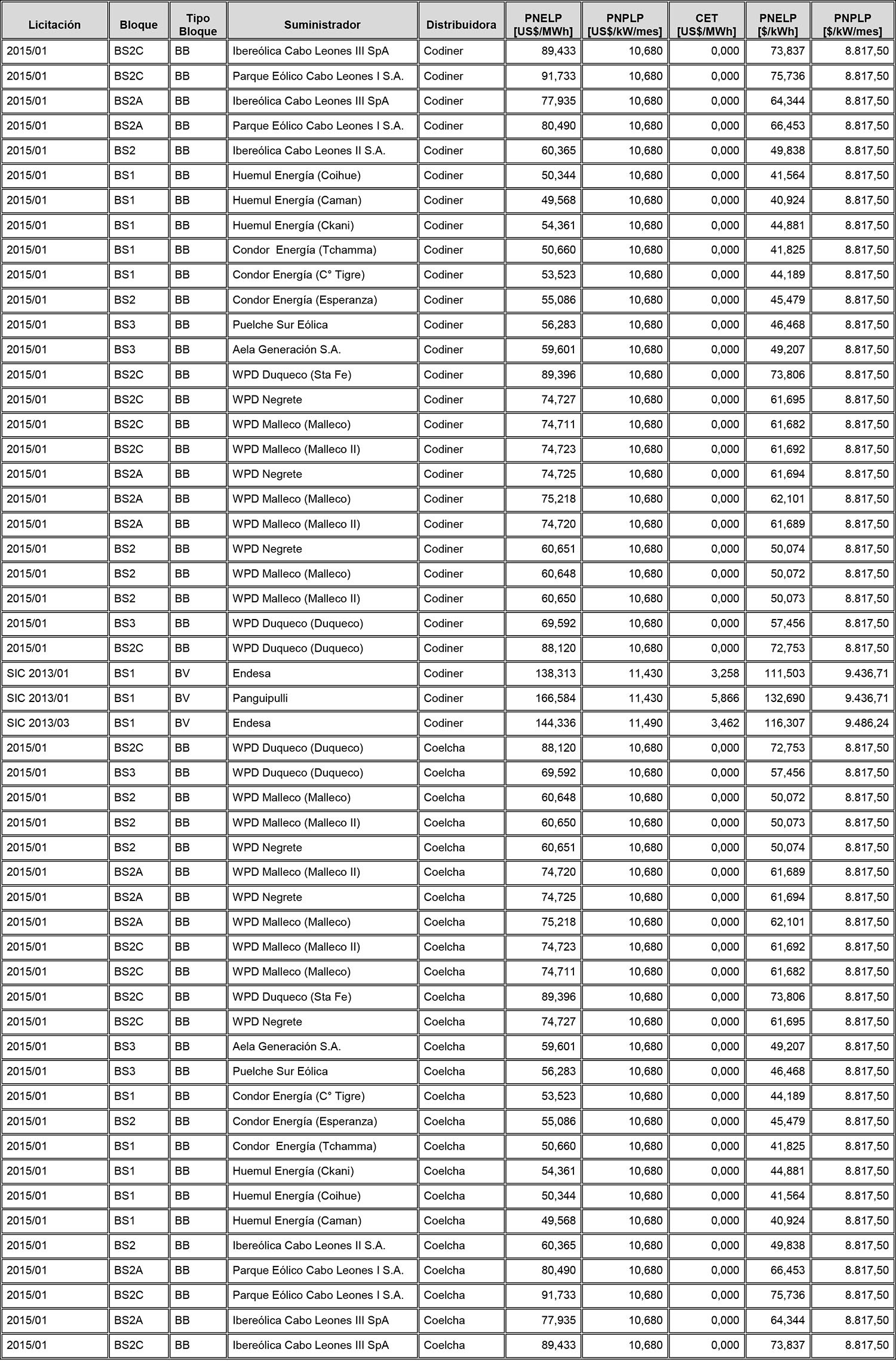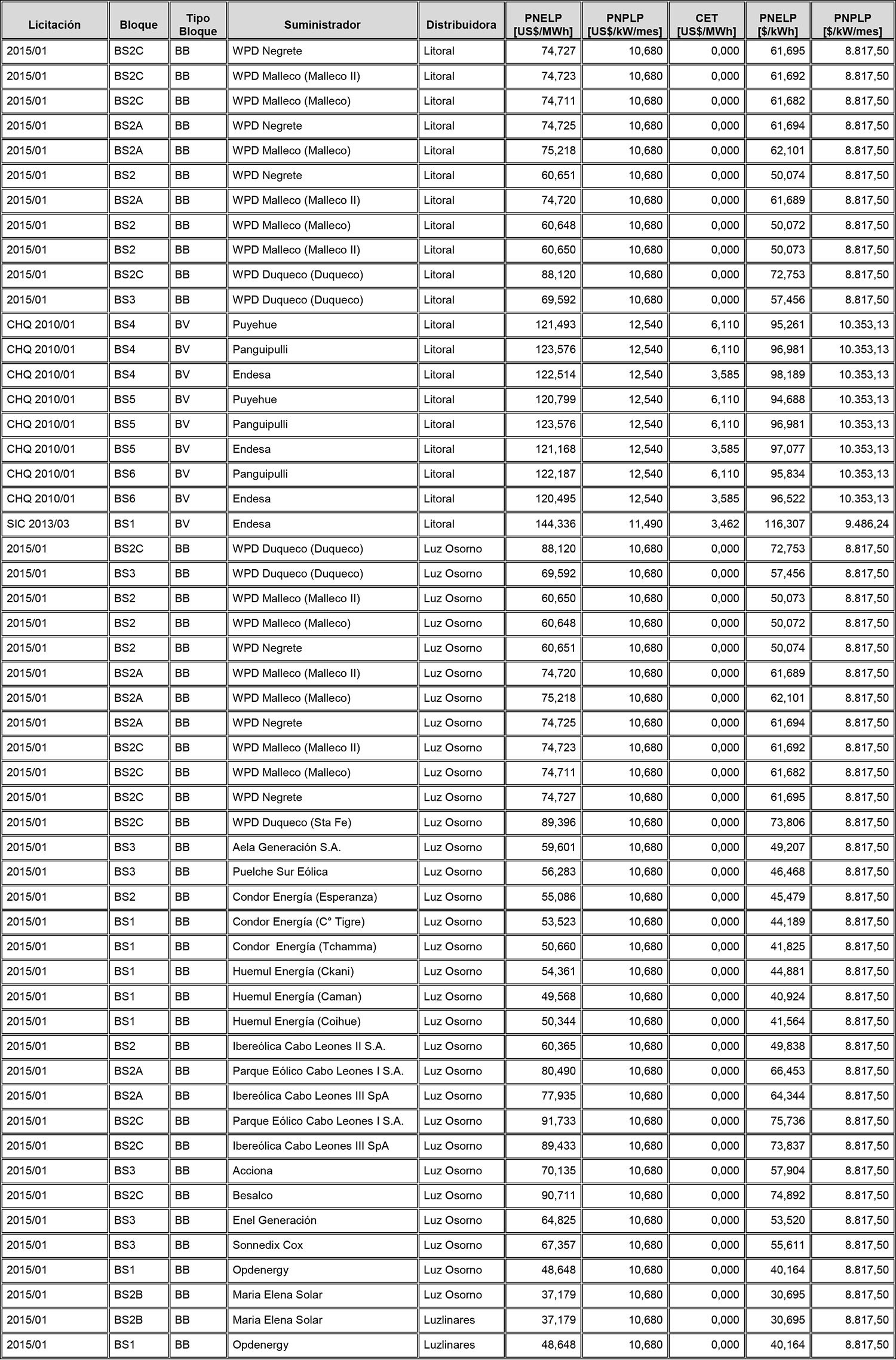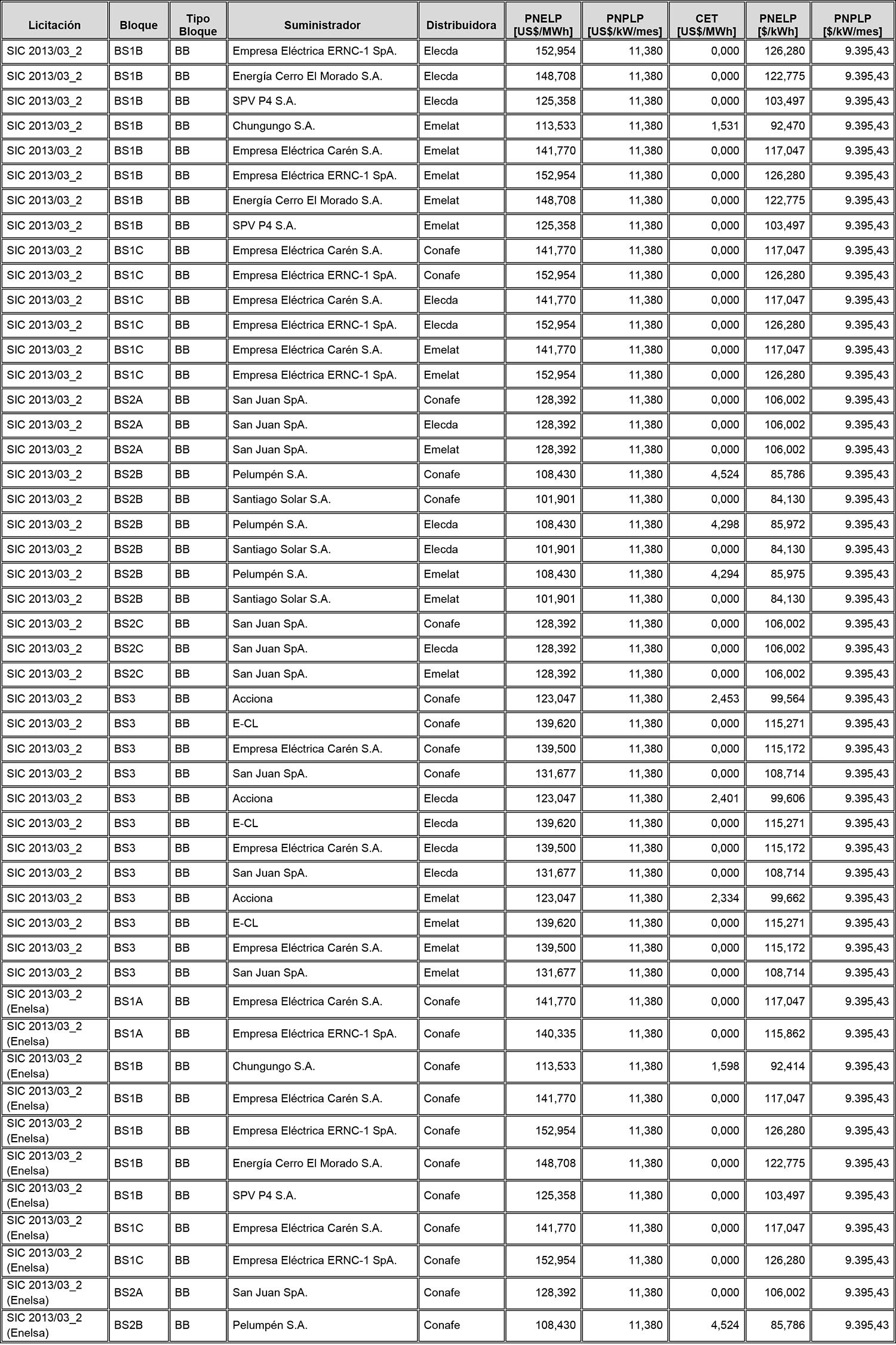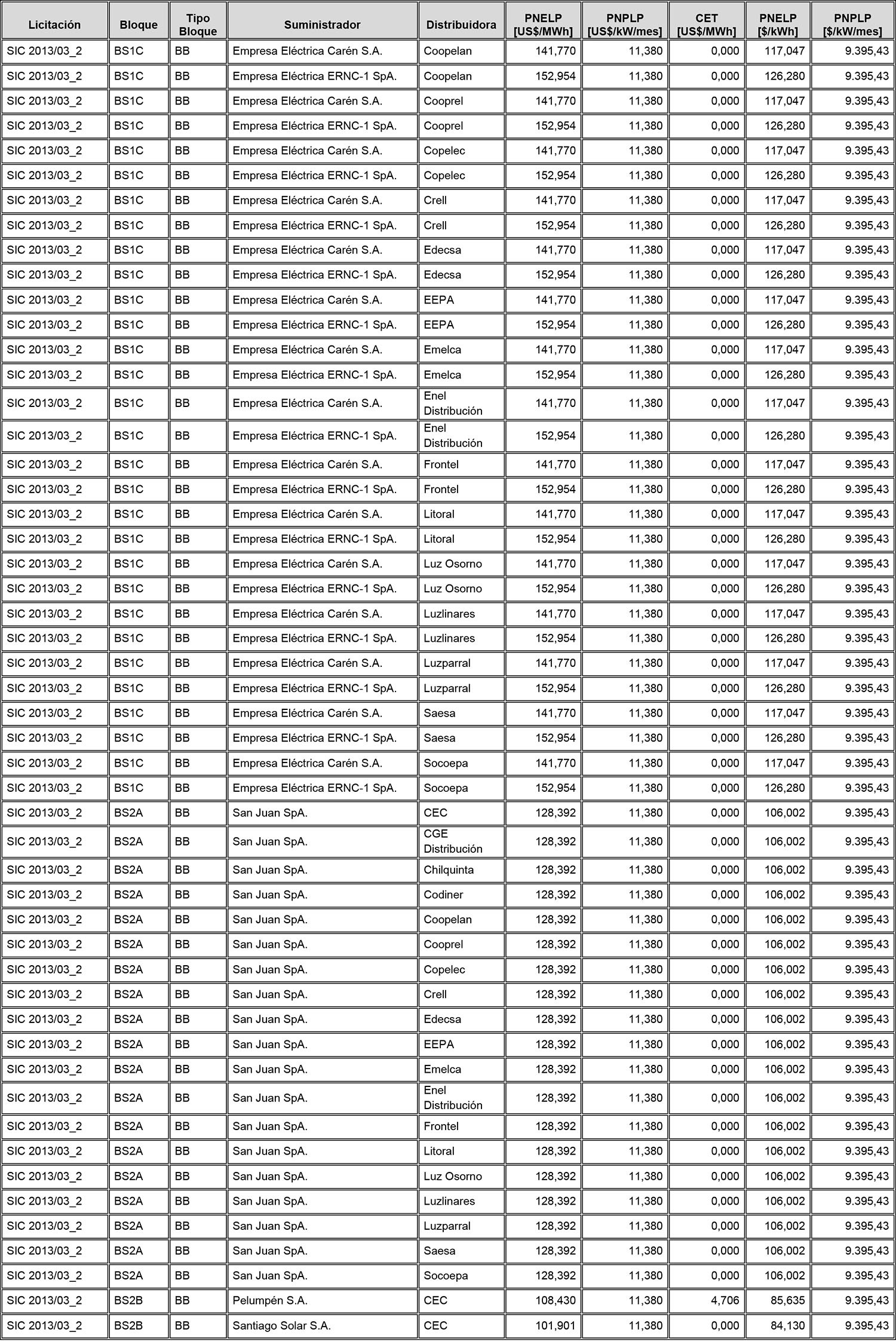 Los Precios de Nudo de Largo Plazo de energía y potencia, de acuerdo con lo señalado en los artículos 6° y 11° de la resolución exenta N° 703, y los descuentos del monto del Cargo Equivalente de Transmisión Final ("CET") en el precio total de energía de los contratos modificados de acuerdo a lo señalado en el artículo vigesimoquinto transitorio, letra E. número i., de la ley N° 20.936 y en la resolución exenta N° 7, son los que se indican en la siguiente tabla: