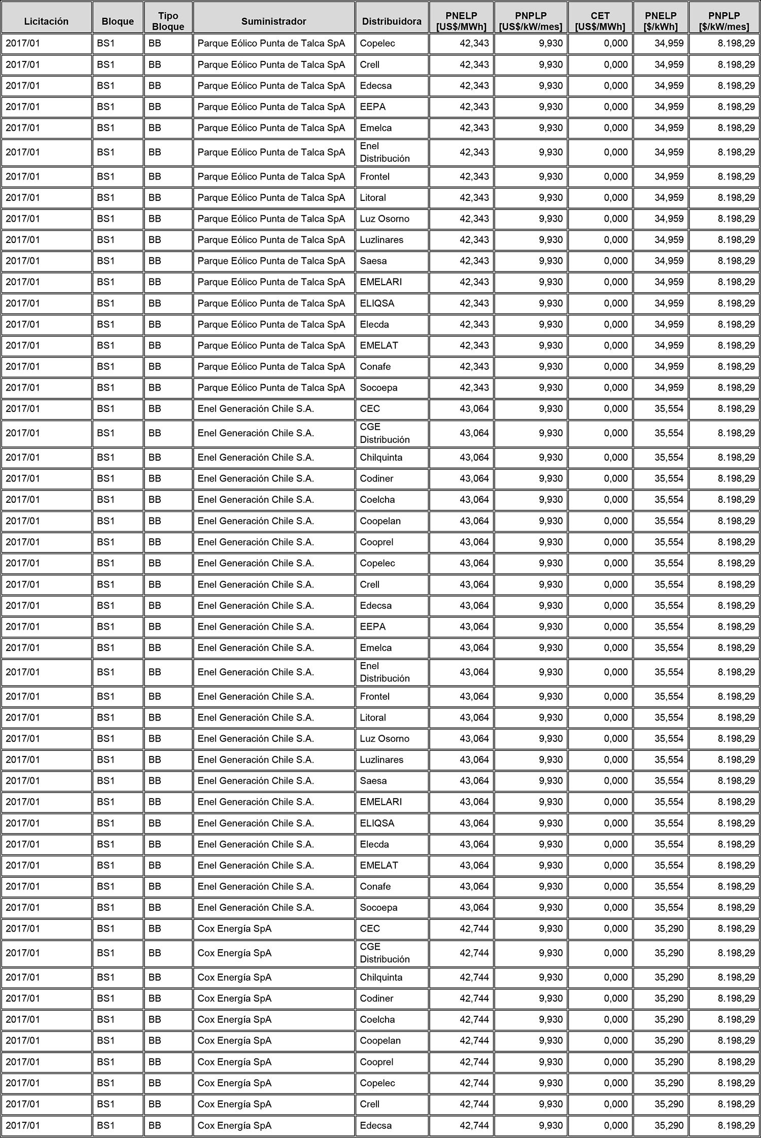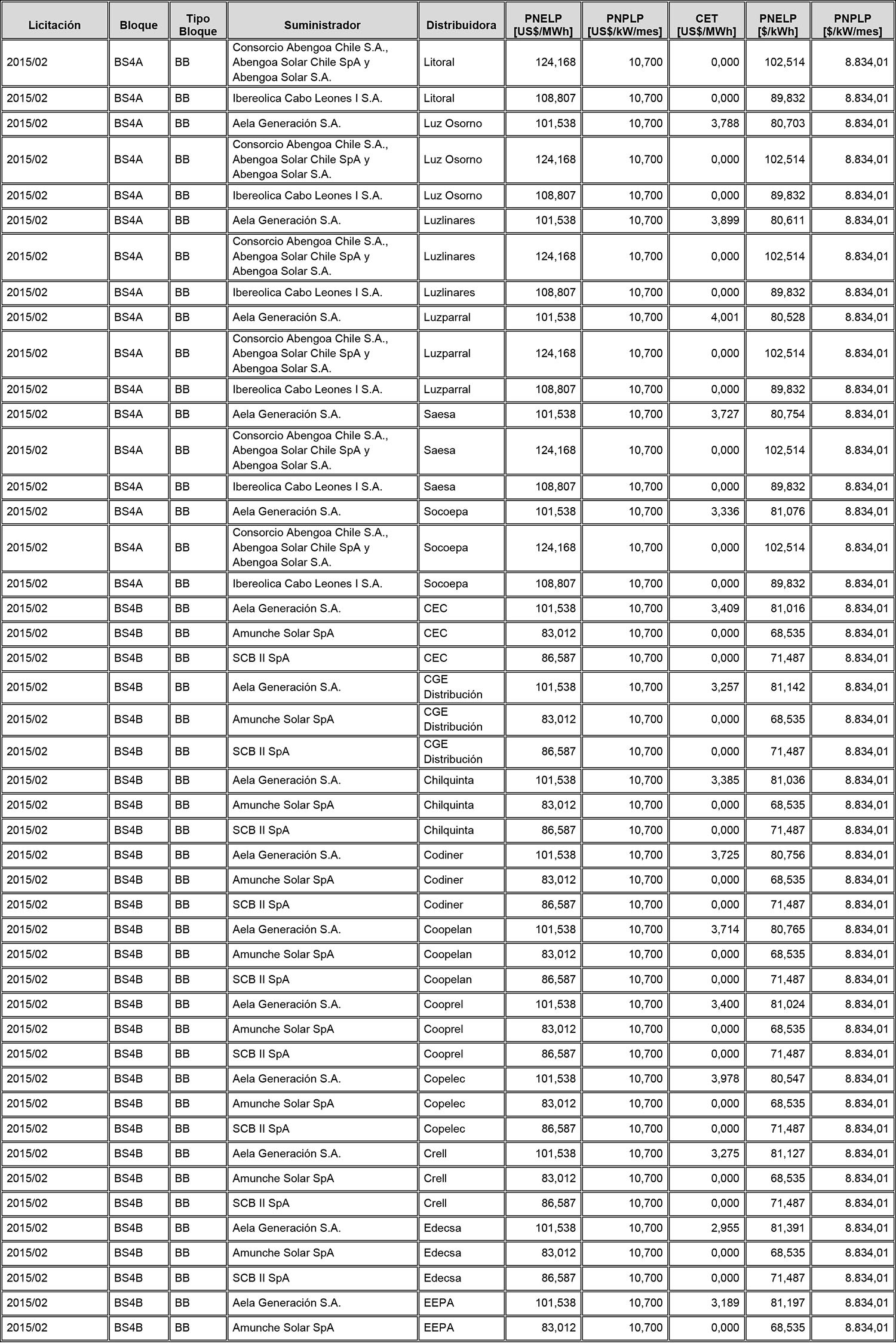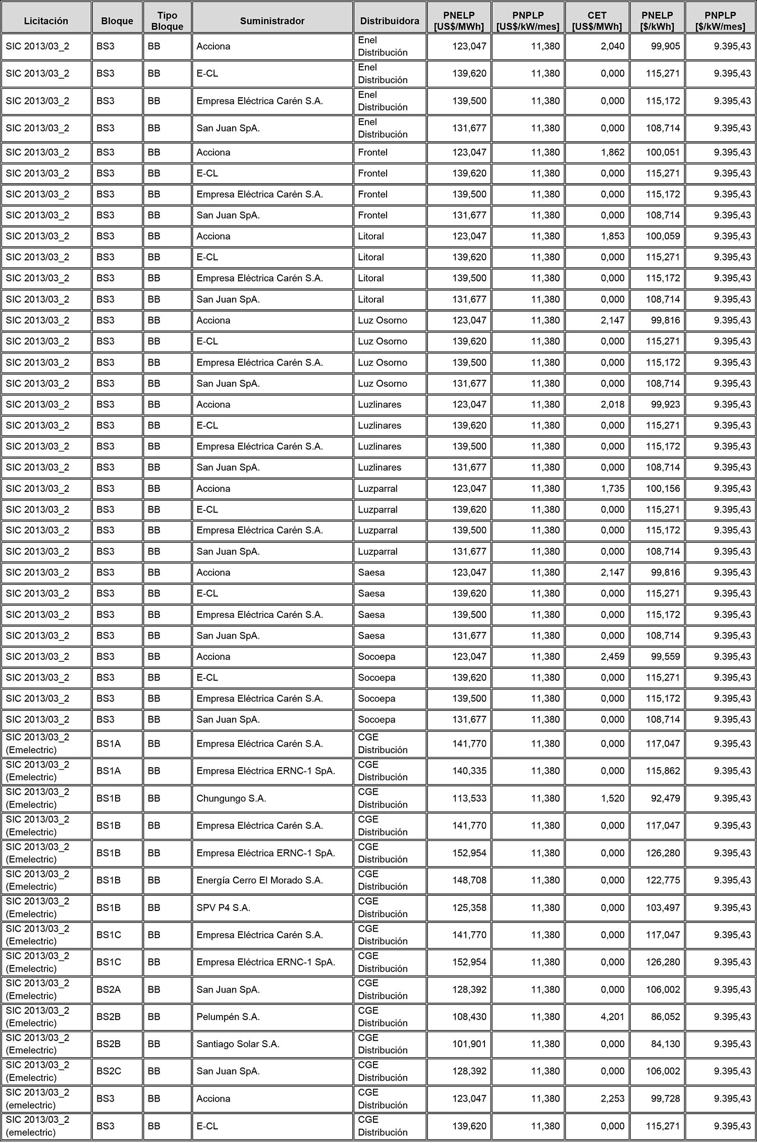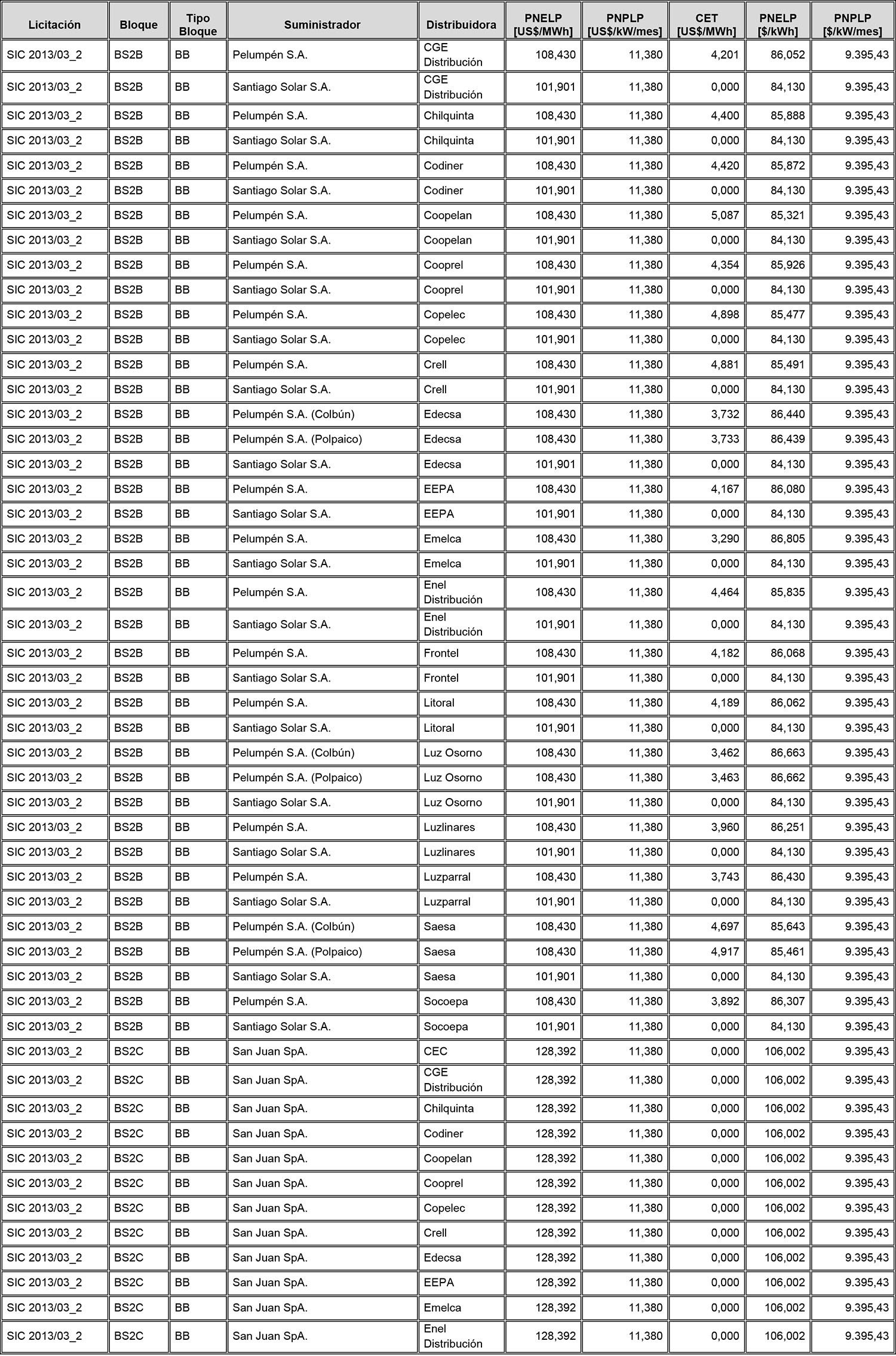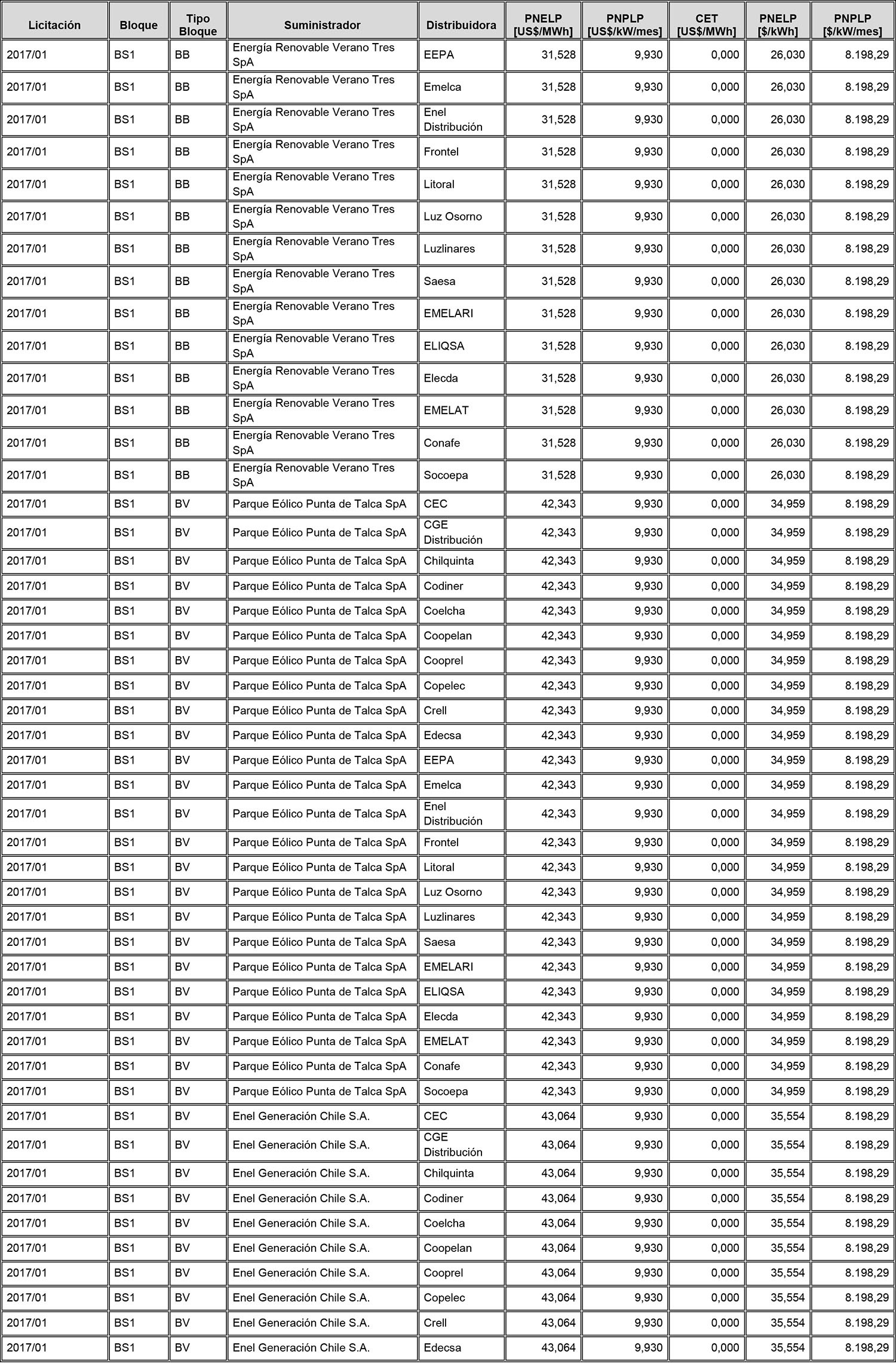 Los Precios de Nudo de Largo Plazo de energía y potencia, de acuerdo con lo señalado en los artículos 6° y 11° de la resolución exenta N° 703, y los descuentos del monto del Cargo Equivalente de Transmisión Final ("CET") en el precio total de energía de los contratos modificados de acuerdo a lo señalado en el artículo vigesimoquinto transitorio, letra E. número i., de la ley N° 20.936 y en la resolución exenta N° 7, son los que se indican en la siguiente tabla: