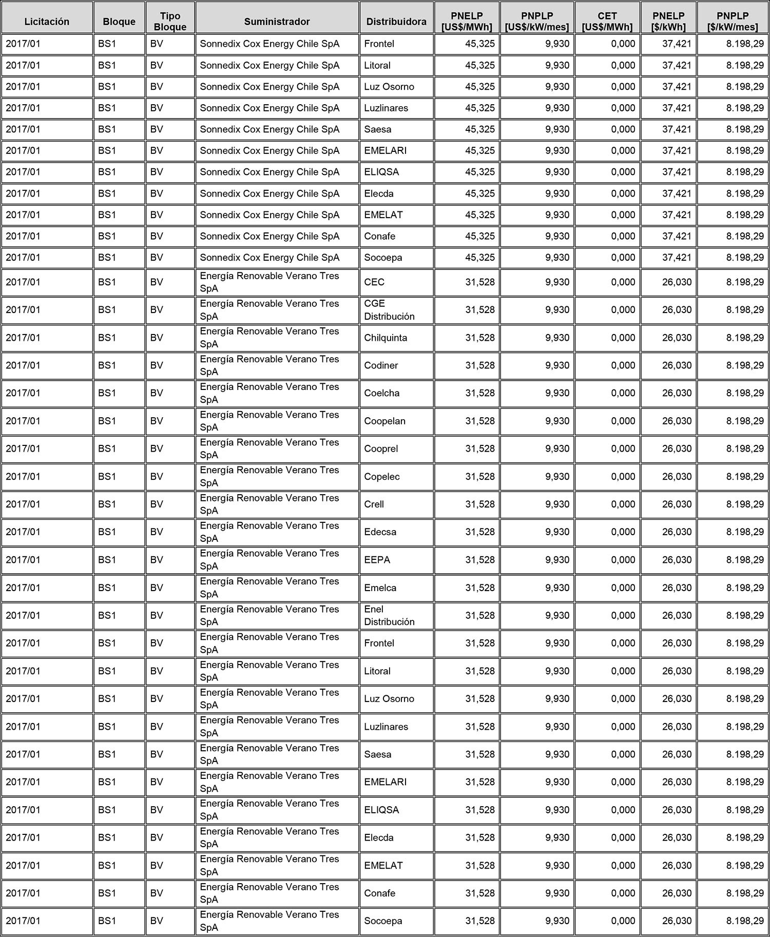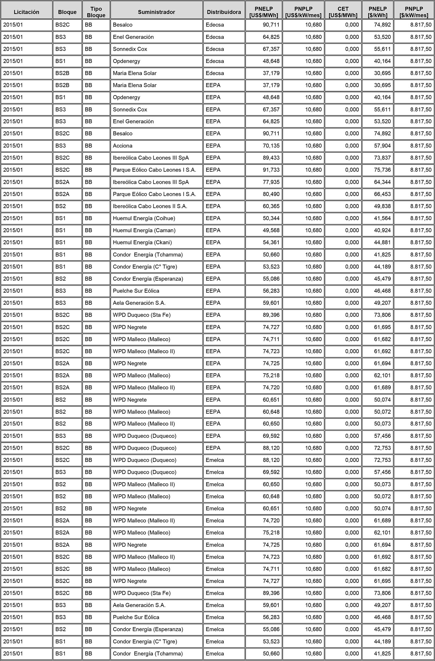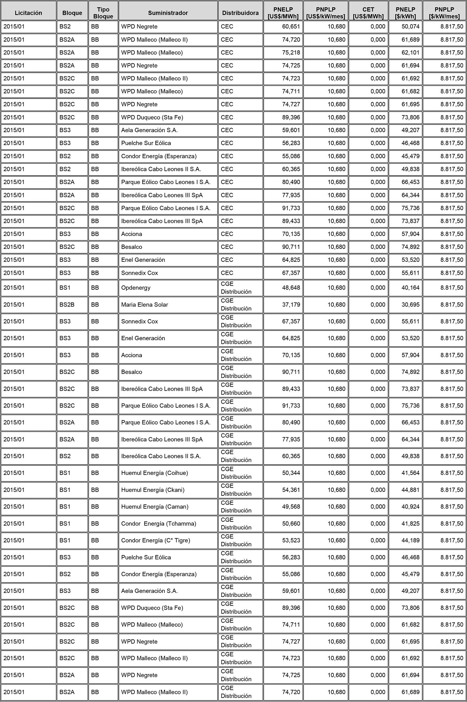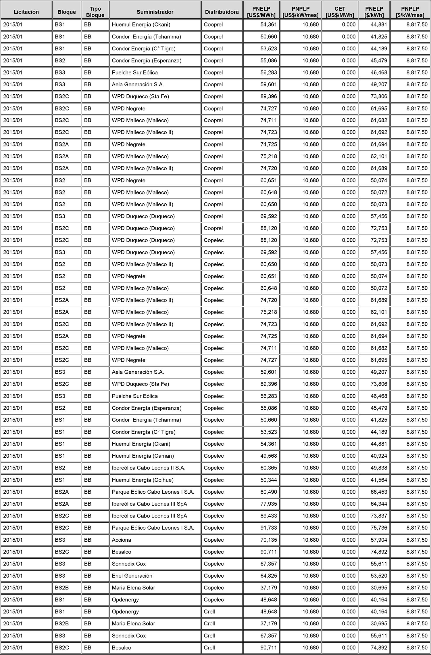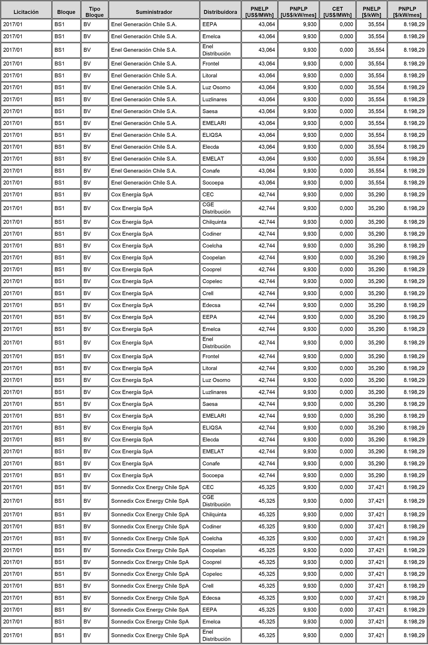 Los Precios de Nudo de Largo Plazo de energía y potencia, de acuerdo con lo señalado en los artículos 6° y 11° de la resolución exenta N° 703, y los descuentos del monto del Cargo Equivalente de Transmisión Final ("CET") en el precio total de energía de los contratos modificados de acuerdo a lo señalado en el artículo vigesimoquinto transitorio, letra E. número i., de la ley N° 20.936 y en la resolución exenta N° 7, son los que se indican en la siguiente tabla: