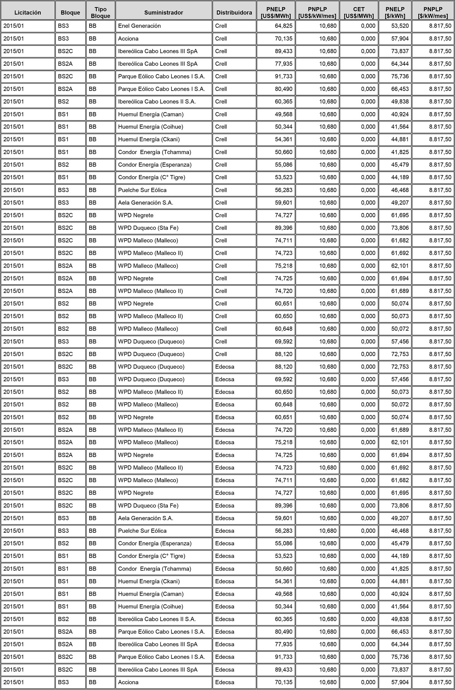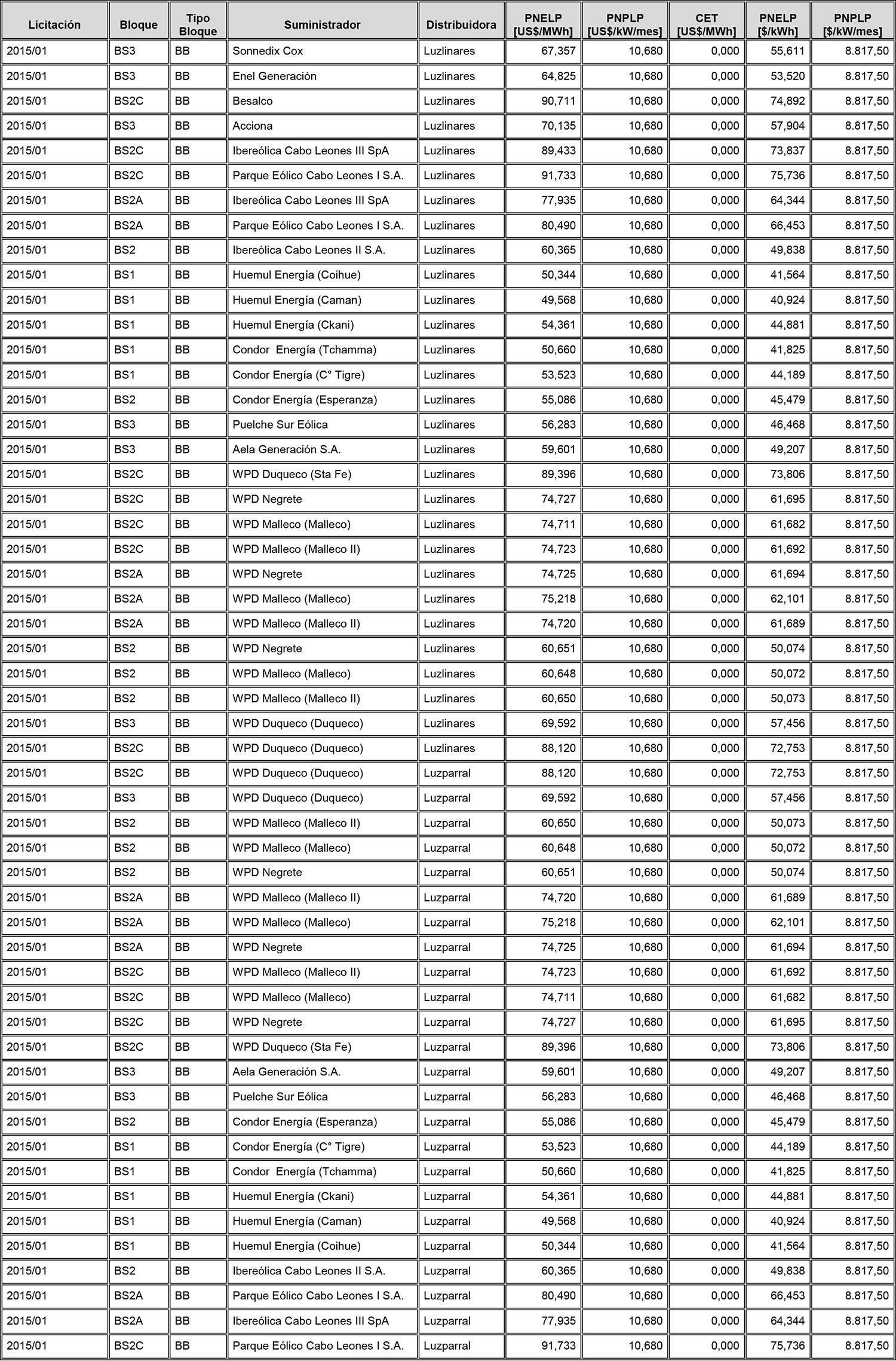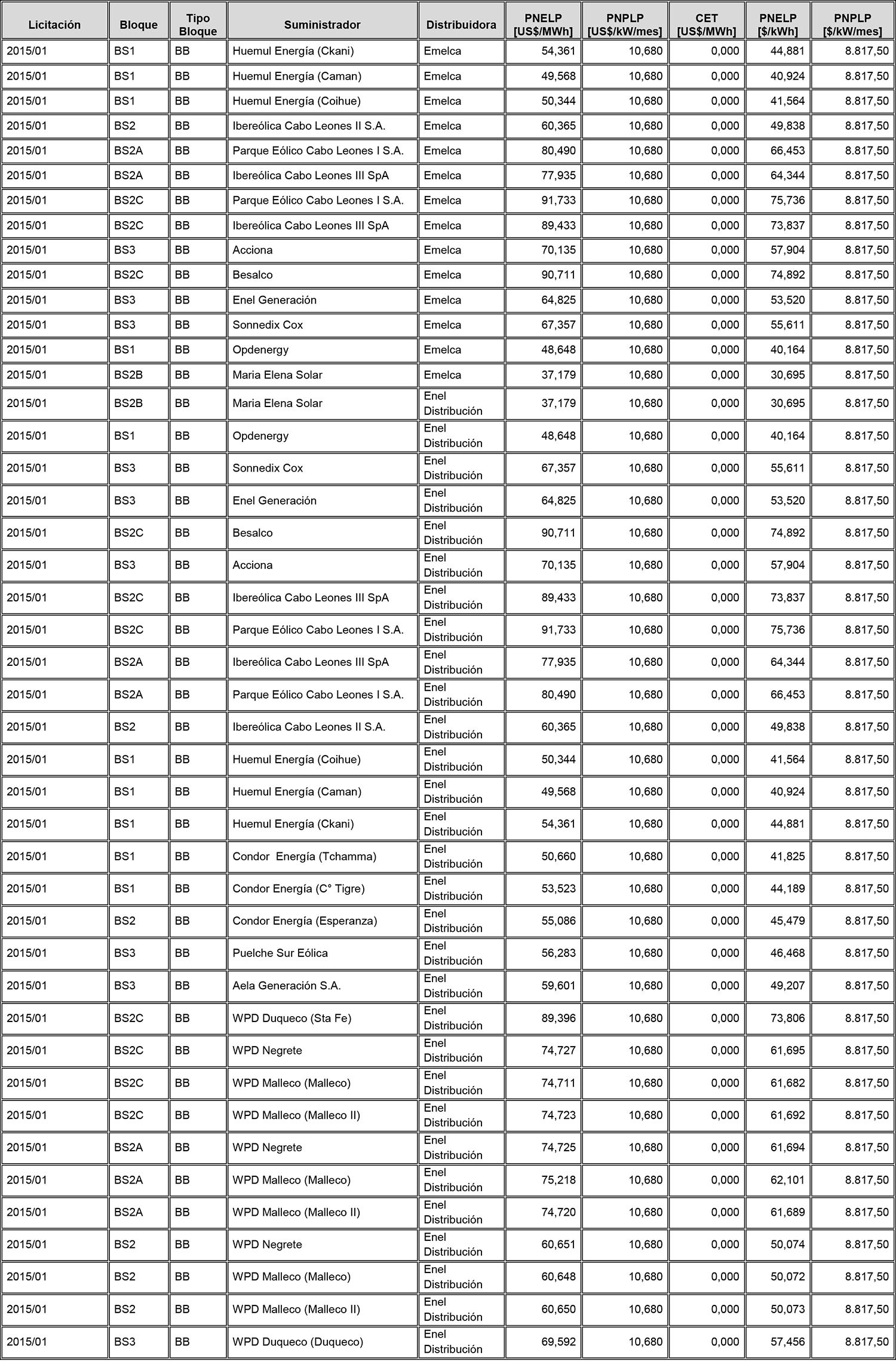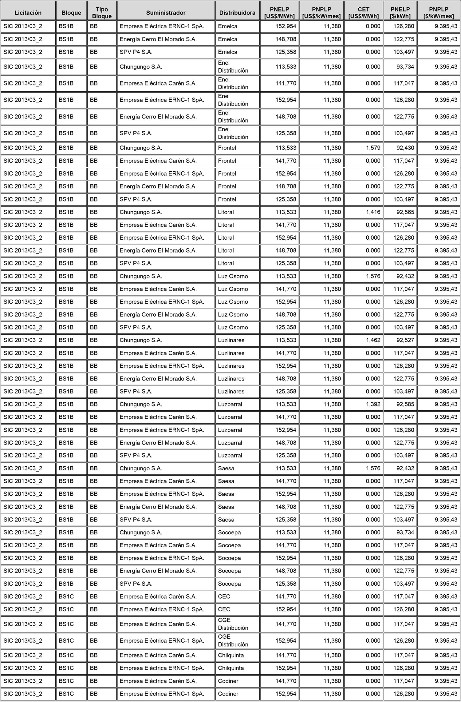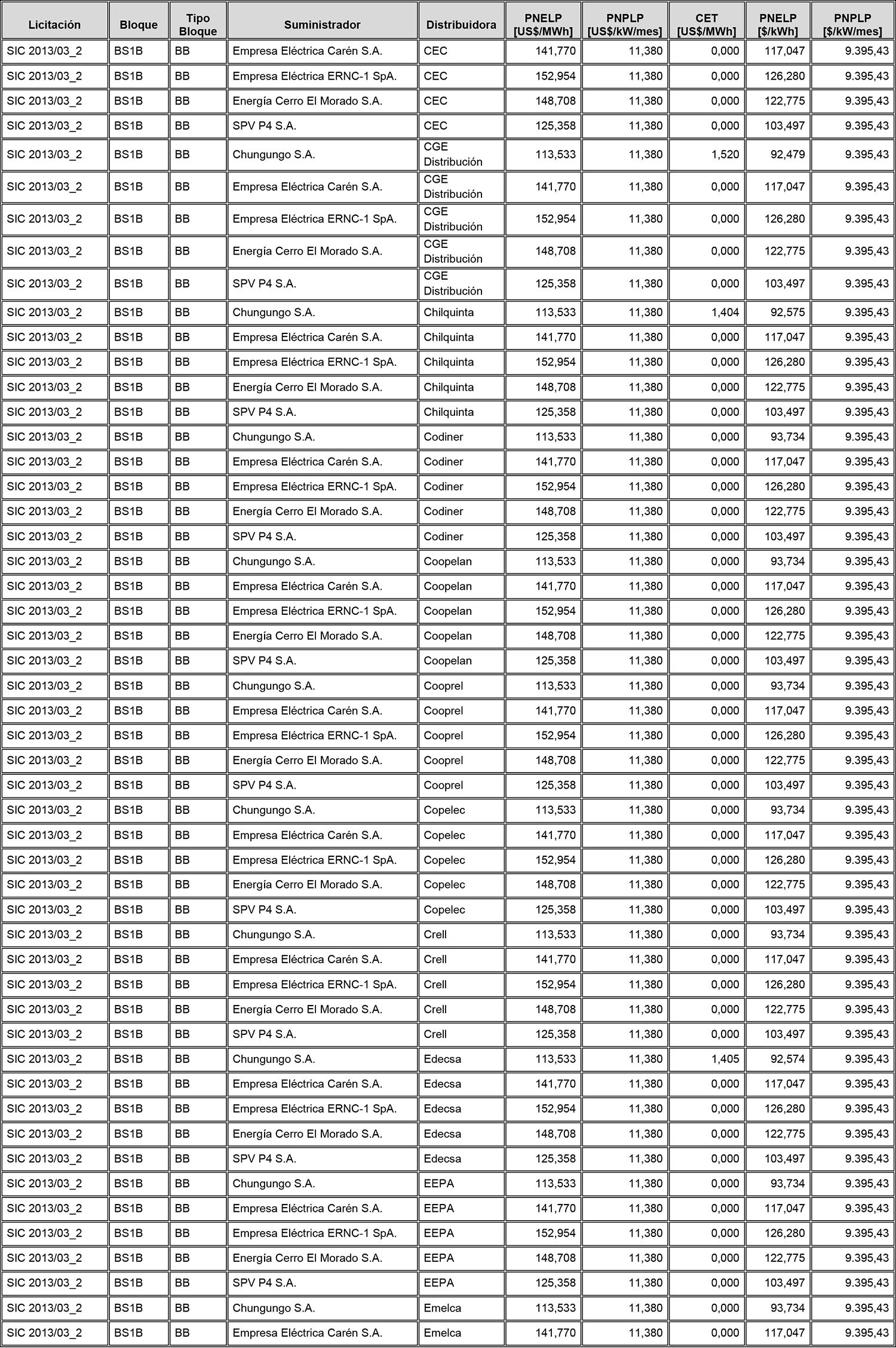 Los Precios de Nudo de Largo Plazo de energía y potencia, de acuerdo con lo señalado en los artículos 6° y 11° de la resolución exenta N° 703, y los descuentos del monto del Cargo Equivalente de Transmisión Final ("CET") en el precio total de energía de los contratos modificados de acuerdo a lo señalado en el artículo vigesimoquinto transitorio, letra E. número i., de la ley N° 20.936 y en la resolución exenta N° 7, son los que se indican en la siguiente tabla: