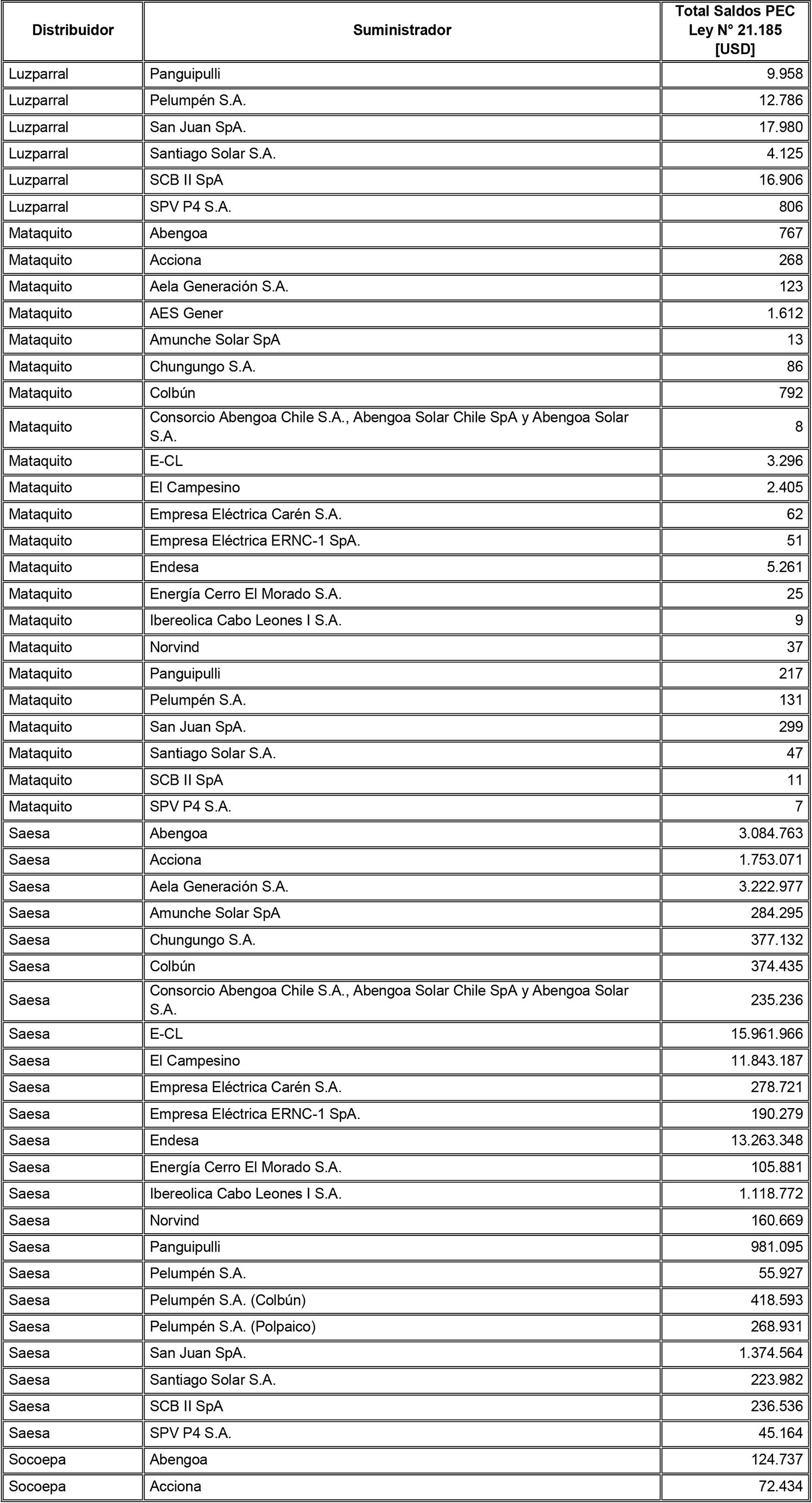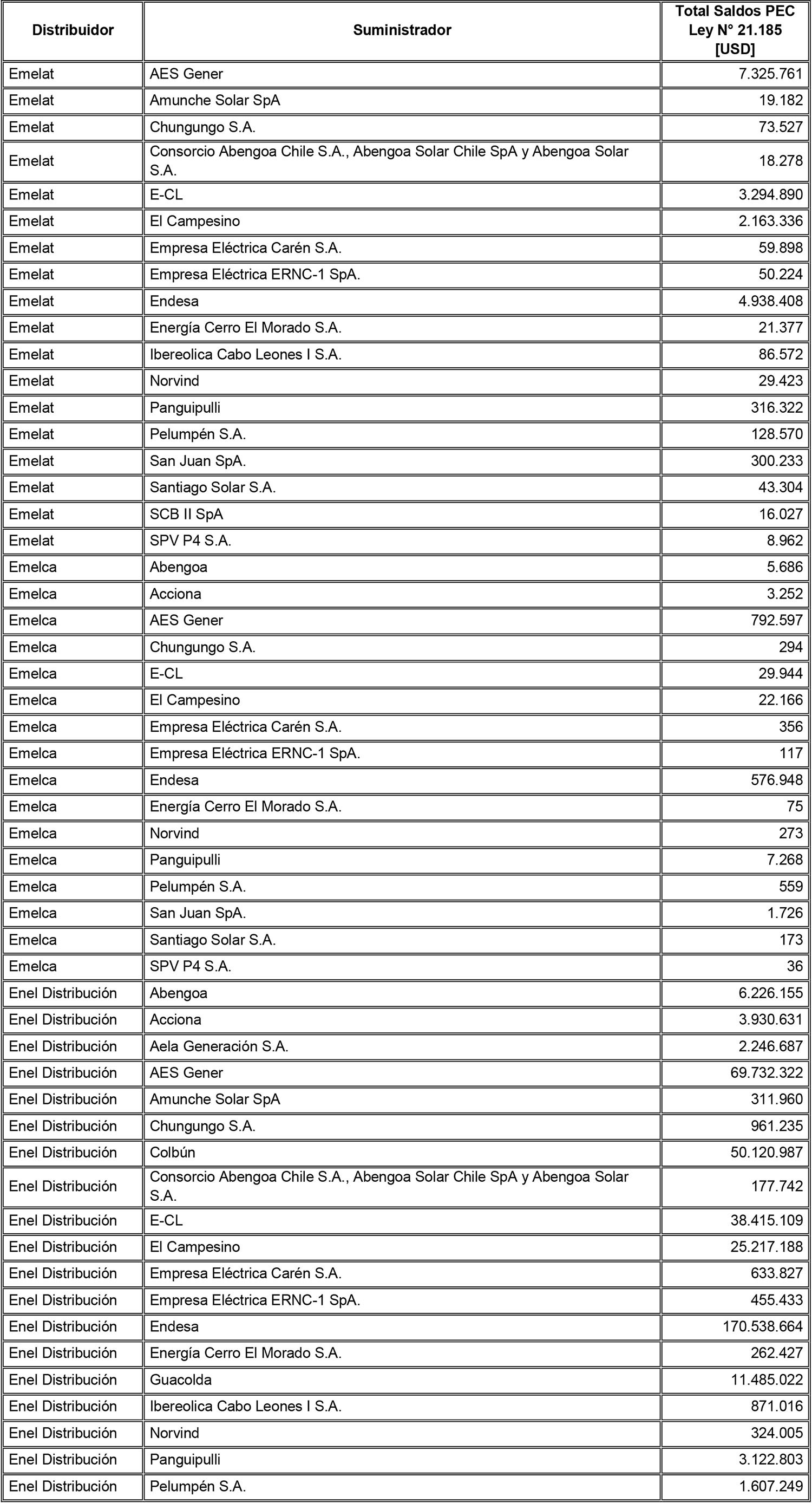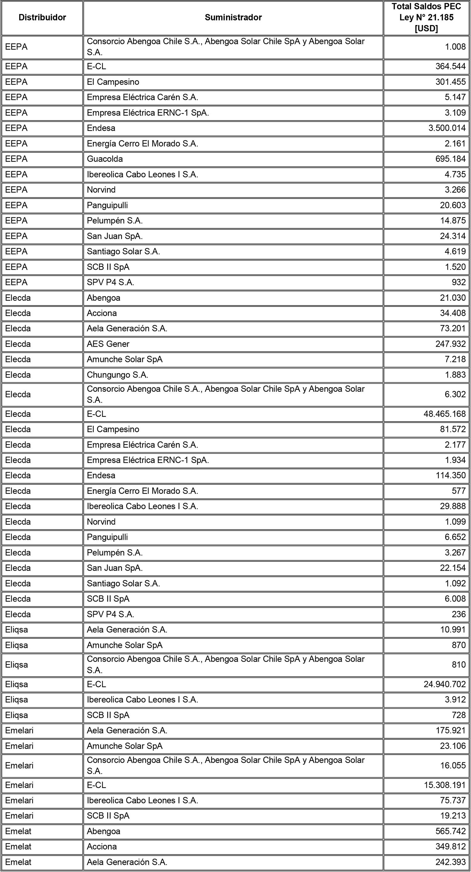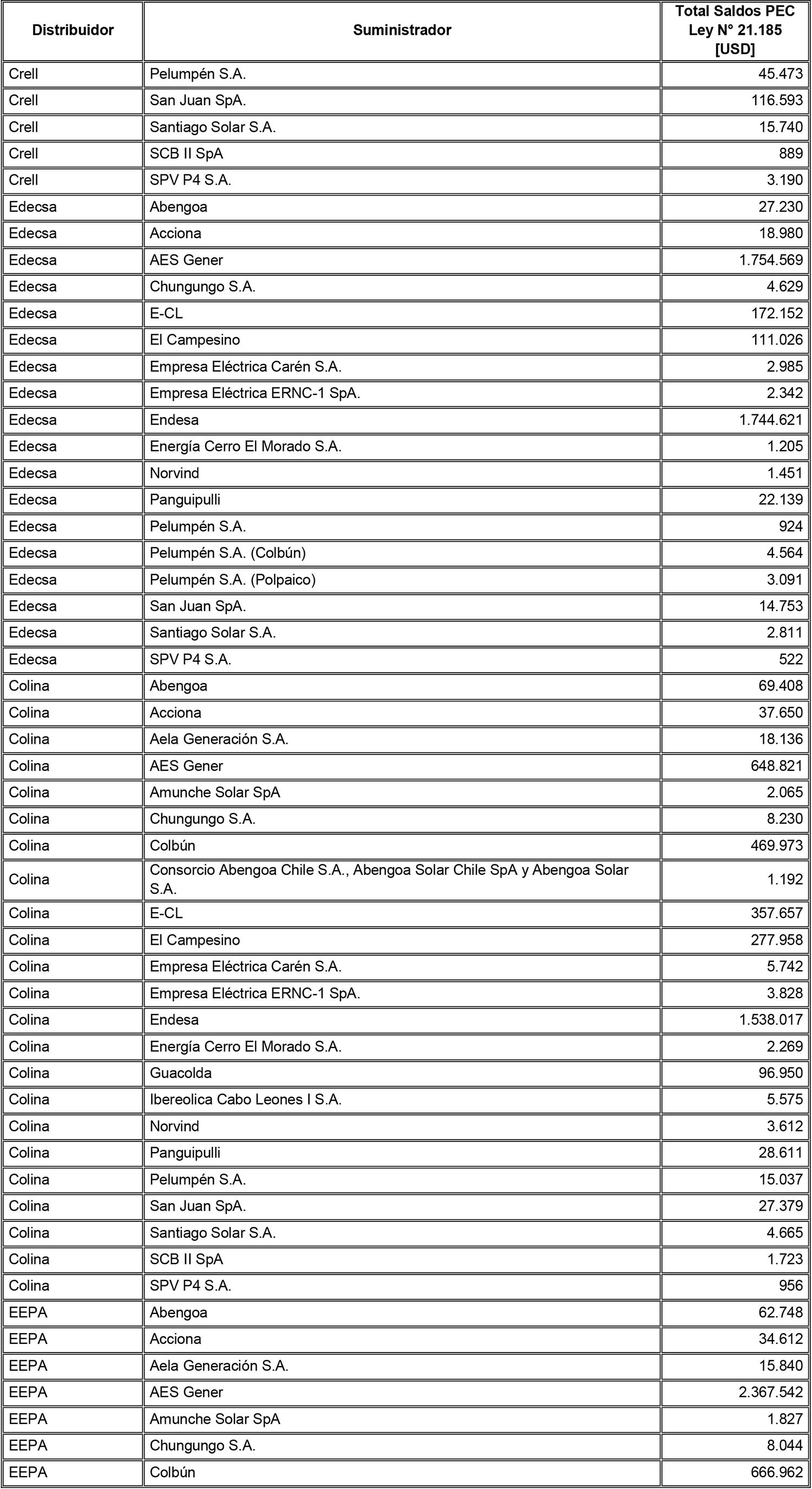 De acuerdo a lo señalado precedentemente, la siguiente tabla contiene los saldos antes mencionados del Sistema Eléctrico Nacional, identificando al suministrador acreedor de dichos saldos y la Distribuidora deudora correspondiente: