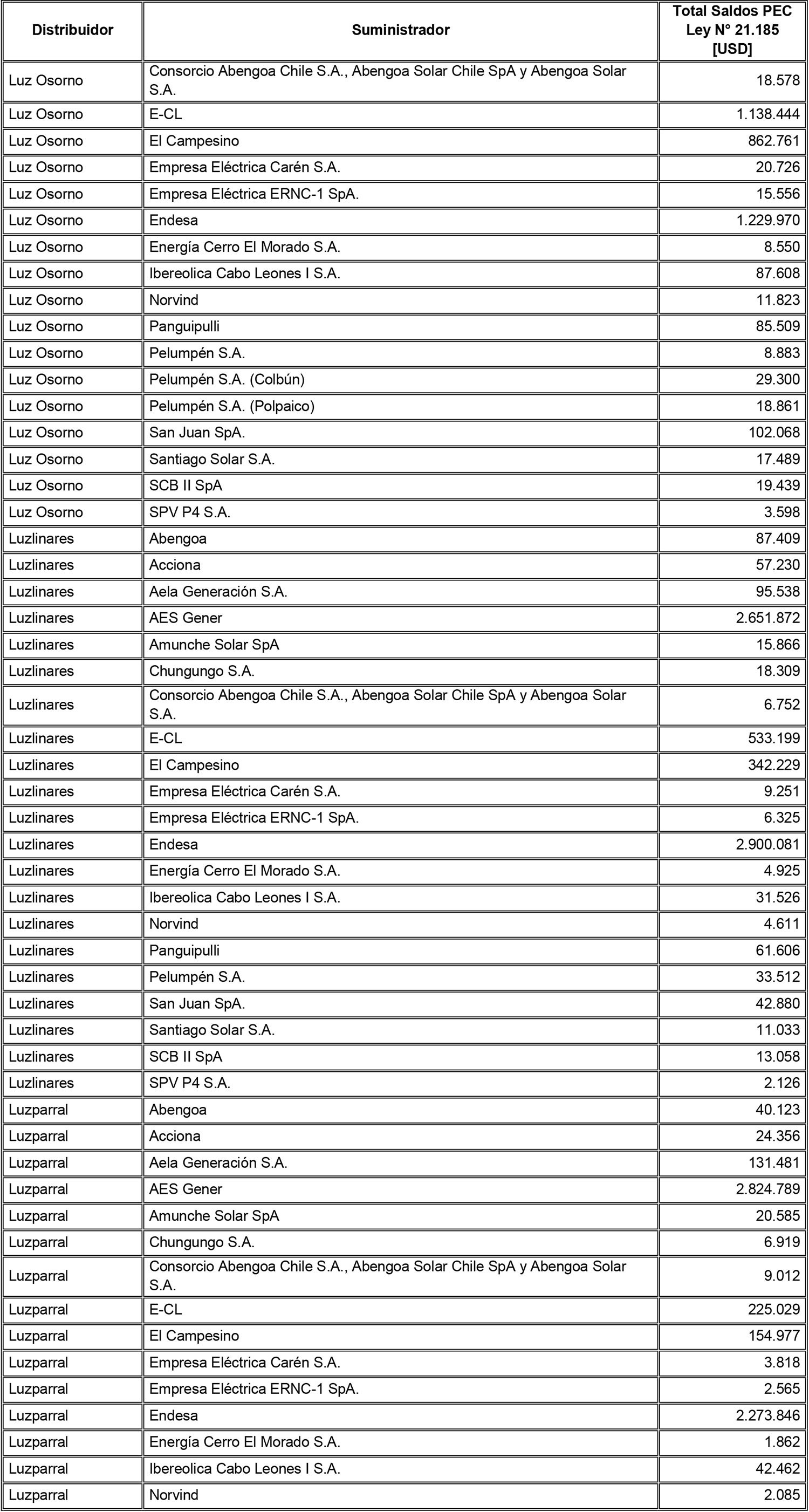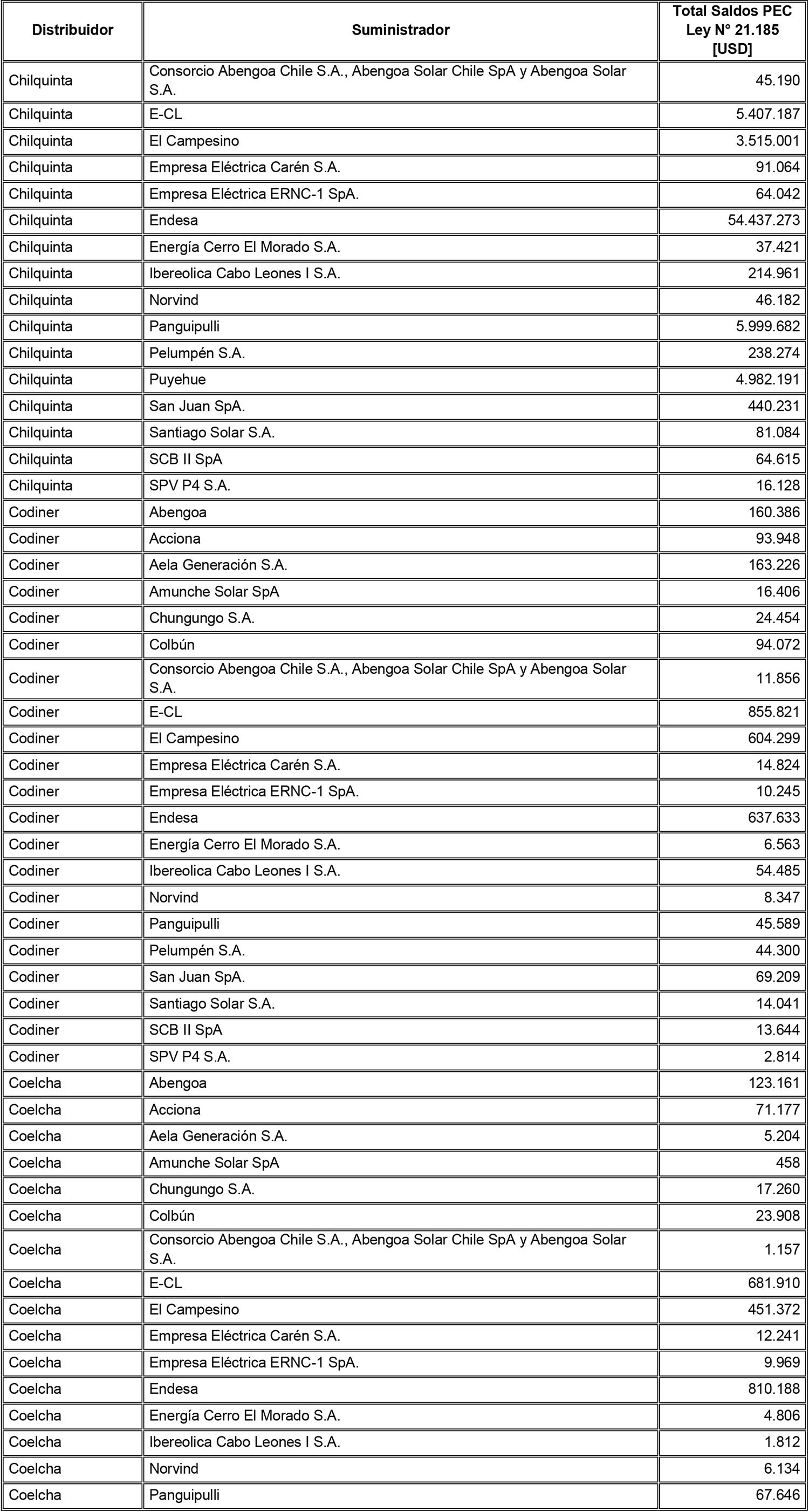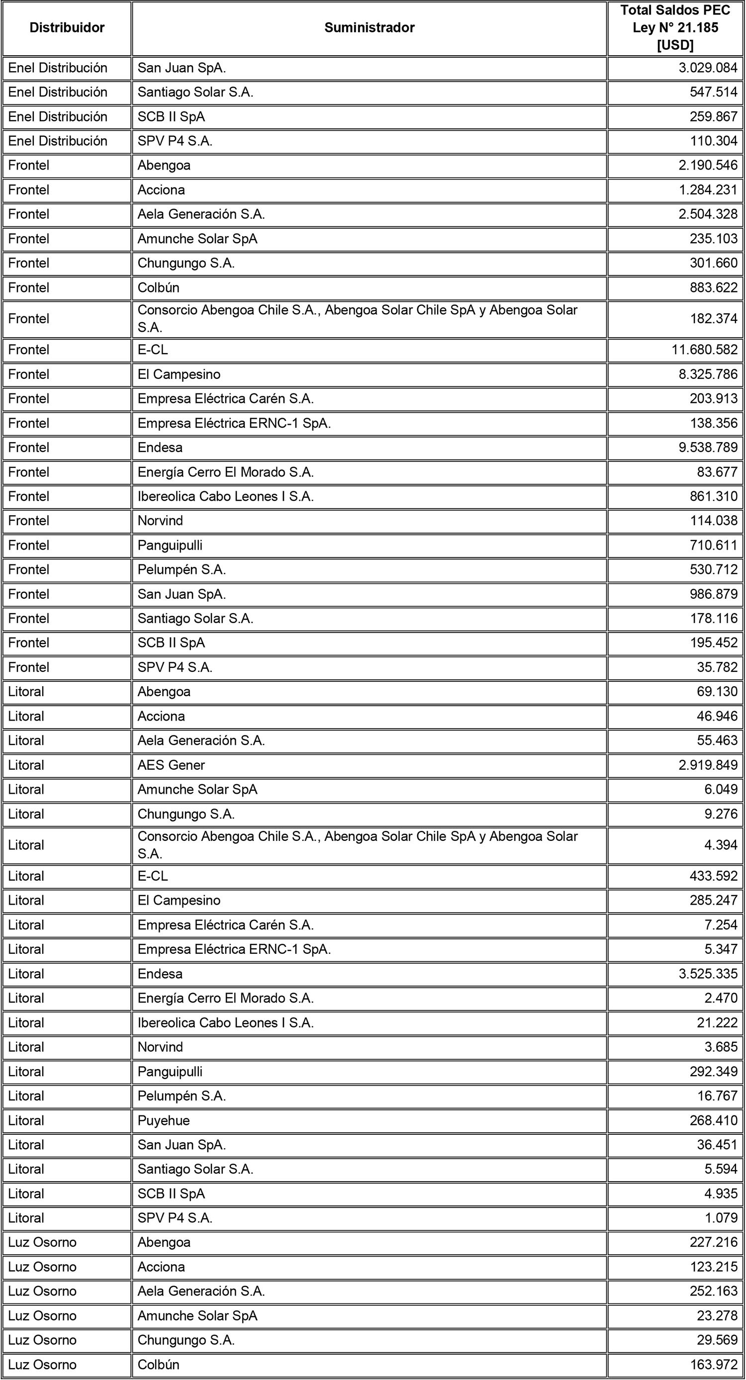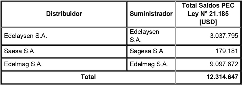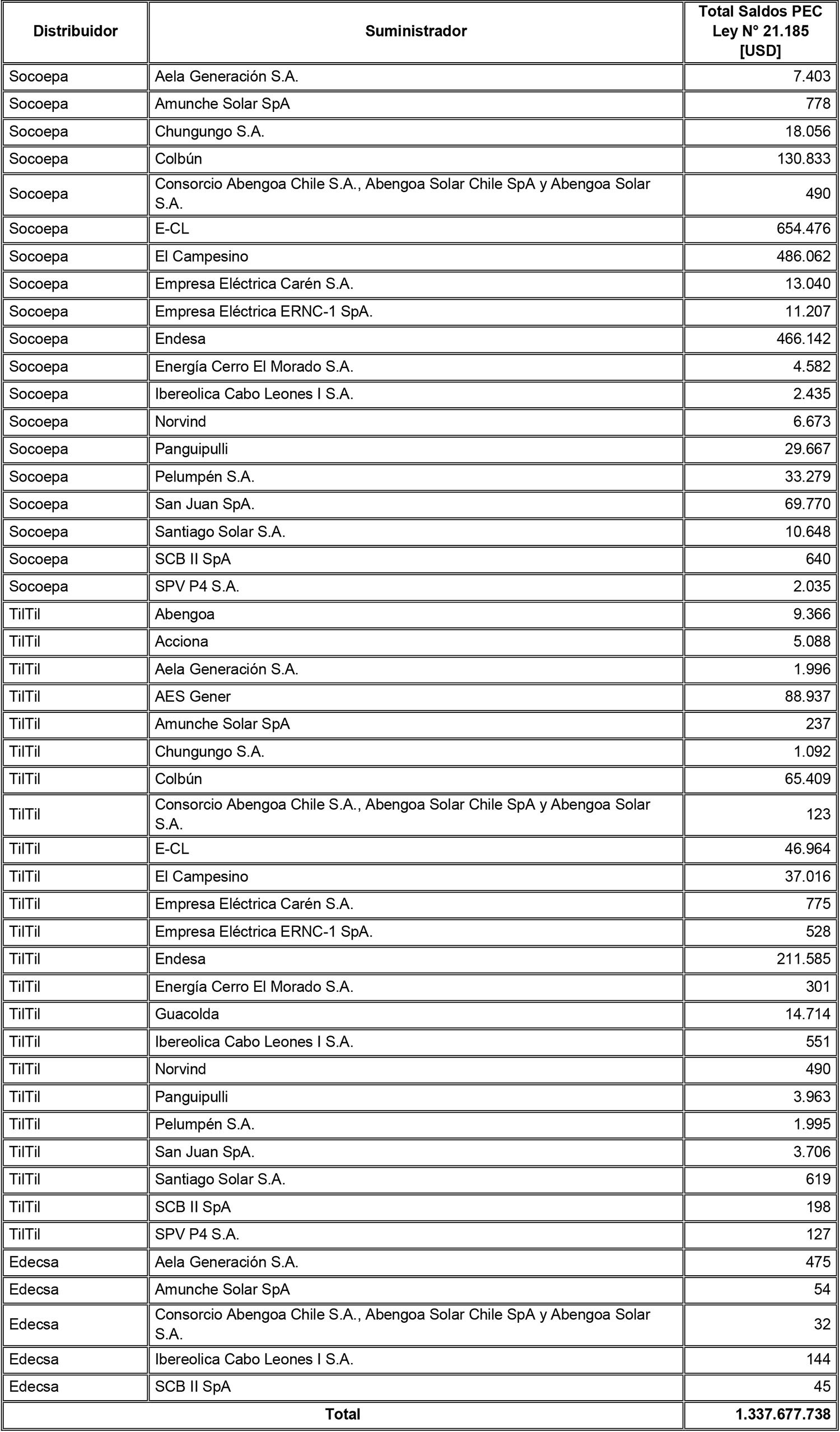 De acuerdo a lo señalado precedentemente, la siguiente tabla contiene los saldos antes mencionados del Sistema Eléctrico Nacional, identificando al suministrador acreedor de dichos saldos y la Distribuidora deudora correspondiente: