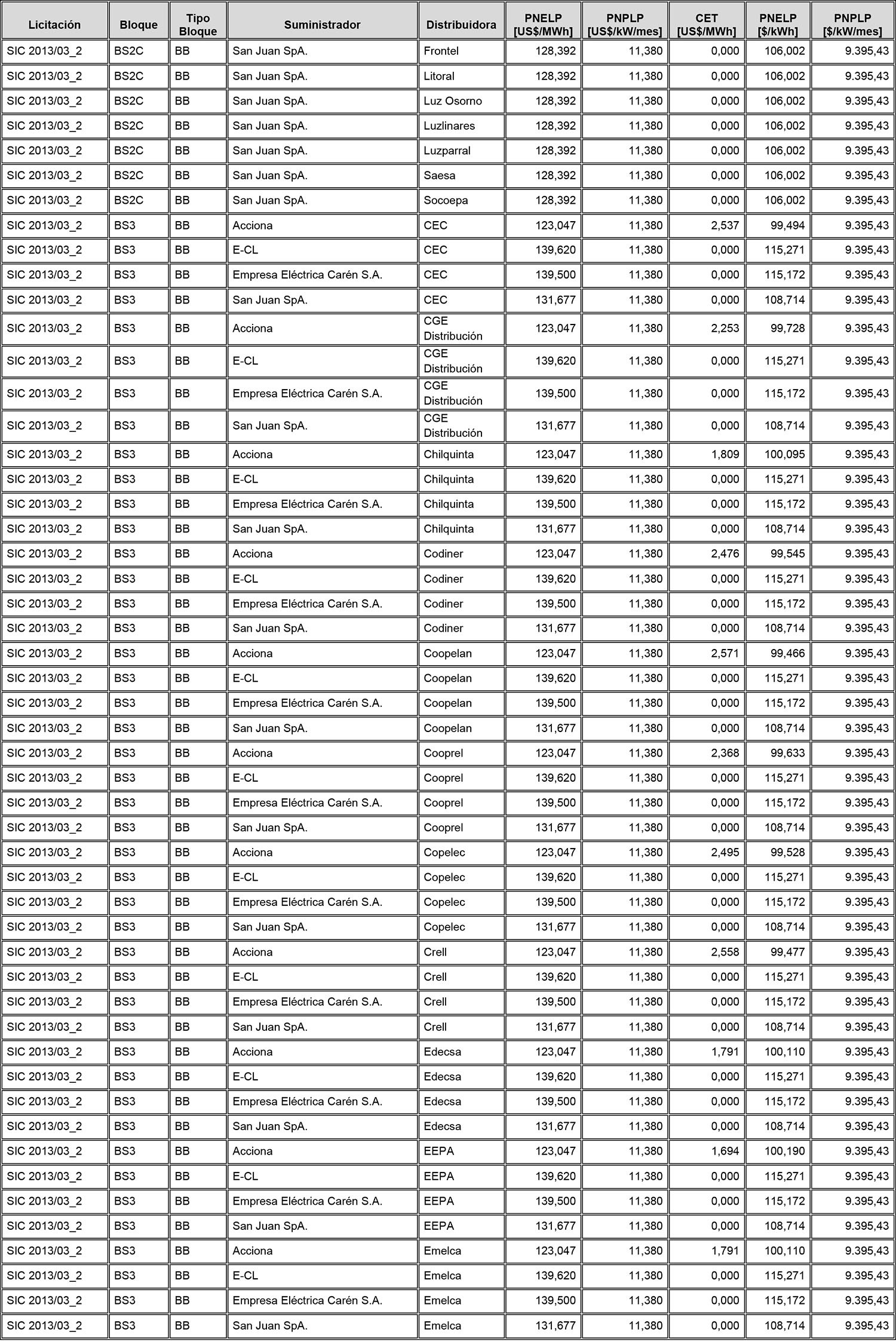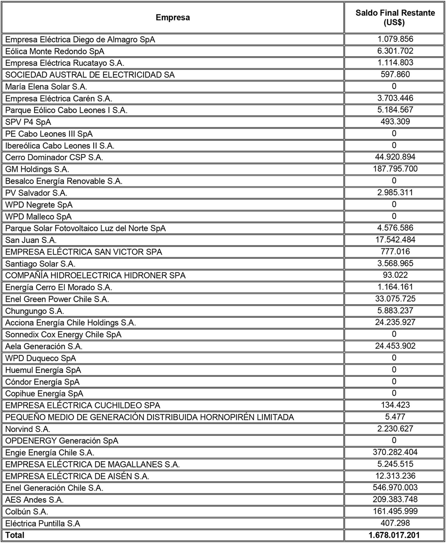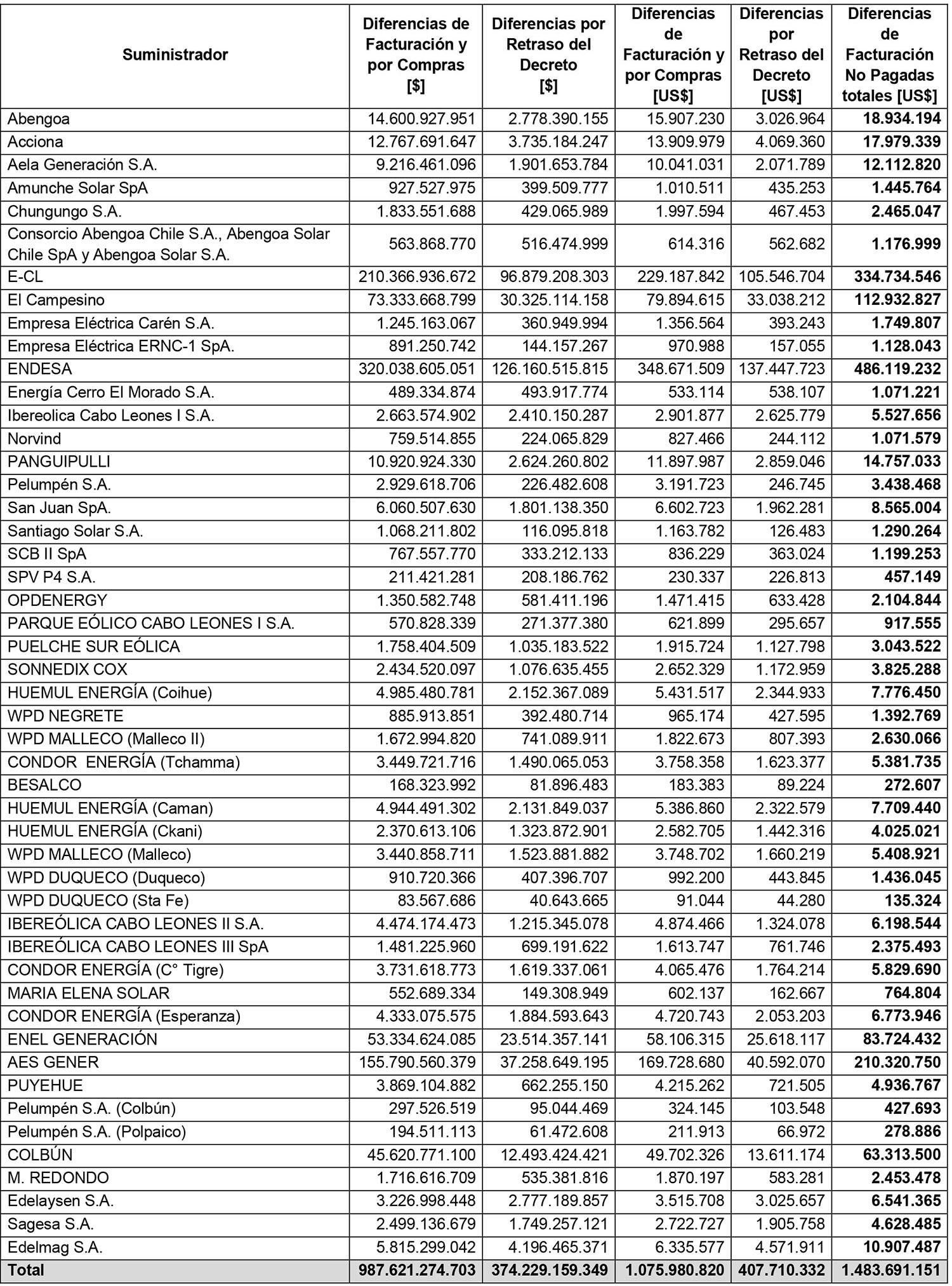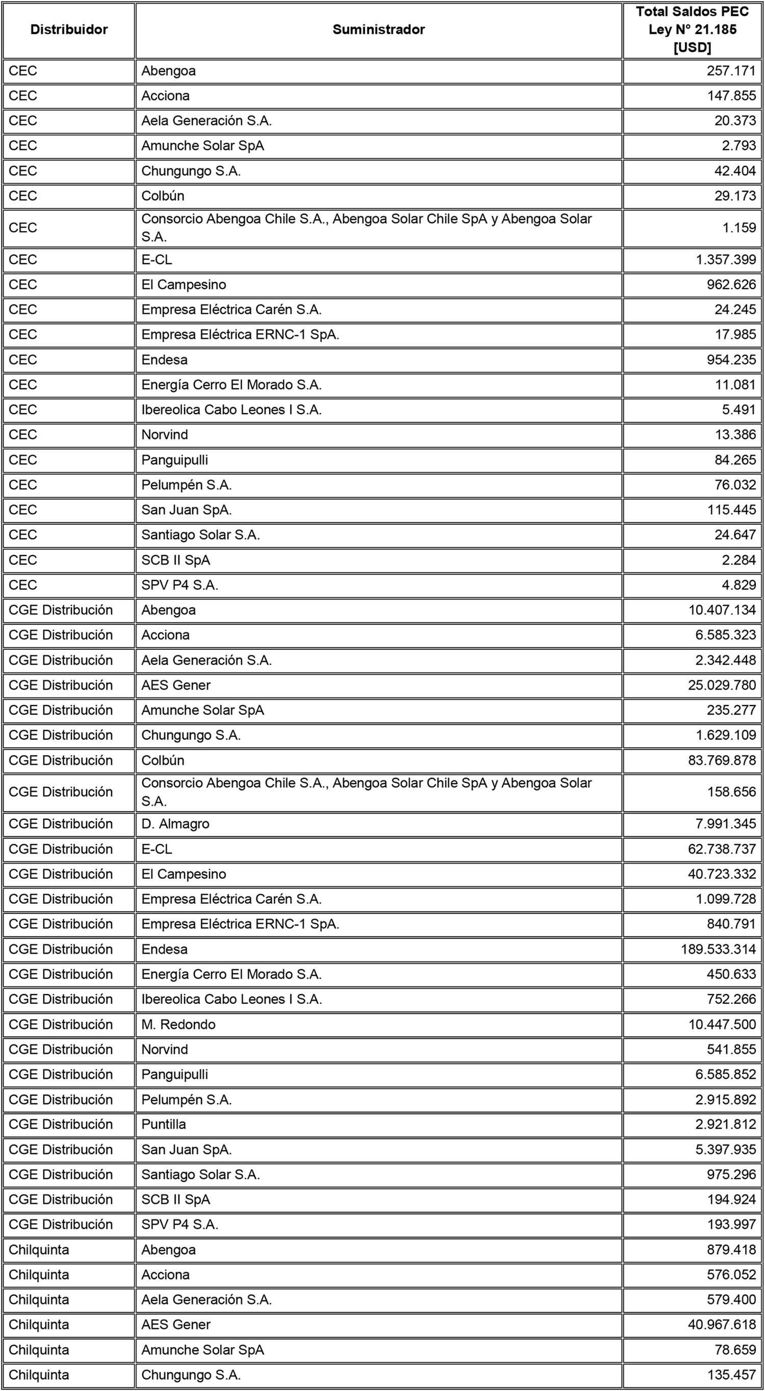 De acuerdo a lo señalado precedentemente, la siguiente tabla contiene los saldos antes mencionados del Sistema Eléctrico Nacional, identificando al suministrador acreedor de dichos saldos y la Distribuidora deudora correspondiente: