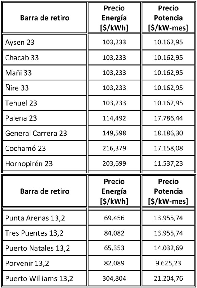 En los sistemas medianos de Punta Arenas, Puerto Natales, Porvenir y Puerto Williams y de Aysén, Palena y General Carrera, los precios de nudo de energía y potencia de punta que se aplicarán a los suministros servidos en la barra de retiro para el nivel de tensión que se indica, corresponden a los indicados en la Tabla 2.