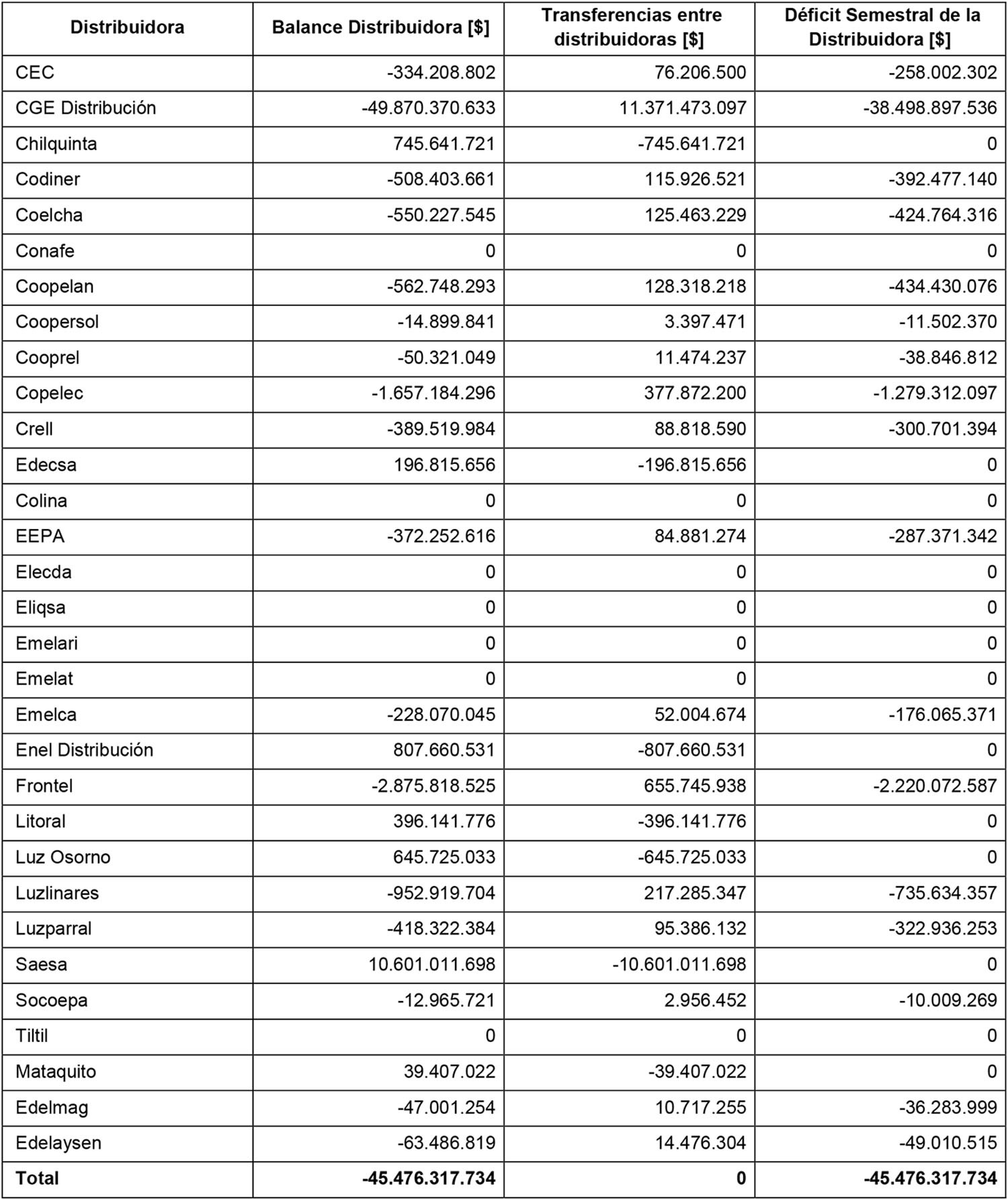 Conforme a lo anterior, en la tabla siguiente se detalla el resultado del Balance de la Distribuidora, las transferencias entre Distribuidoras y el Déficit Semestral de la Distribuidora resultante de tal ejercicio.