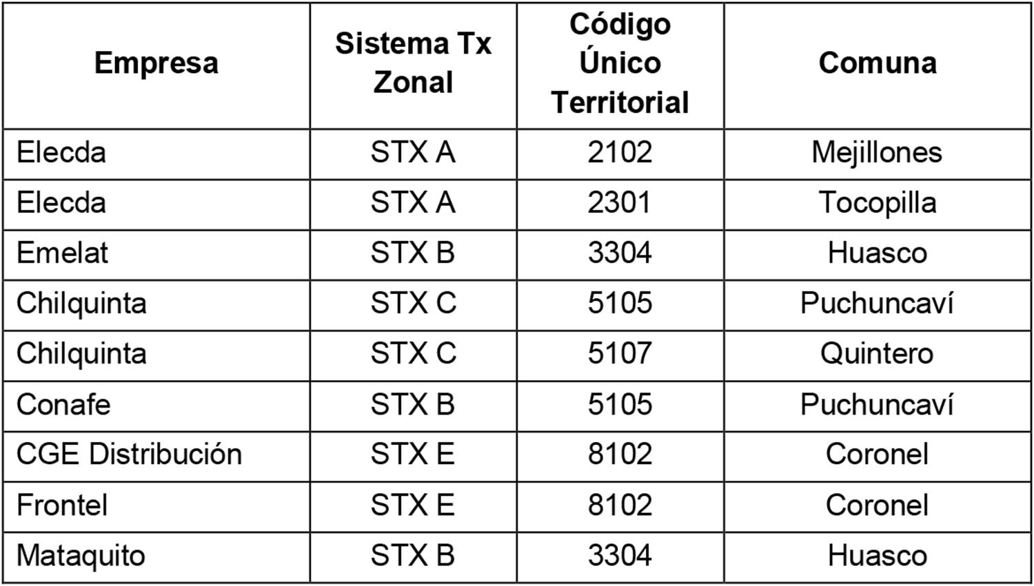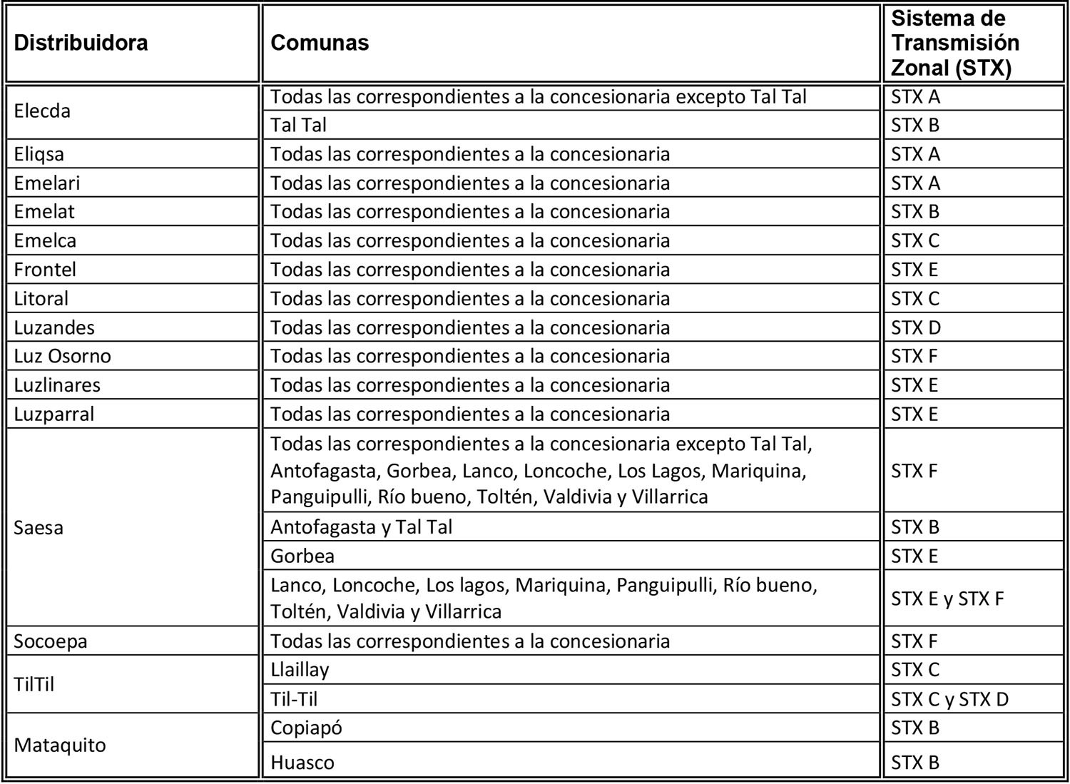 * Todas aquellas comunas que no se encuentren individualizadas en la tabla y que son suministradas por la respectiva Concesionaria en el sistema de transmisión zonal indicado.