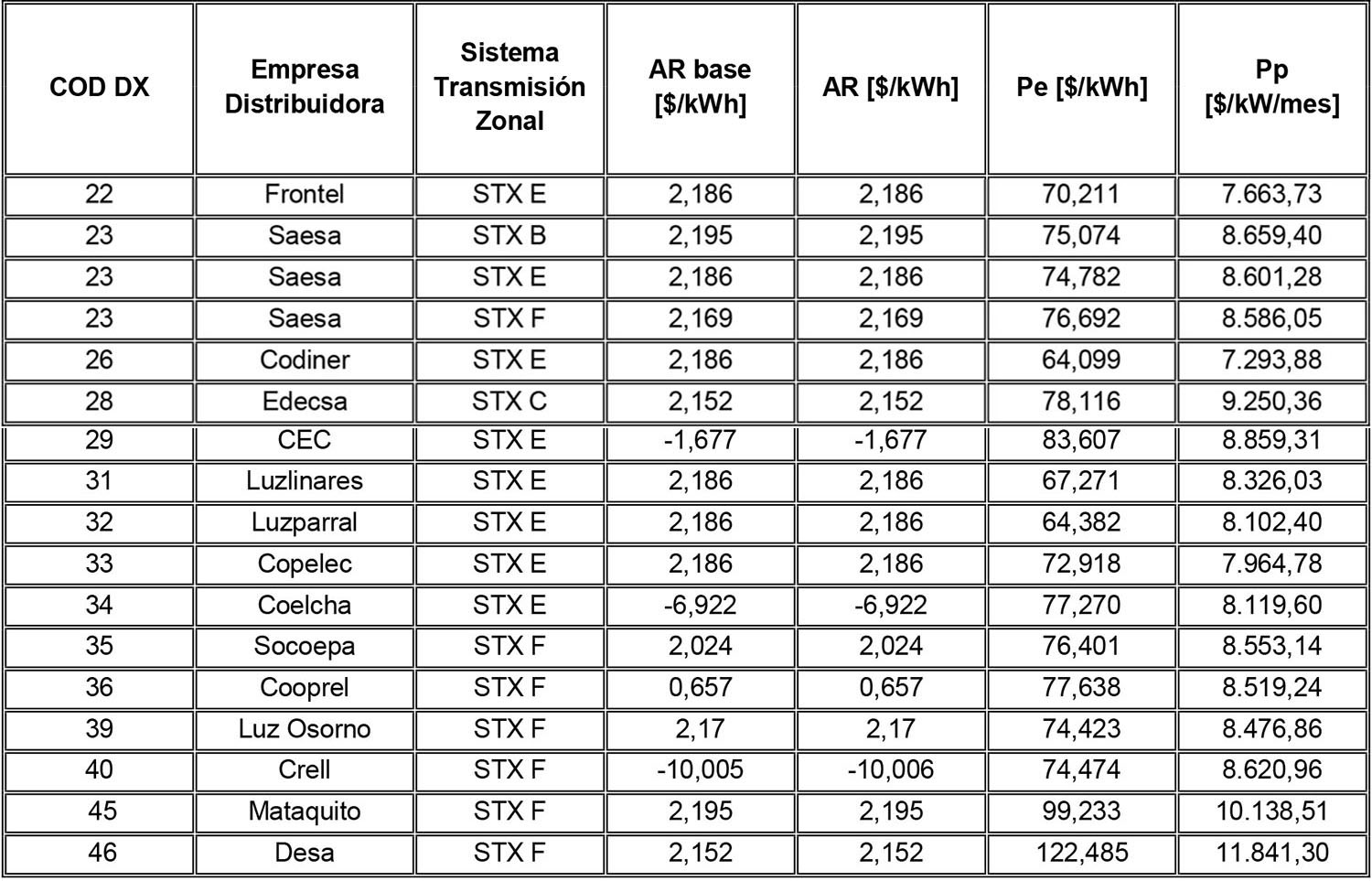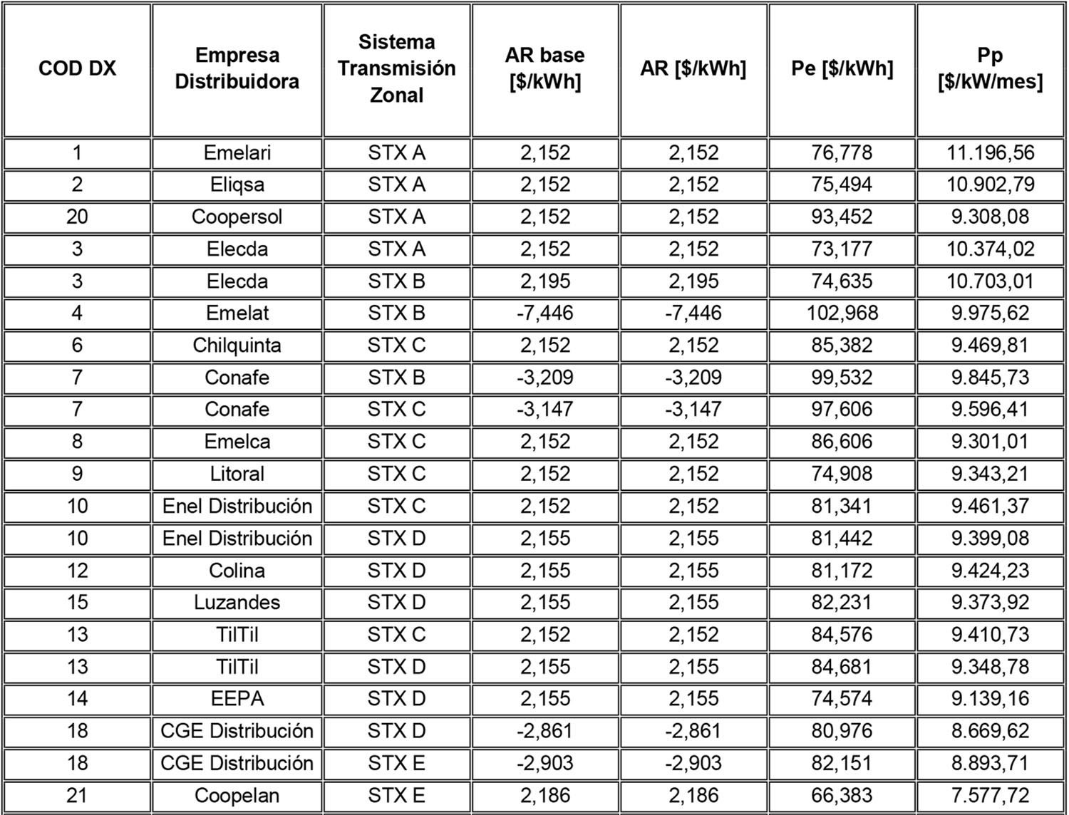 Los valores que las Distribuidoras podrán traspasar a sus Clientes Regulados se indican en la Tabla 11, para cada Distribuidora y sector de nudo asociado al sistema de transmisión zonal en donde se ubica el cliente respectivo, considerando la siguiente clasificación para las empresas distribuidoras presentes en más de un sector de nudo: