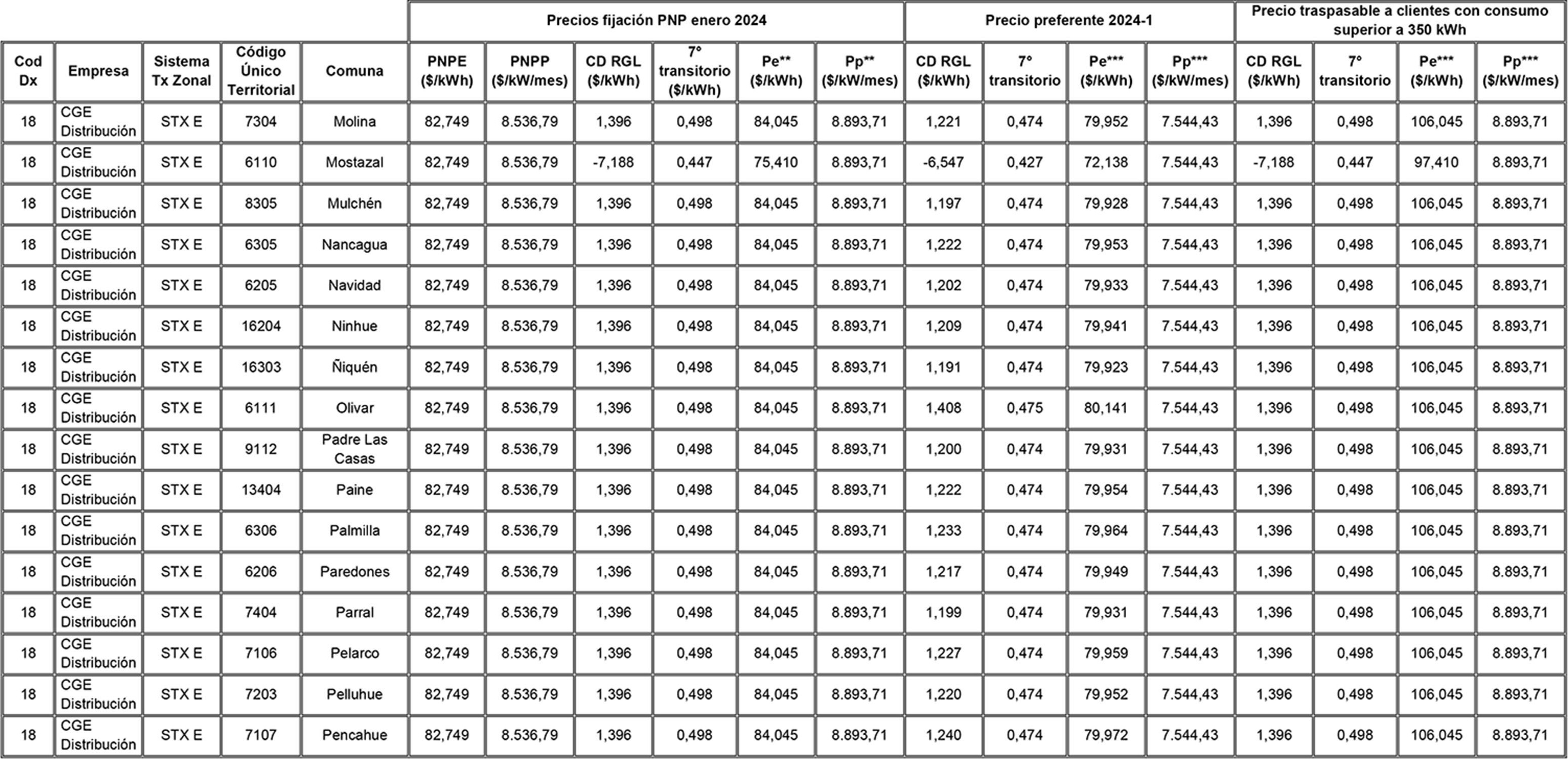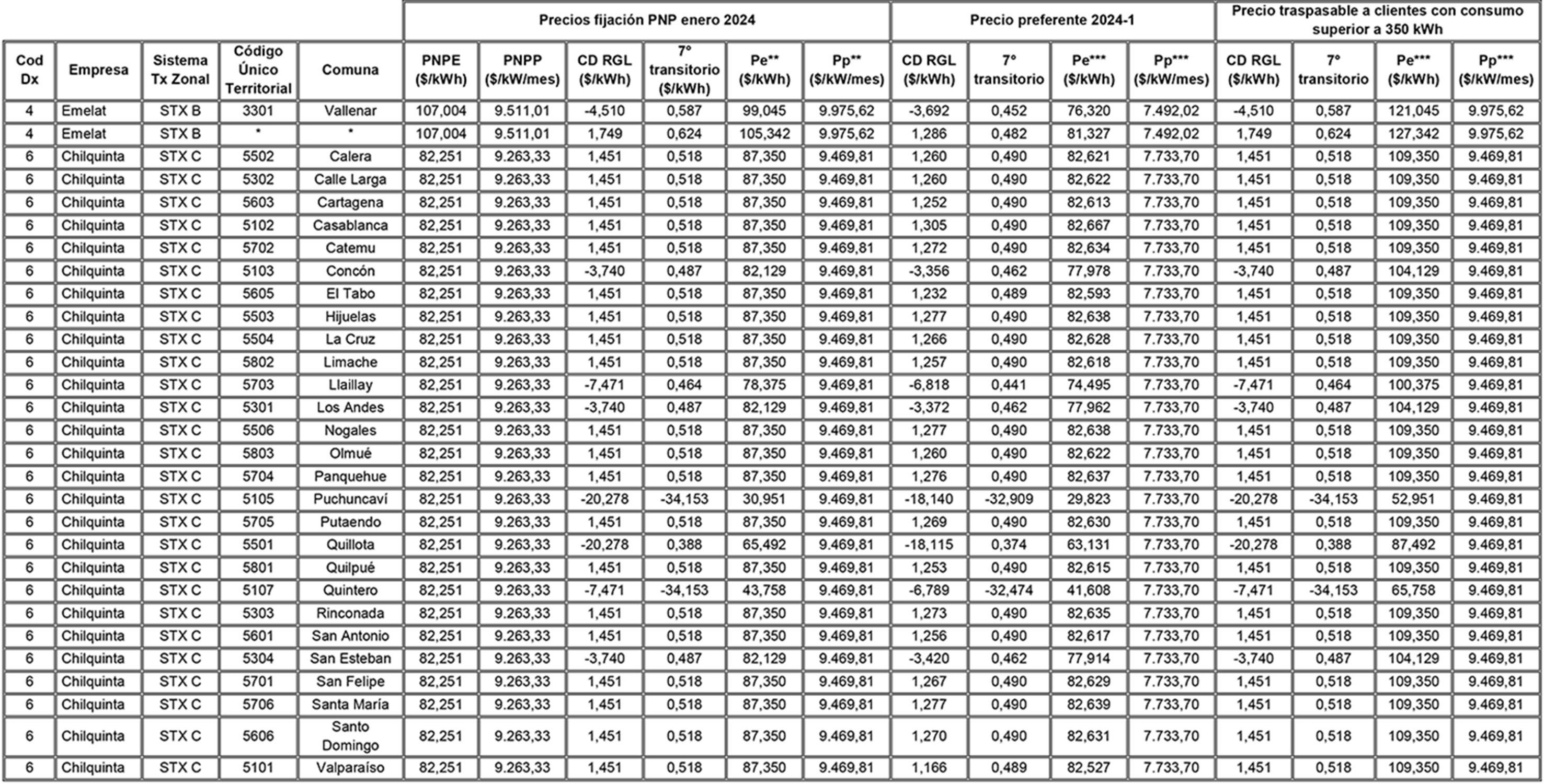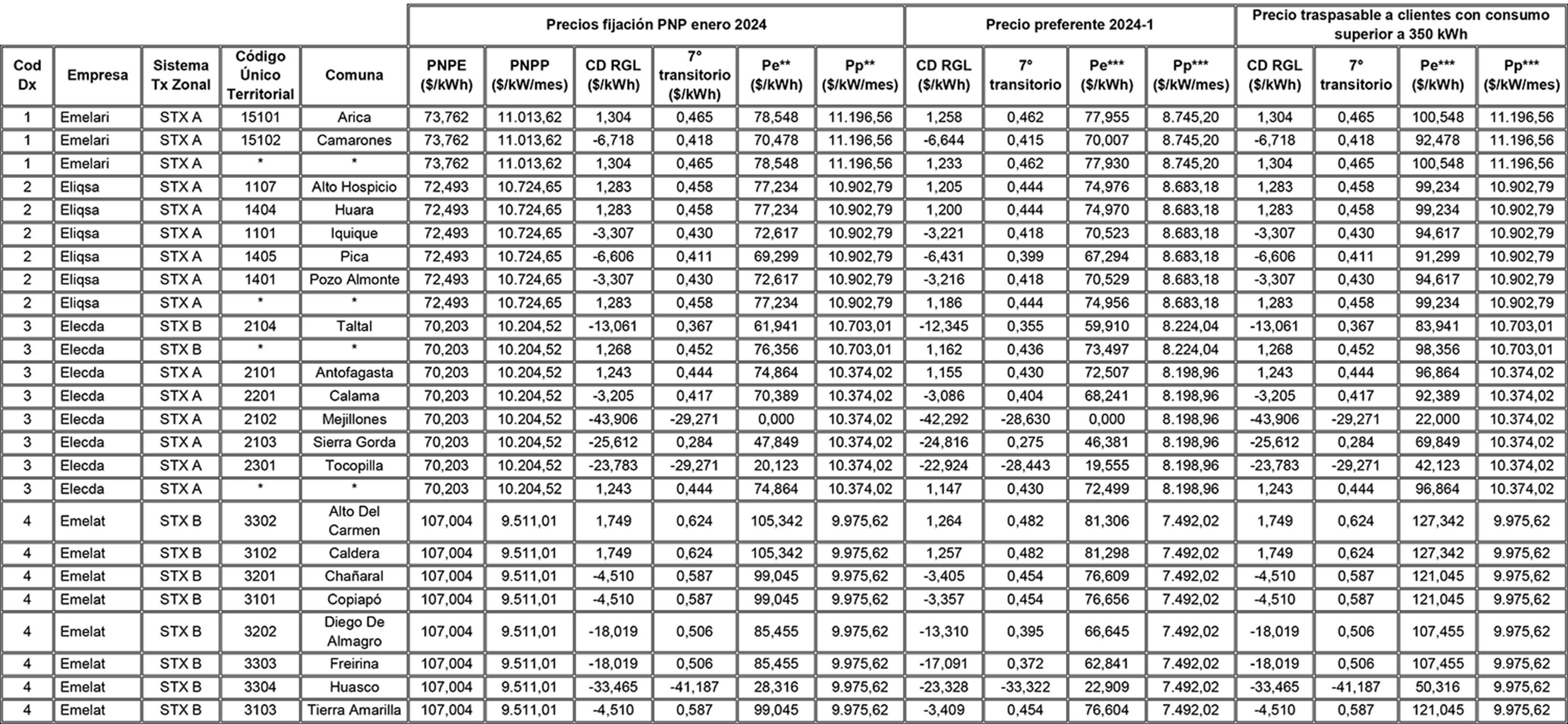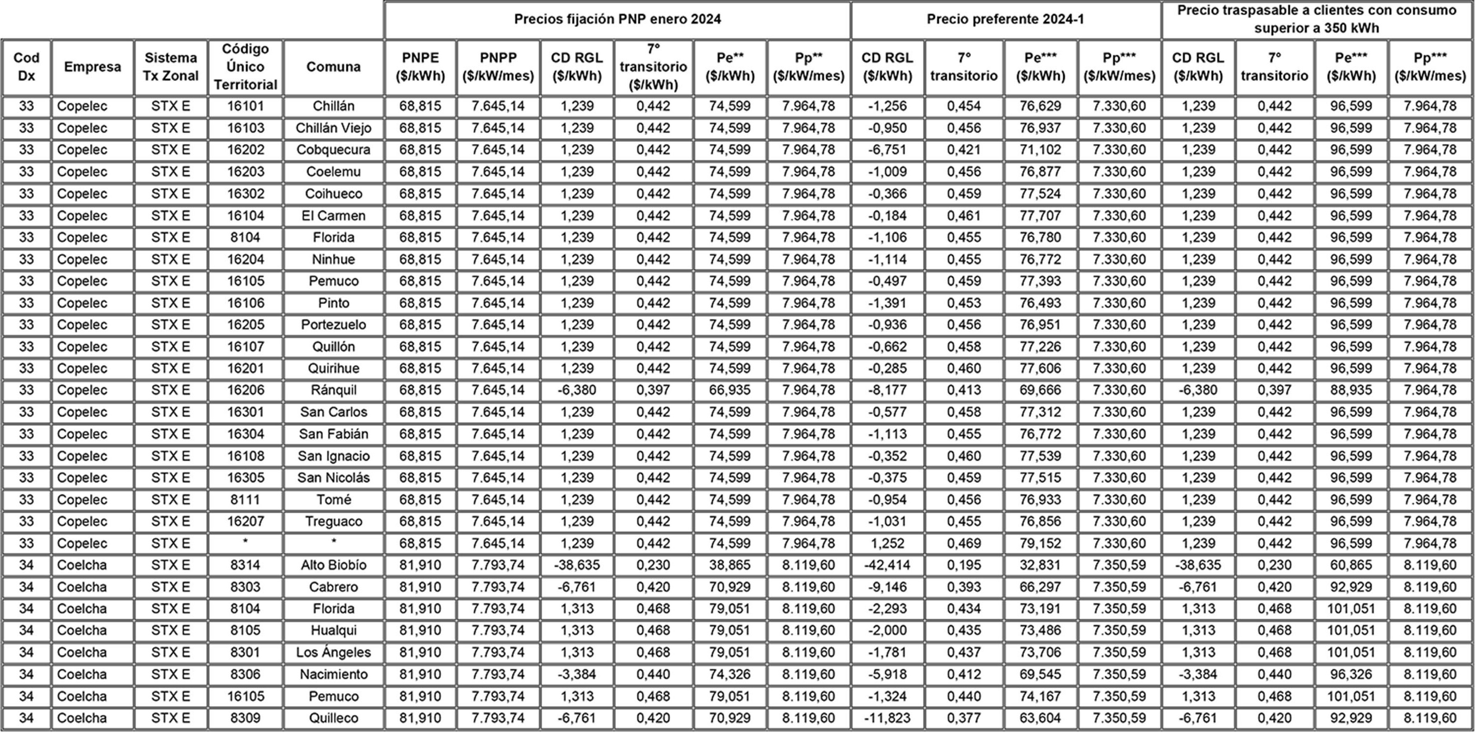 PNPP : Precio de nudo de la potencia de punta promedio para todas las subestaciones del sistema de transmisión nacional de generación-transporte de la Distribuidora, en [$/kW/mes]. El PNPP a ser utilizado para la opción tarifaria BT1b, señalada en el decreto N° 5T/2024, para clientes a quienes se deba traspasar el Precio Preferente 2024-1, corresponderá al Pp traspasable a esos clientes, dividido en las pérdidas zonales de potencia utilizadas para calcular las tarifas de la presente fijación, contenida en la hoja "STx" del archivo "Modelo PNP enero 2024.xlsm", disponible en el siguiente link www.cne.cl.