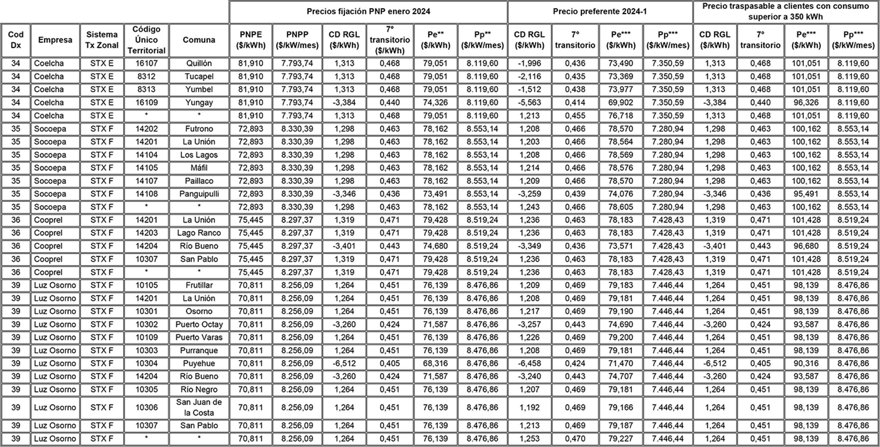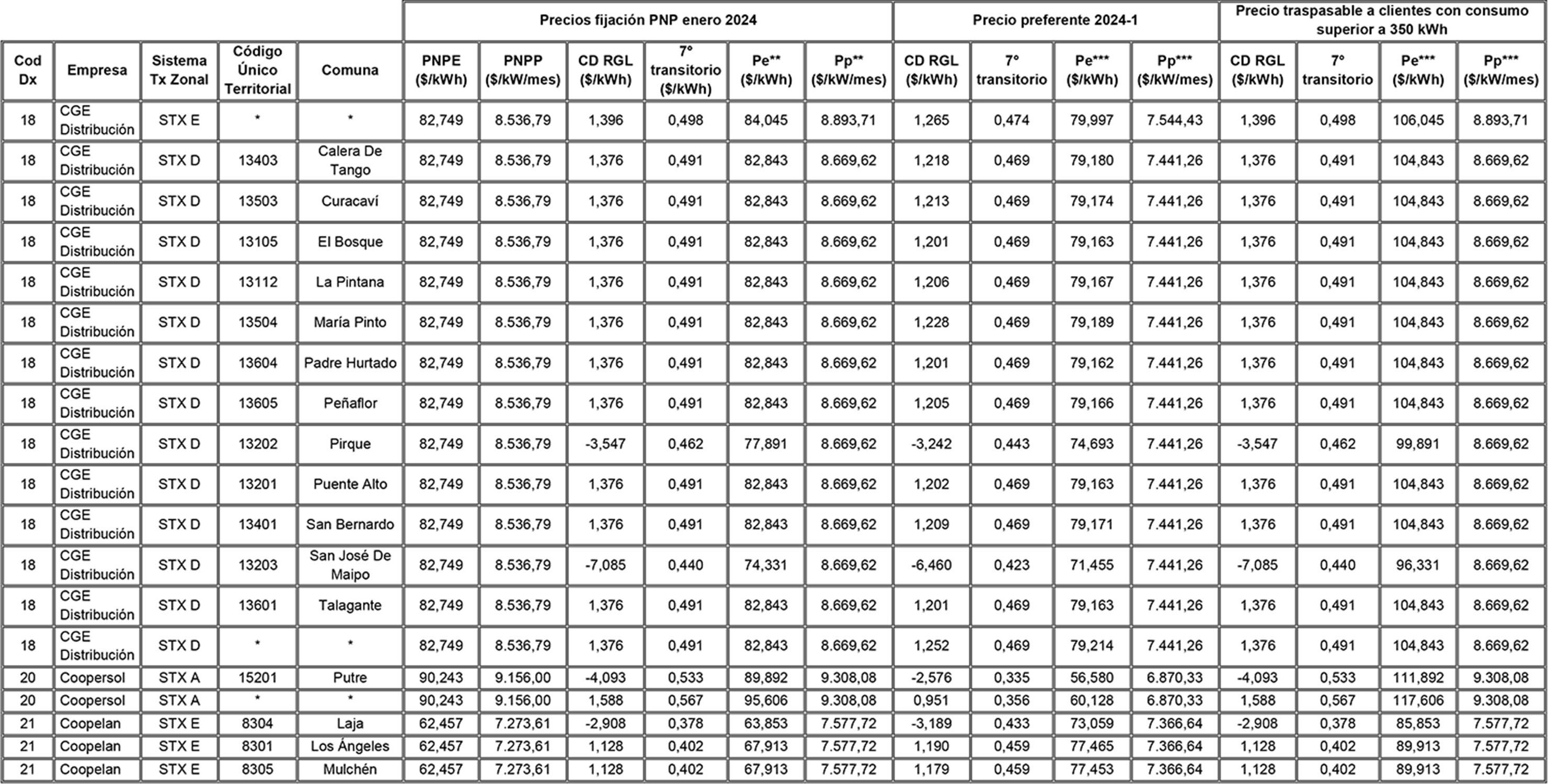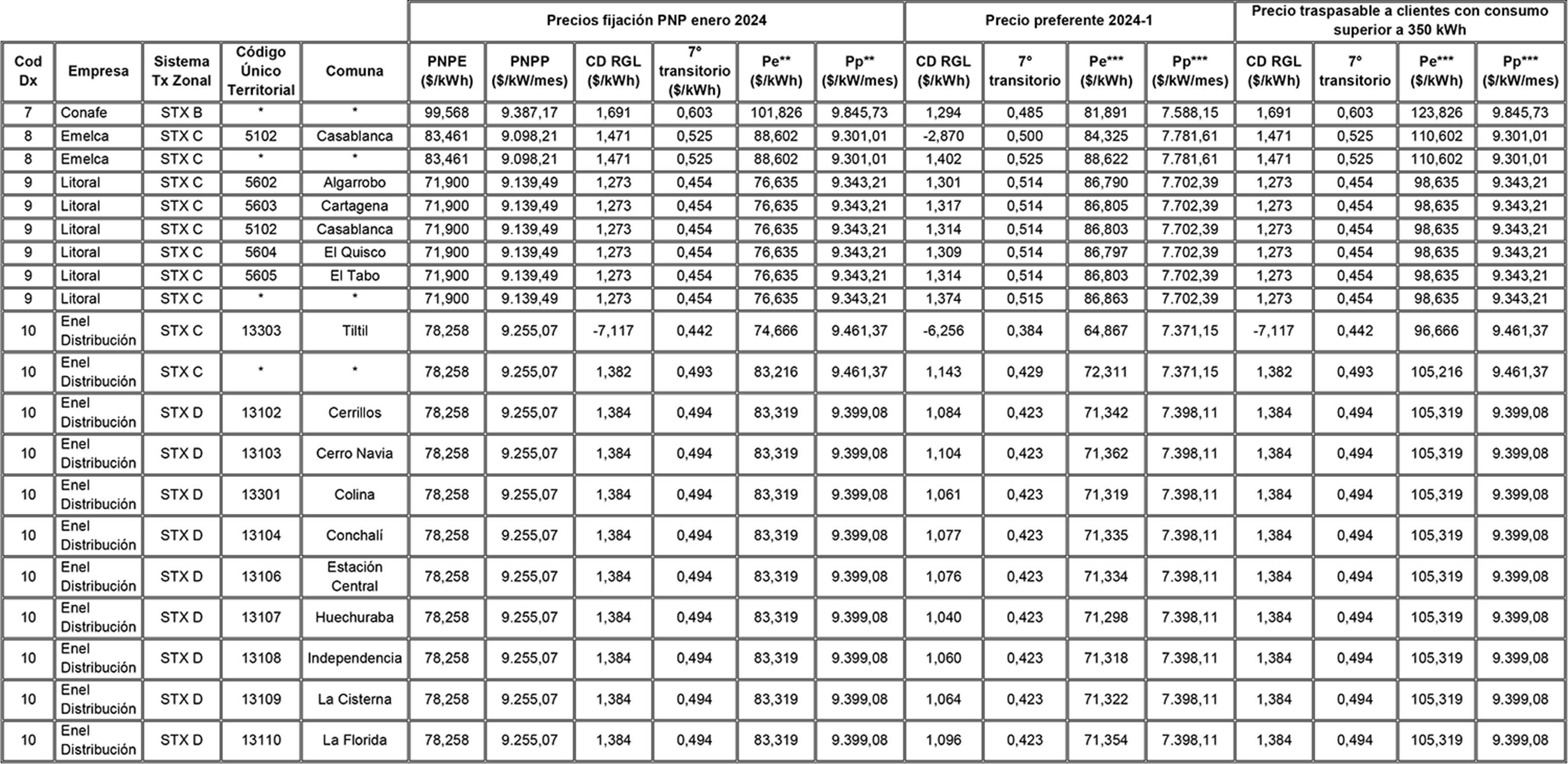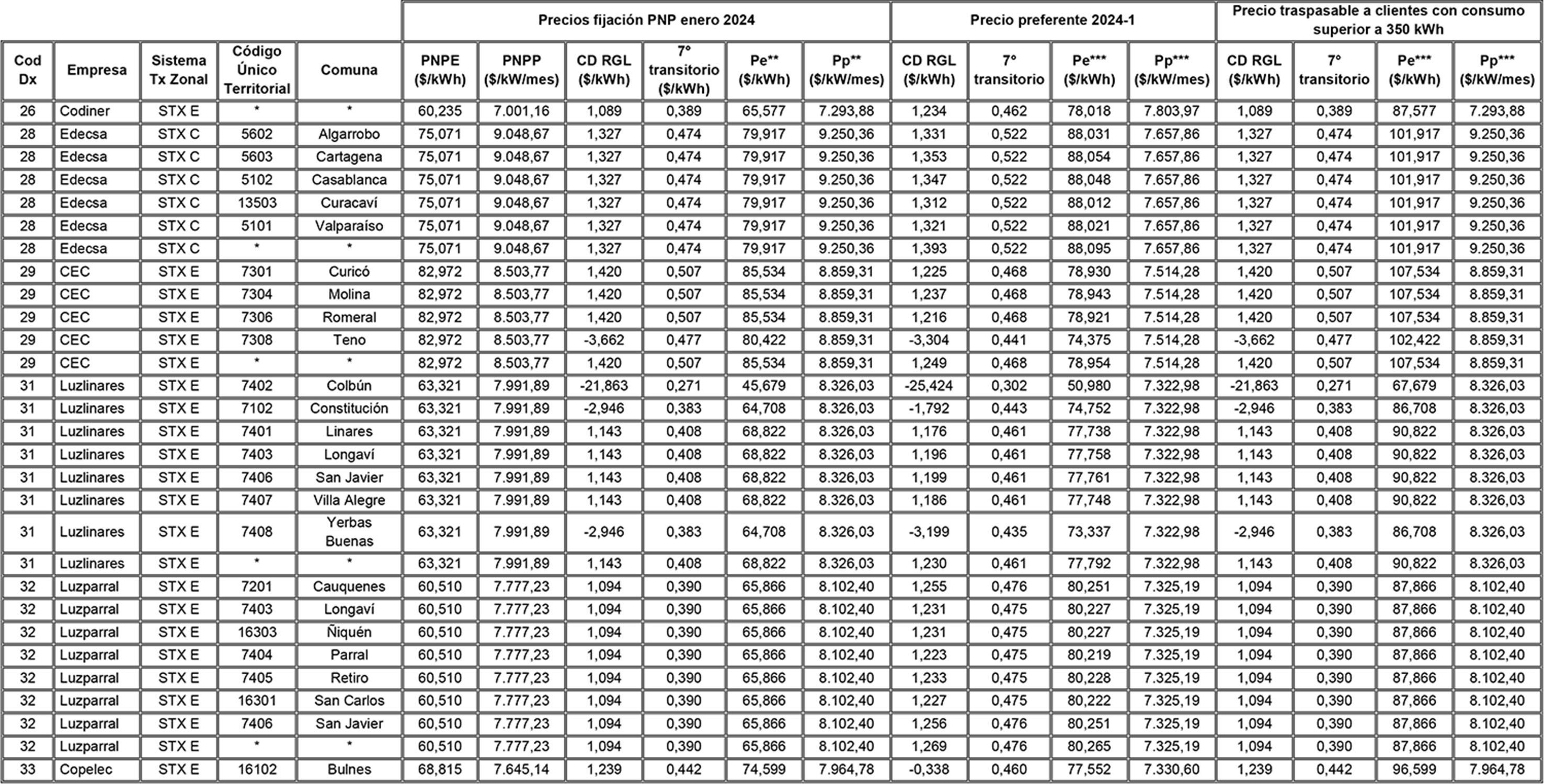 *Todas aquellas comunas que no se encuentren individualizadas en la tabla y que son suministradas por la respectiva Concesionaria en el sistema de transmisión zonal indicado.