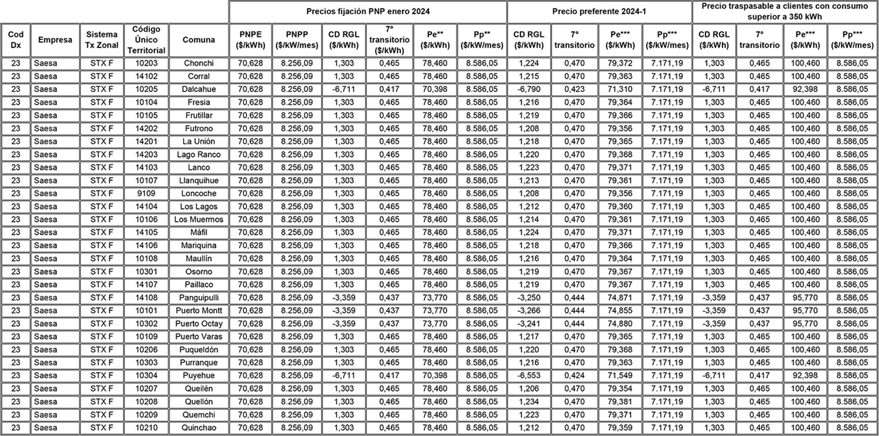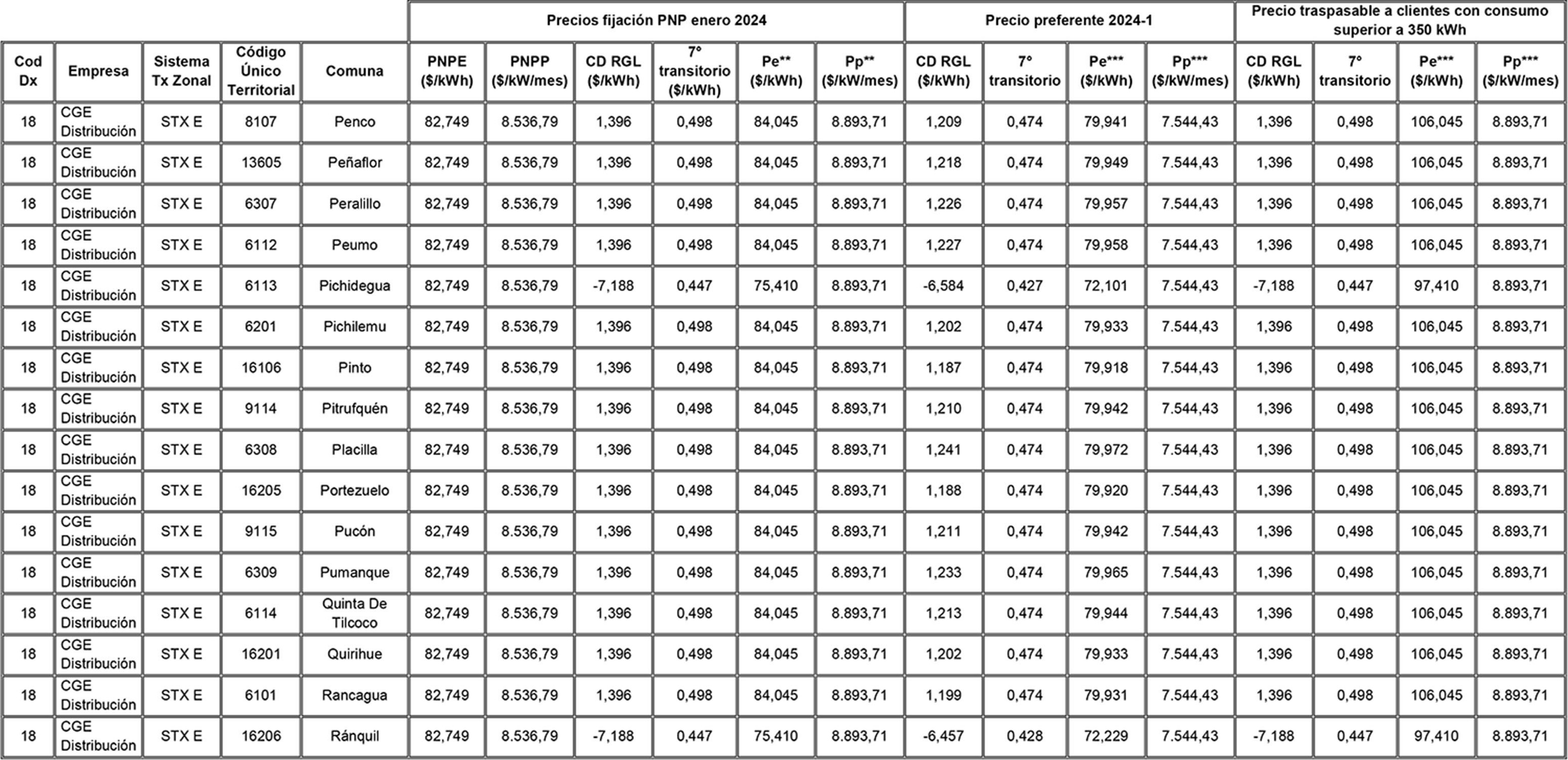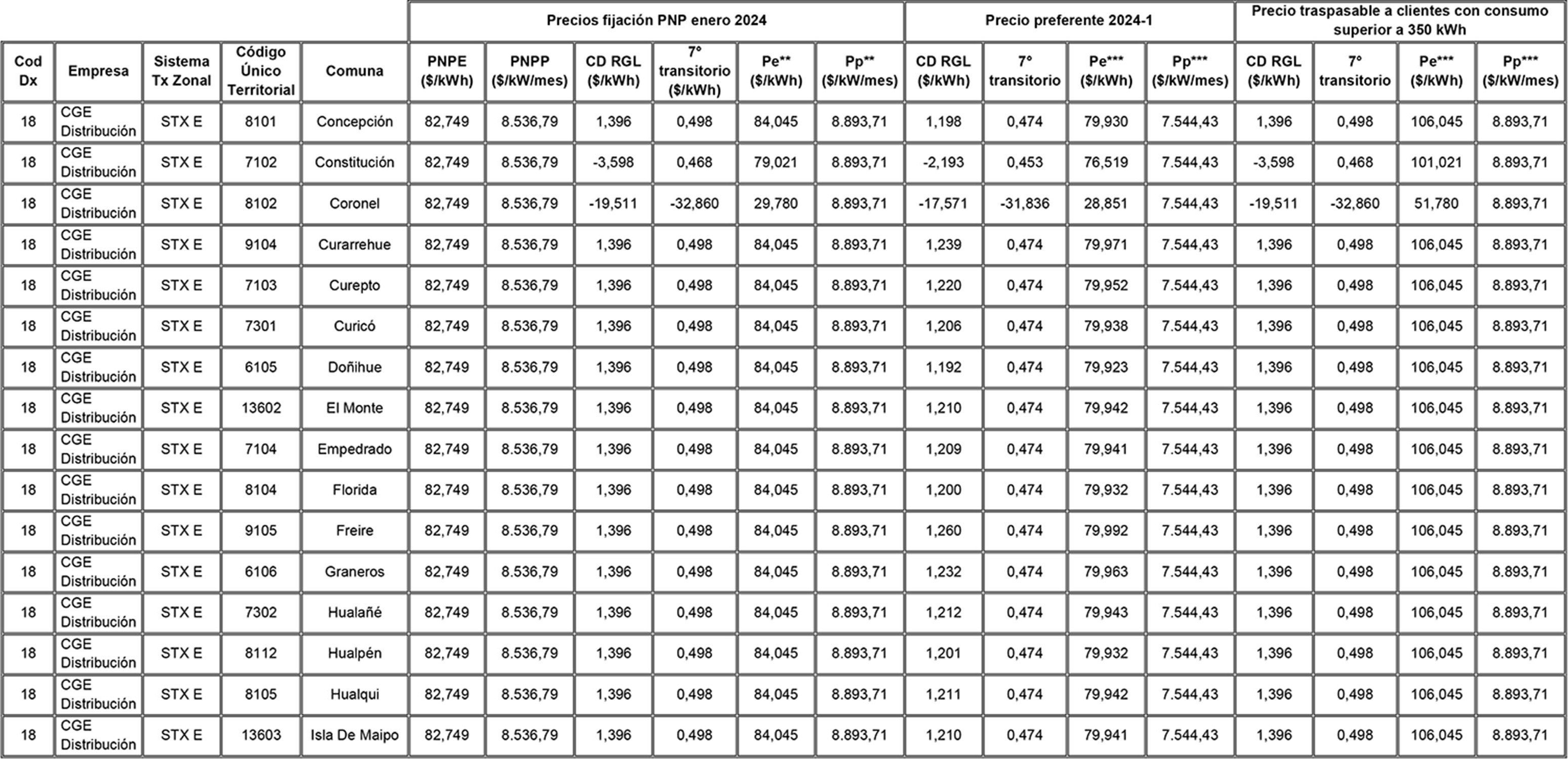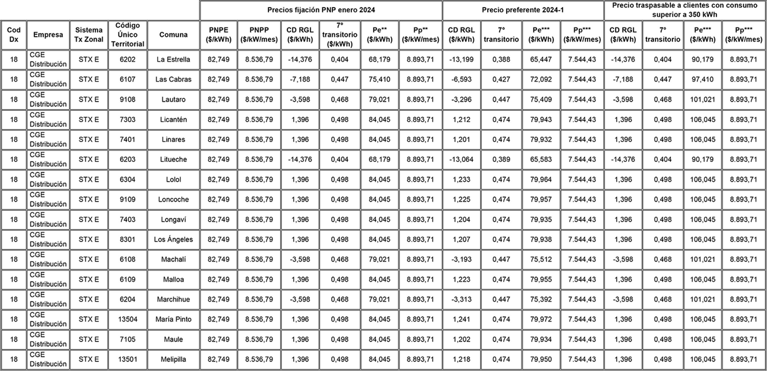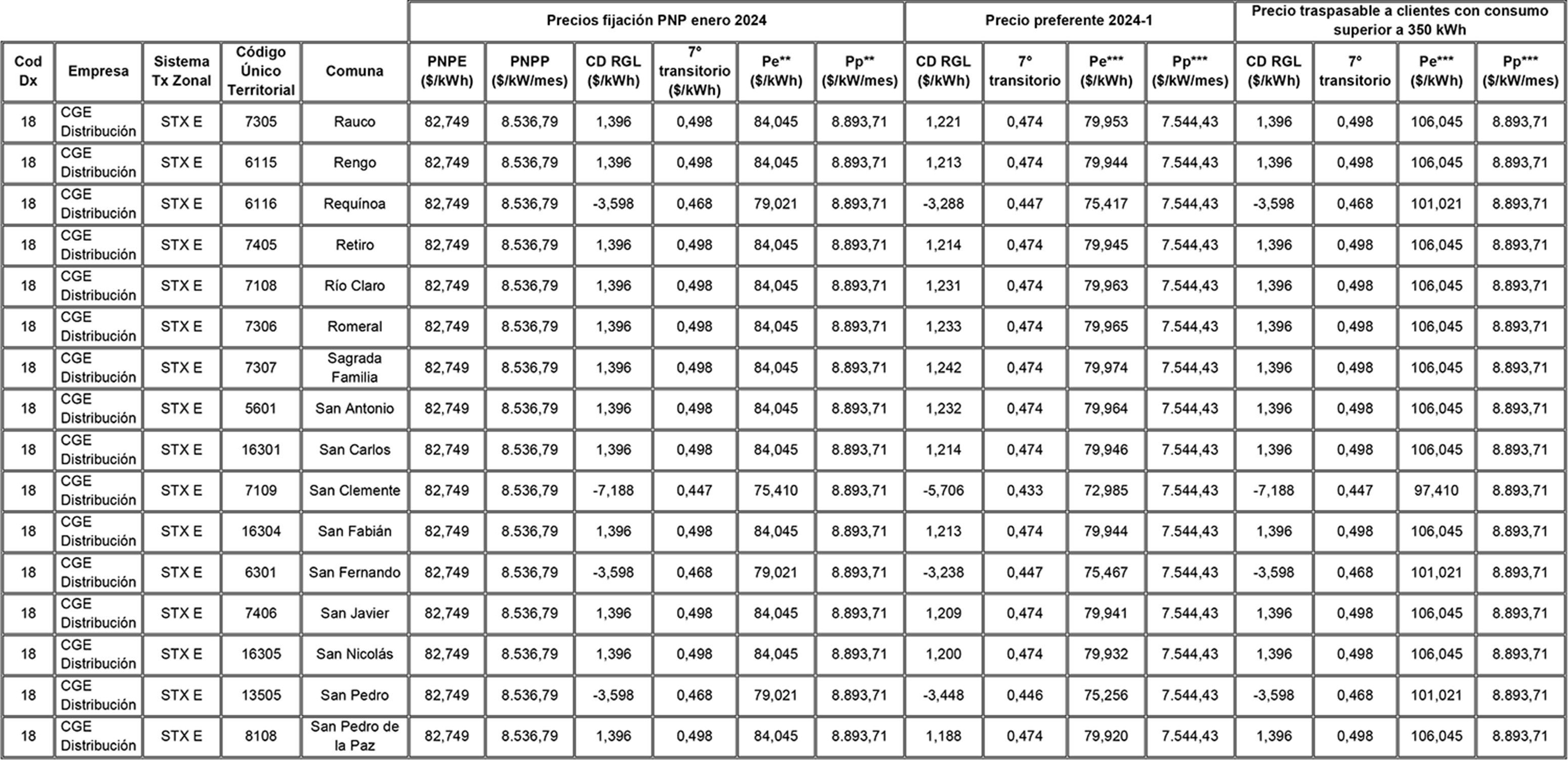 *Todas aquellas comunas que no se encuentren individualizadas en la tabla y que son suministradas por la respectiva Concesionaria en el sistema de transmisión zonal indicado.