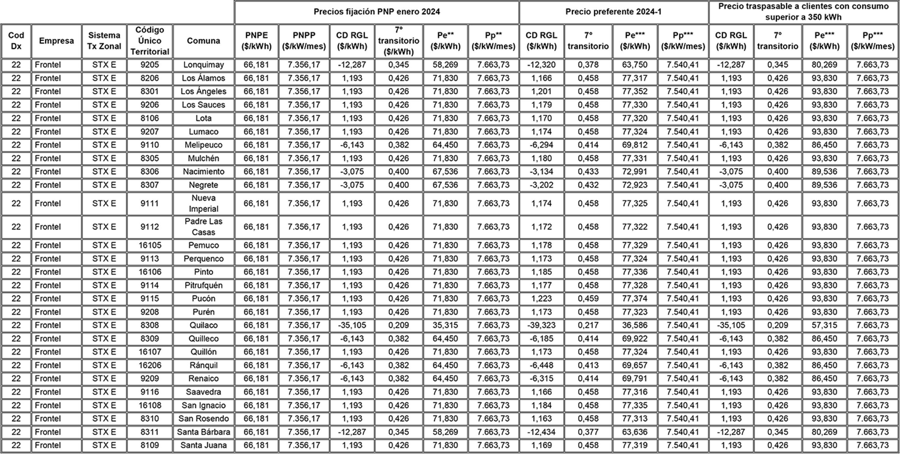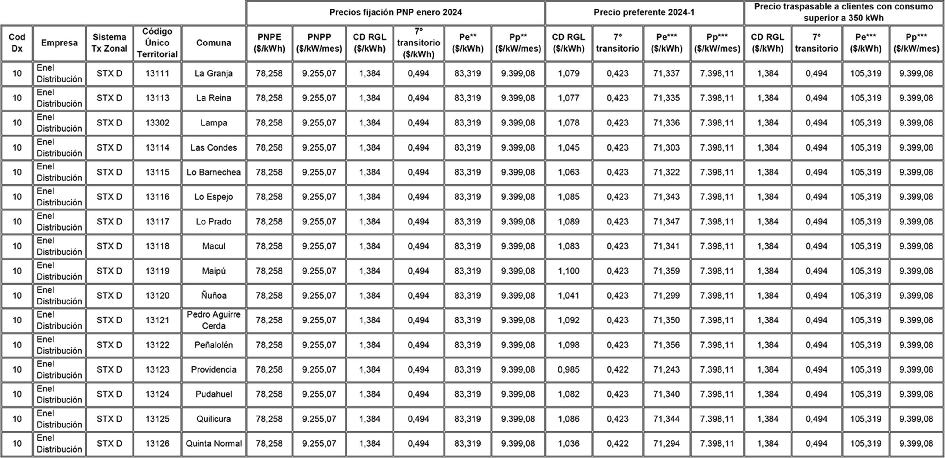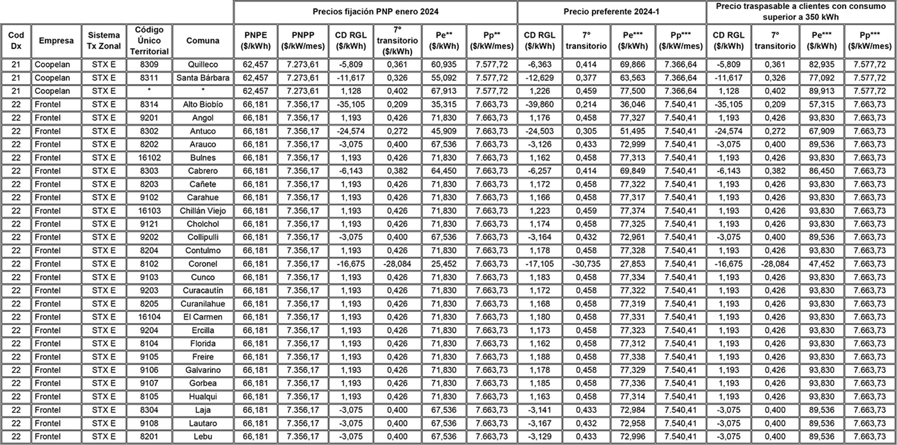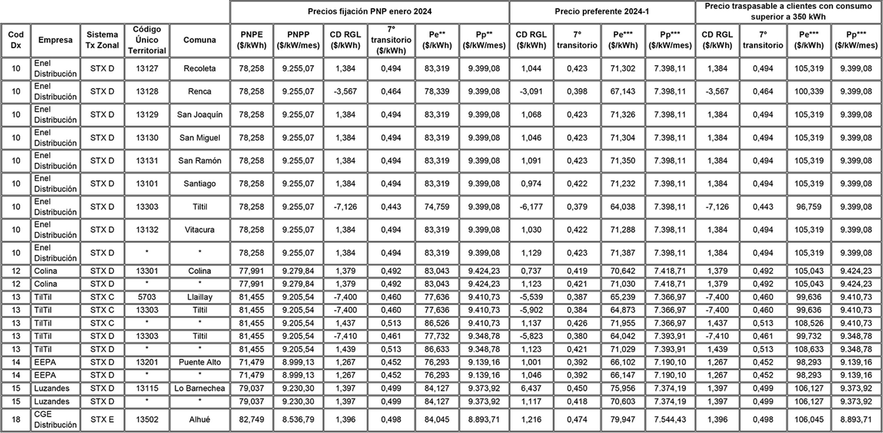 En la Tabla 12, los valores correspondientes a "Precios fijación PNP Enero 2024" se obtienen aplicando los factores Ni, que se señalan en la tabla siguiente: