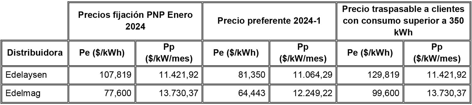 Los precios de energía a nivel de distribución traspasables a Clientes Regulados por las Distribuidoras Edelaysen y Edelmag son los que se establecen a continuación: