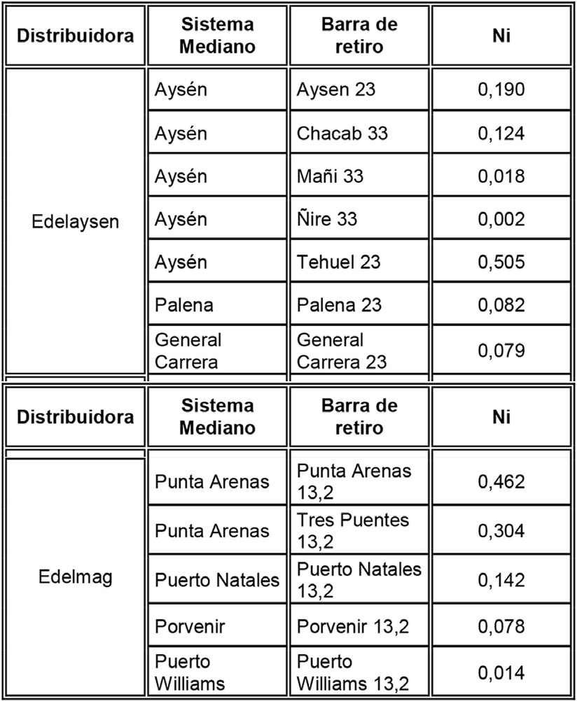 Tabla 13: Ponderadores Ni para precios traspasables a cliente final en los sistemas medianos