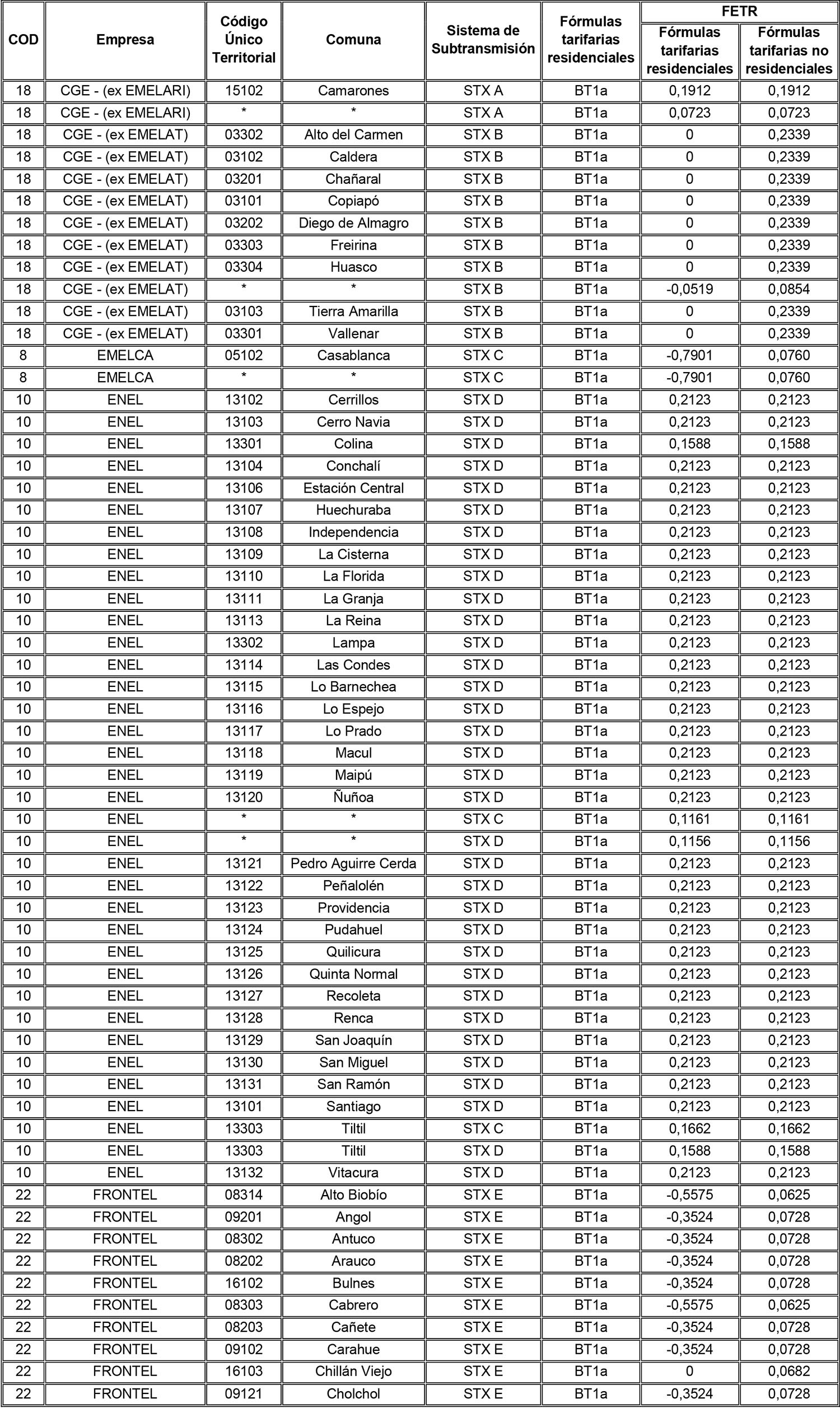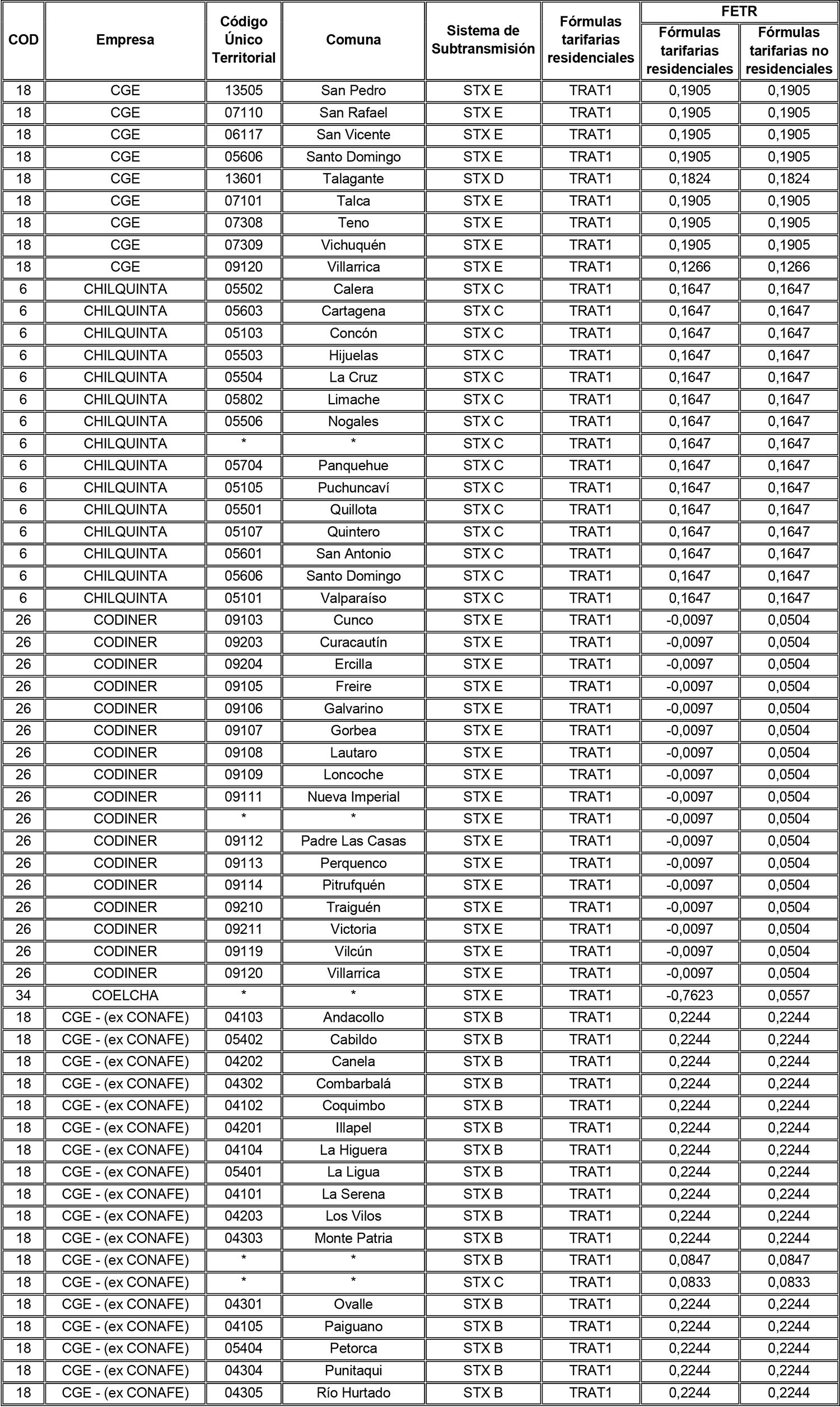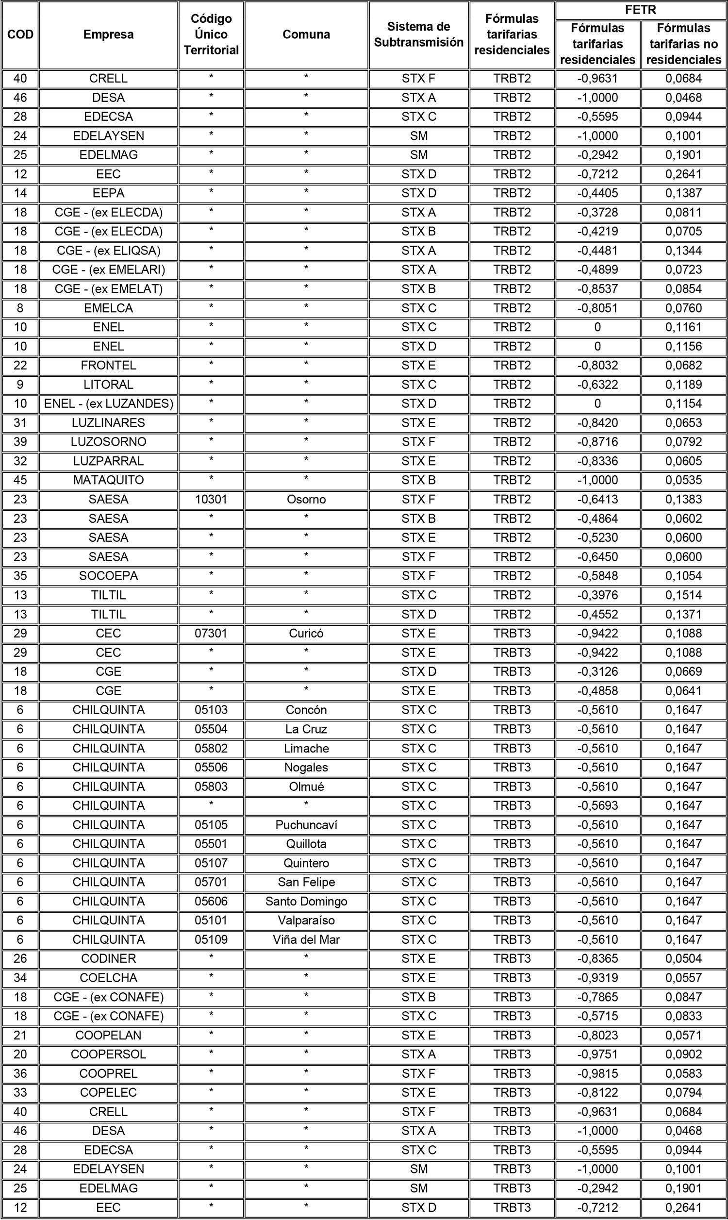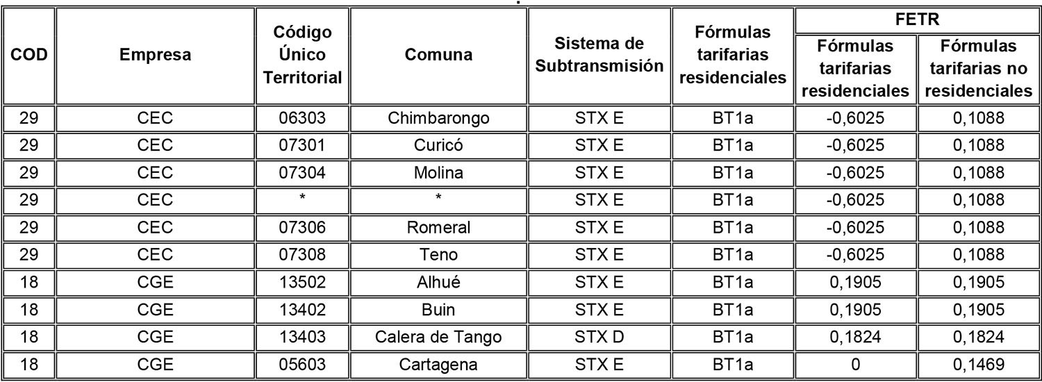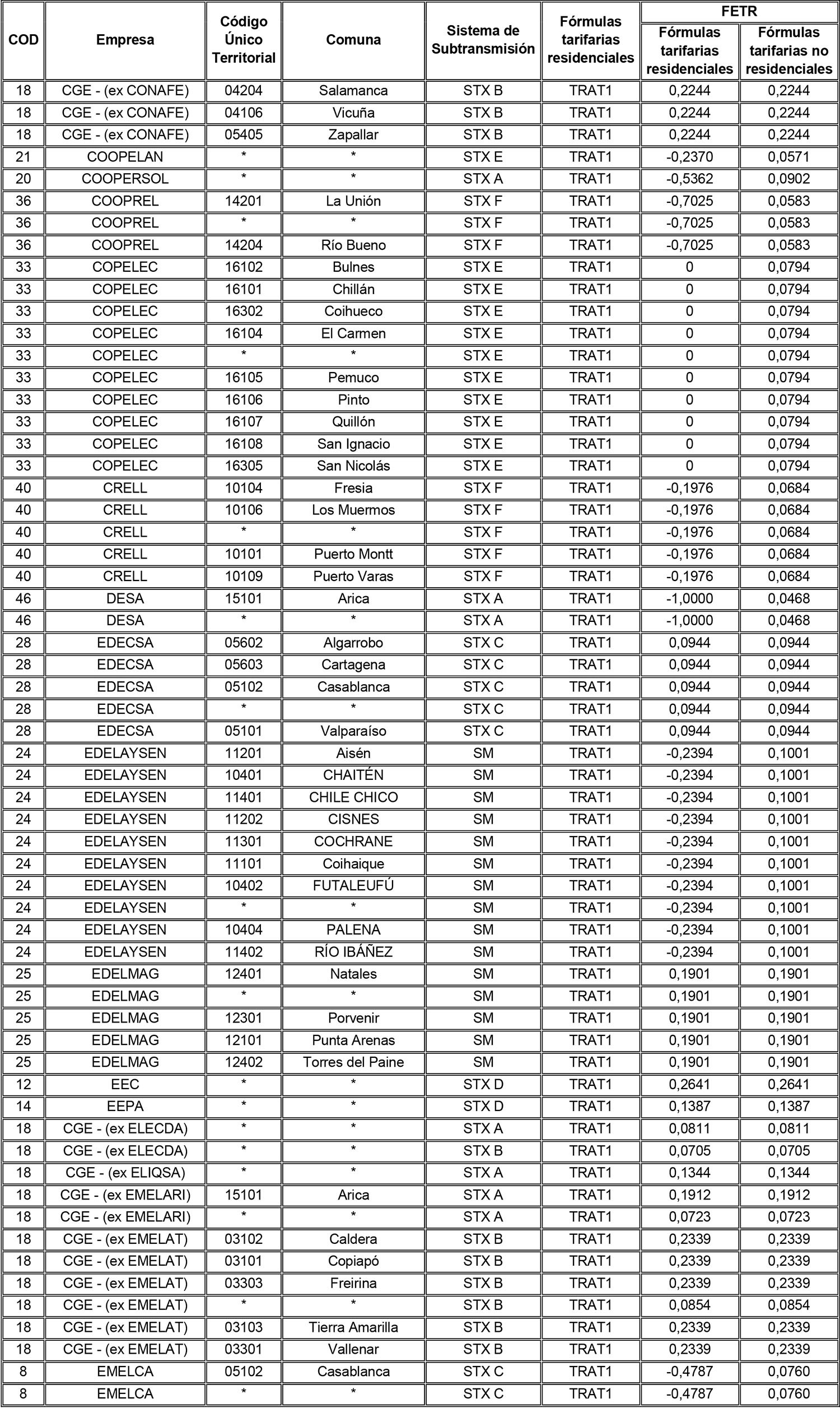 Para aquellas combinaciones empresa/comuna/sistema de transmisión zonal que no tienen asignado en la tabla anterior un FETR para alguna de las tarifas residenciales, se deberá aplicar el FETR determinado para la combinación empresa/sistema de transmisión zonal/tarifa, determinado para aquellas comunas no individualizadas (es decir, que presentan un * en la columna Comuna de la tabla anterior).