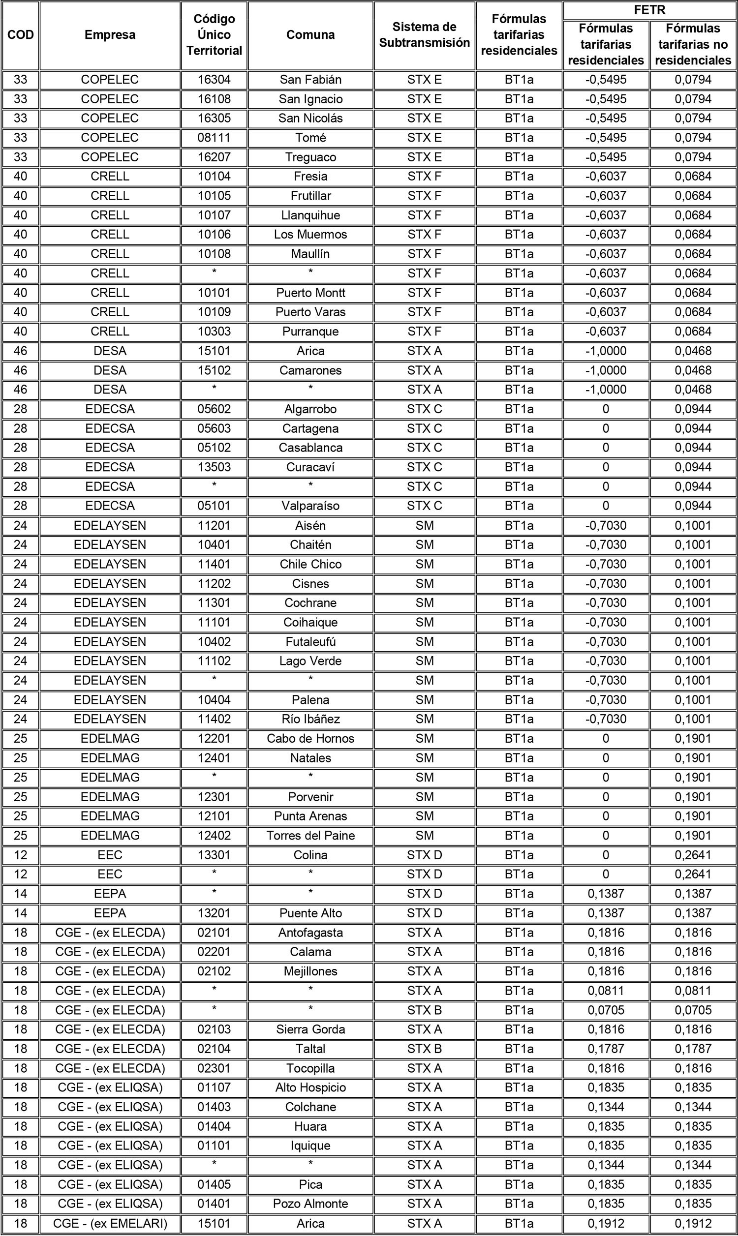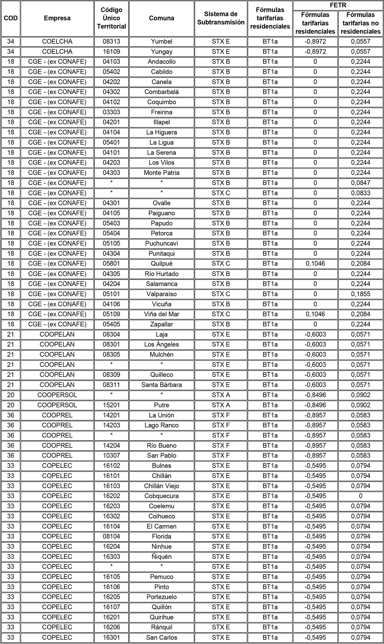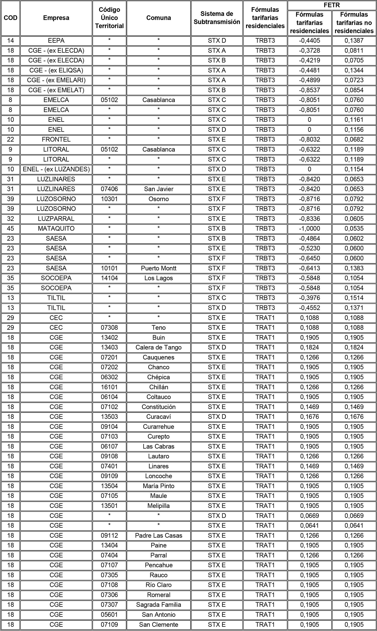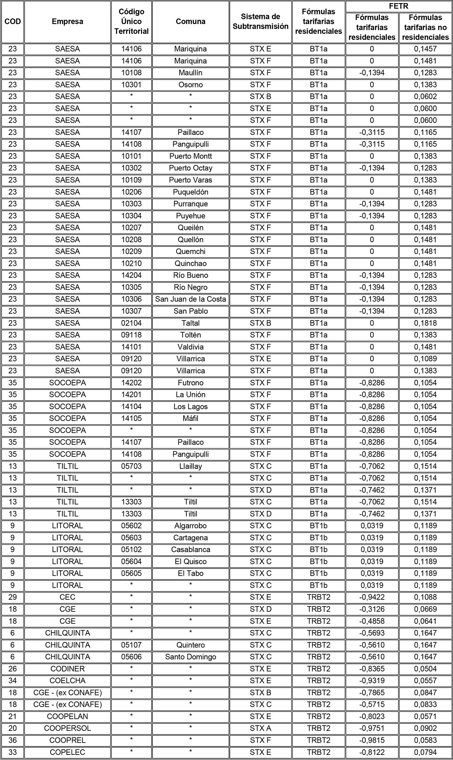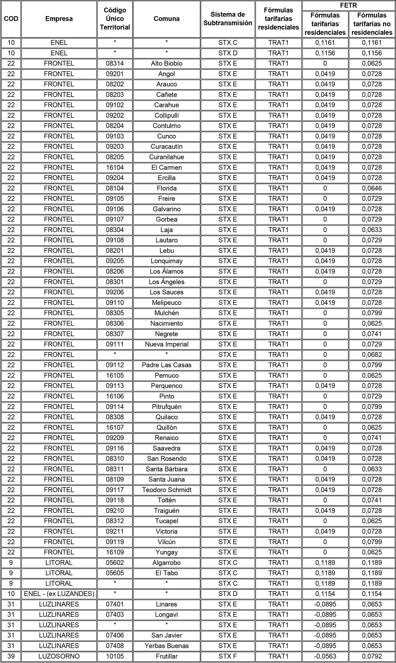 Para aquellas combinaciones empresa/comuna/sistema de transmisión zonal que no tienen asignado en la tabla anterior un FETR para alguna de las tarifas residenciales, se deberá aplicar el FETR determinado para la combinación empresa/sistema de transmisión zonal/tarifa, determinado para aquellas comunas no individualizadas (es decir, que presentan un * en la columna Comuna de la tabla anterior).