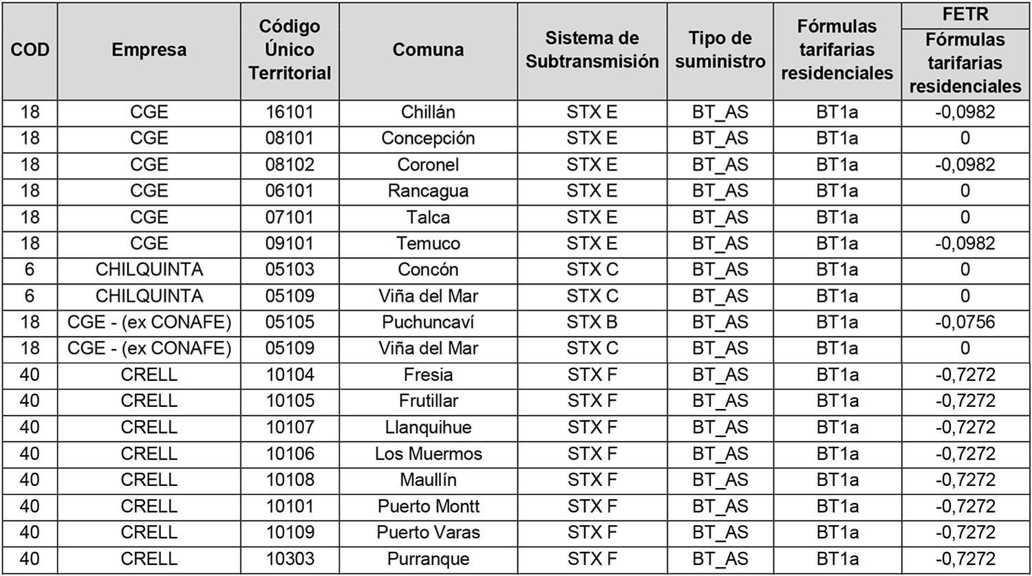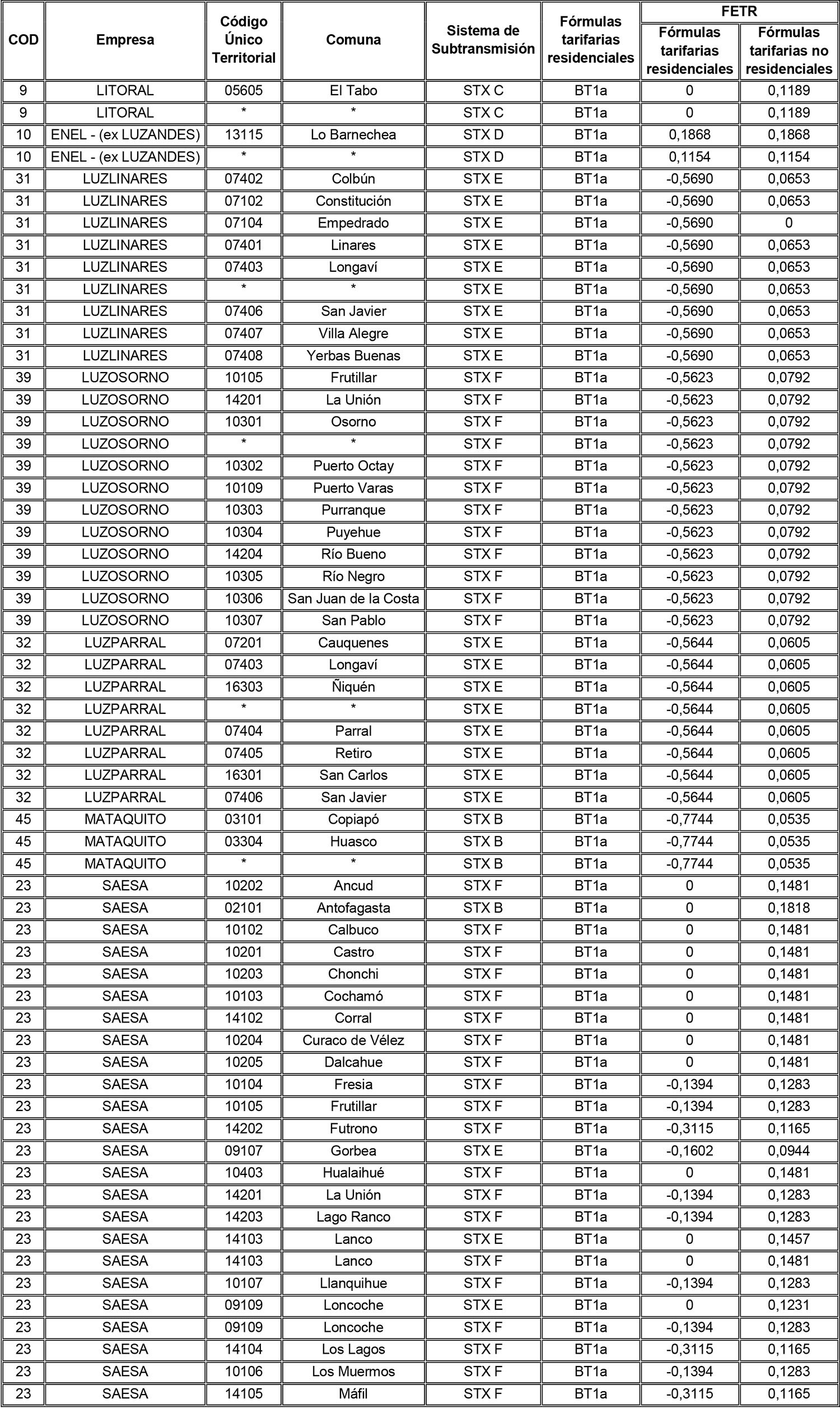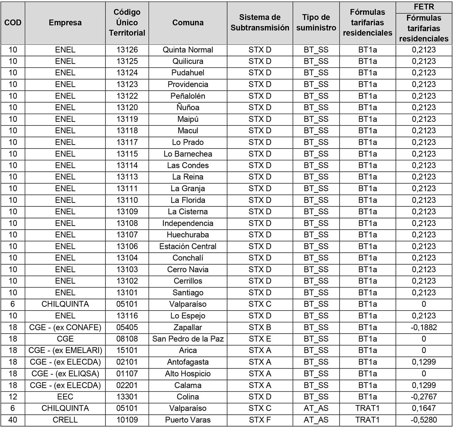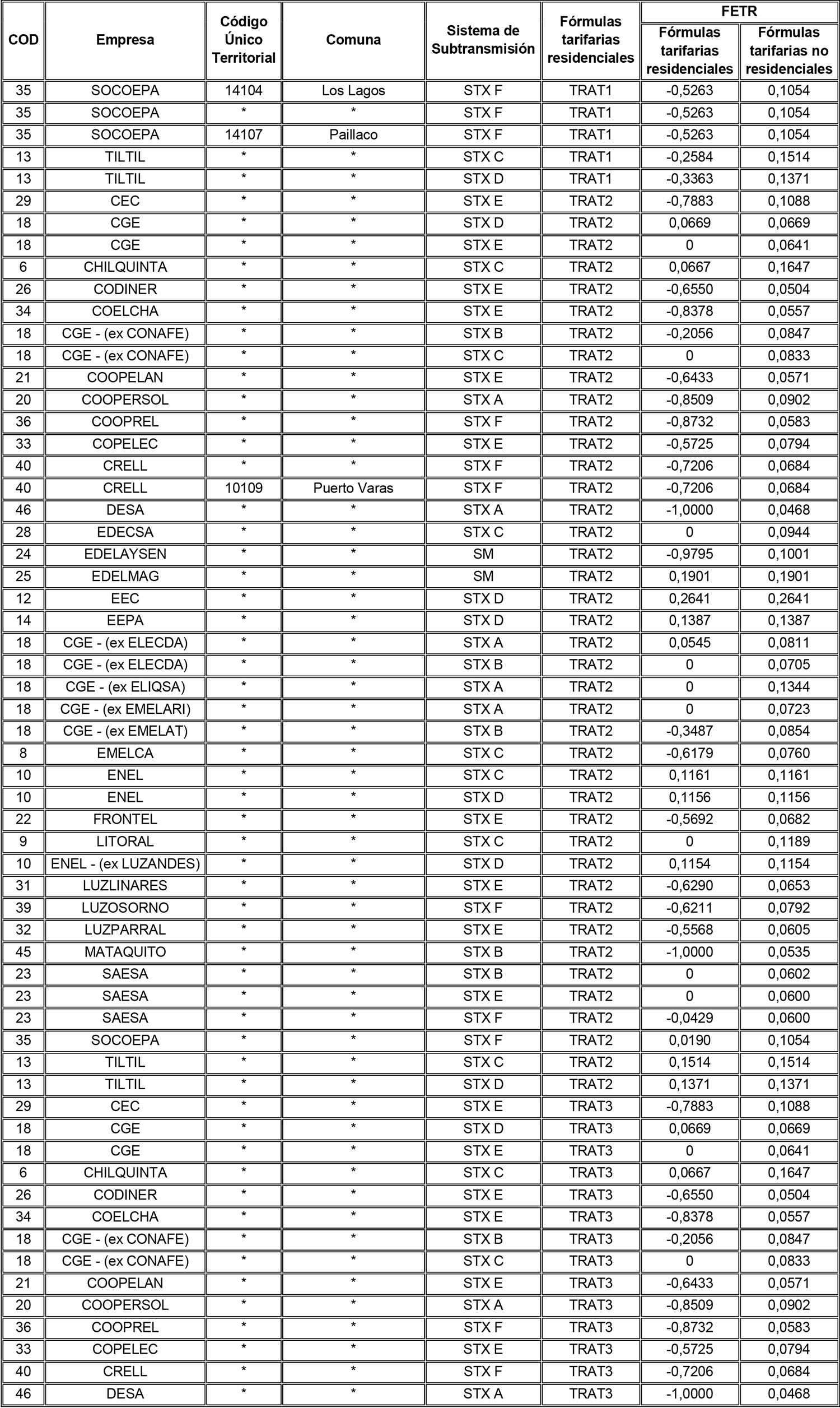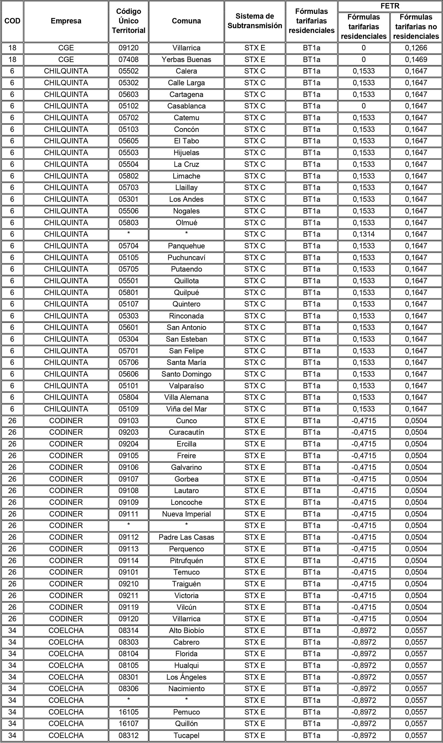 Para aquellas combinaciones empresa/comuna/sistema de transmisión zonal que no tienen asignado en la tabla anterior un FETR para alguna de las tarifas residenciales, se deberá aplicar el FETR determinado para la combinación empresa/sistema de transmisión zonal/tarifa, determinado para aquellas comunas no individualizadas (es decir, que presentan un * en la columna Comuna de la tabla anterior).