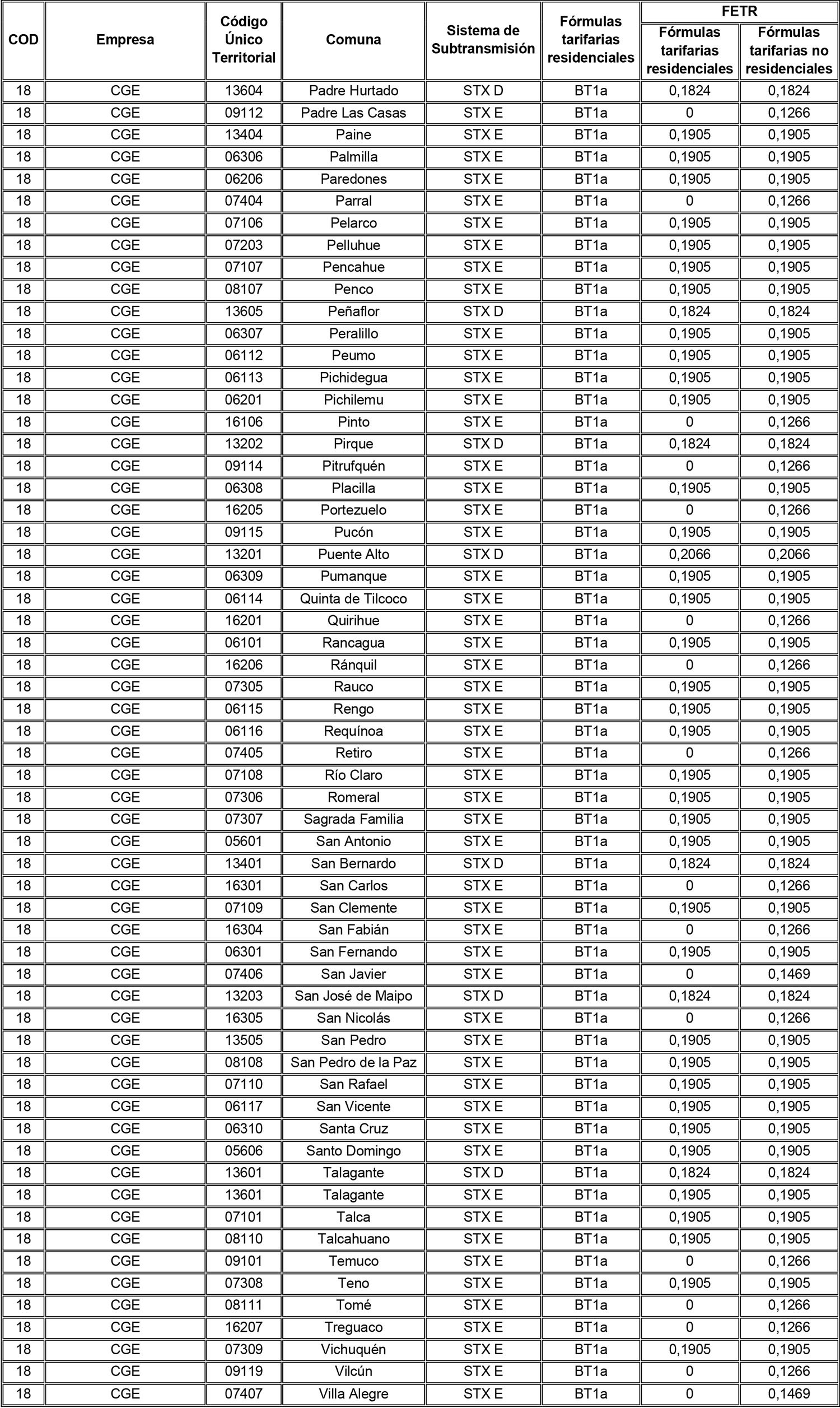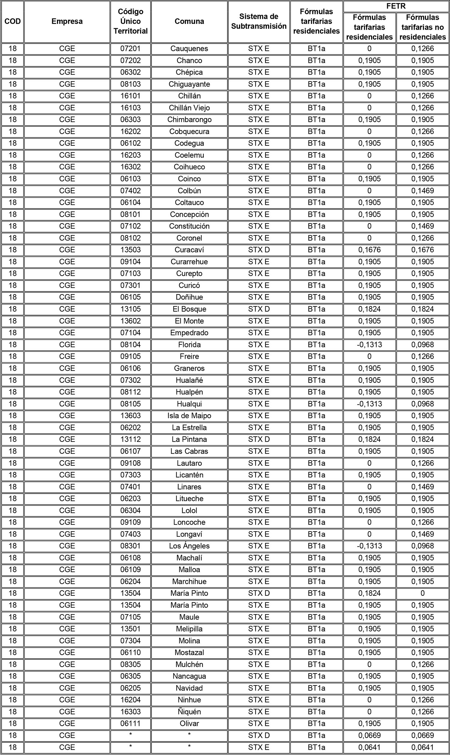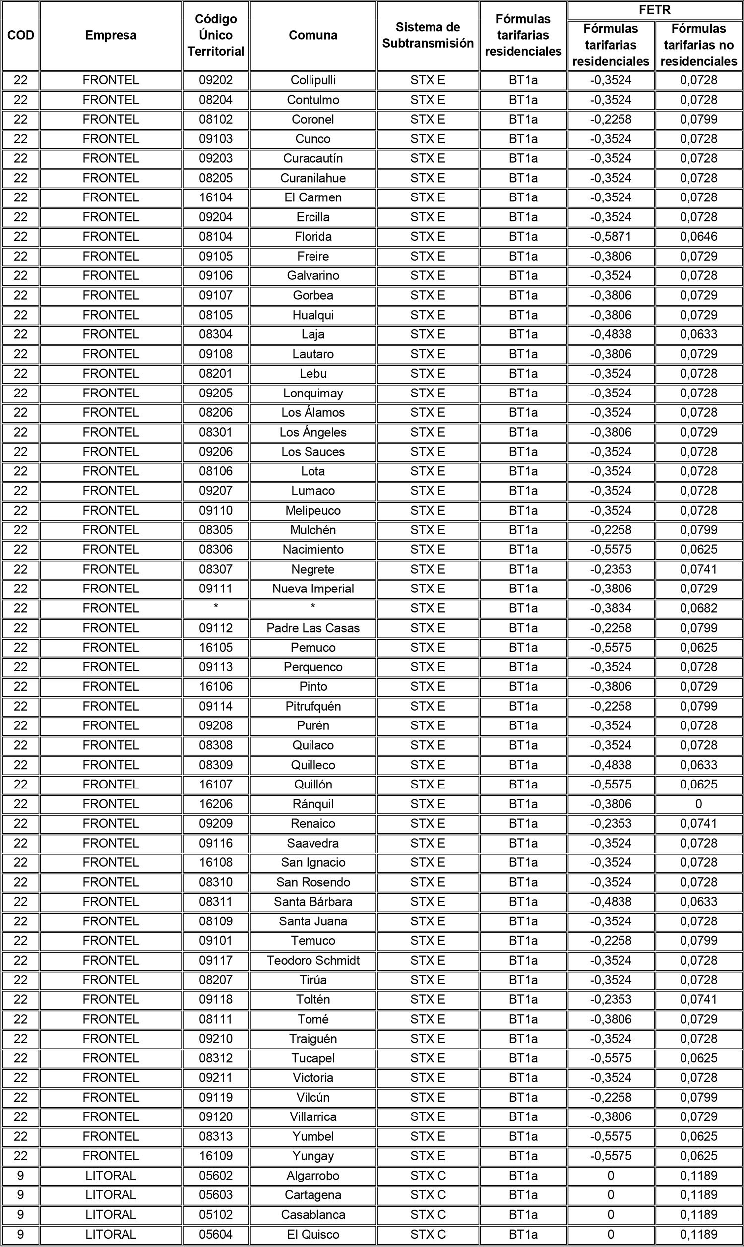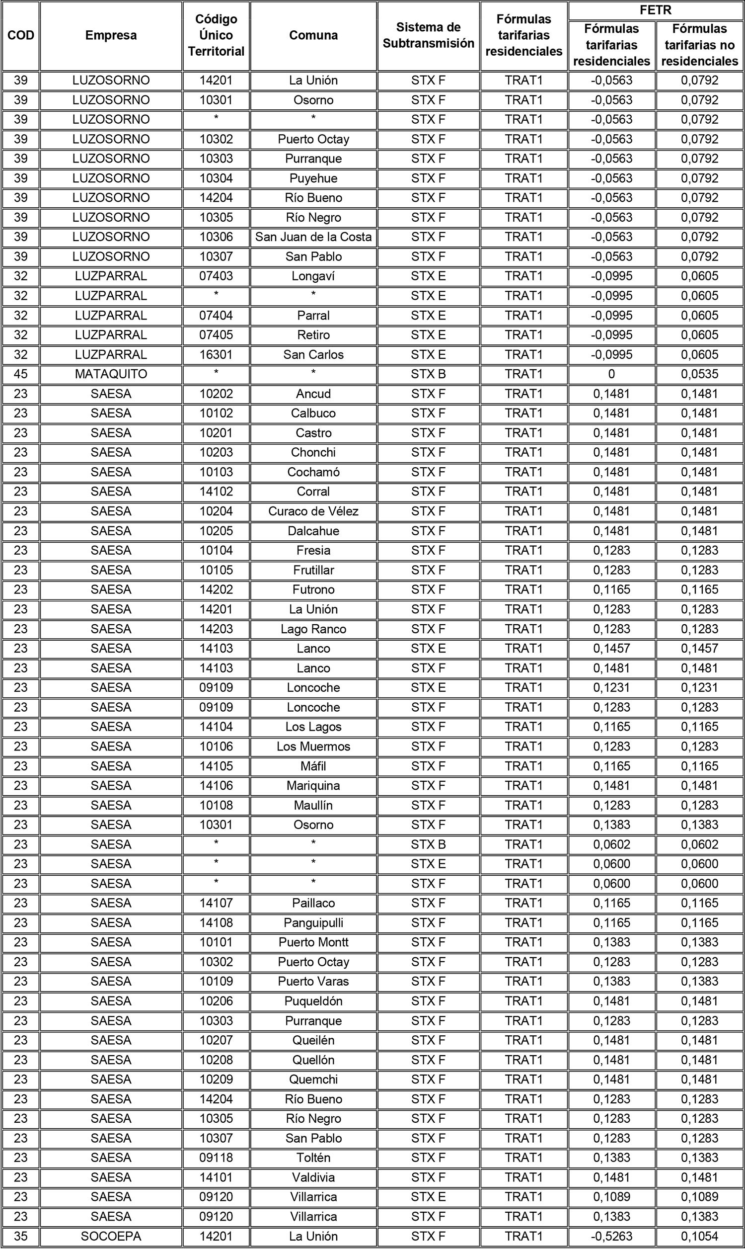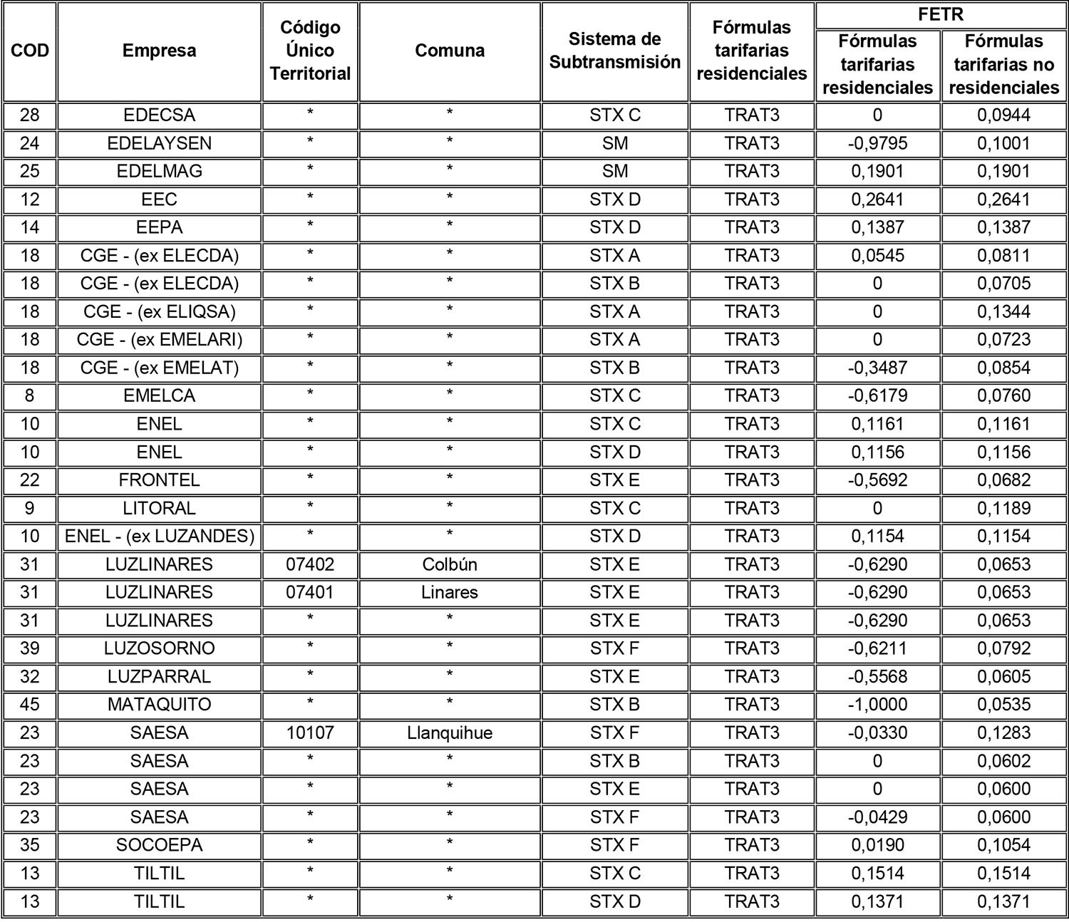 Para aquellas combinaciones empresa/comuna/sistema de transmisión zonal que no tienen asignado en la tabla anterior un FETR para alguna de las tarifas residenciales, se deberá aplicar el FETR determinado para la combinación empresa/sistema de transmisión zonal/tarifa, determinado para aquellas comunas no individualizadas (es decir, que presentan un * en la columna Comuna de la tabla anterior).