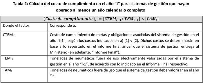 Para los sistemas de gestión que ya hayan operado un año calendario completo al momento de presentar la garantía, el "costo de cumplimiento" se deberá calcular con base en (i) los costos efectivos en que haya incurrido el sistema de gestión en el año anterior; y a (ii) las toneladas que el sistema de gestión deberá recolectar y valorizar en el año para el cual se calcula la garantía. Lo anterior, según lo dispuesto en la siguiente tabla: