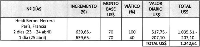 Durante el desempeño de esta comisión de servicio, la Sra. Heidi Berner Herrera continuará percibiendo sus remuneraciones en moneda nacional y tendrá derecho a pasajes aéreos por $4.492.522.-, a seguro de viaje por $10.680.-, y a un viático de USD 1.242,61.- correspondiente al Grado C de la EUS, incrementado en el porcentaje pertinente, así dispuesto en el decreto supremo Nº 147, de 2023, del Ministerio de Relaciones Exteriores, conforme se indica a continuación: