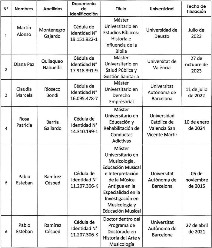 Artículo segundo: Reconózcase, en el marco del "Acuerdo de Reconocimiento Mutuo de Títulos Profesionales y Grados Académicos de Educación Superior Universitaria entre la República de Chile y el Reino de España", suscrito el 23 de junio de 2017, los títulos, diplomas o grados académicos universitarios de postgrado obtenidos en las universidades españolas que se indican a continuación: