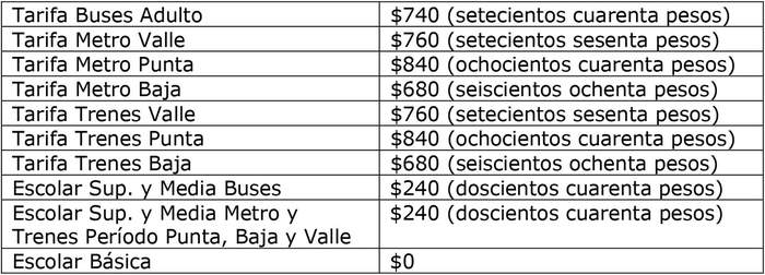 i) Reemplázase la tabla contenida en el literal a), "Tarifas Servicios Puros", de las tarifas actualmente vigentes del Sistema, por la siguiente: