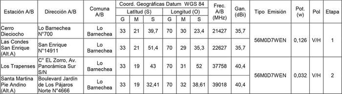 1. Autorízase a la concesionaria para instalar, operar y explotar dos (2) radioenlaces punto a punto, en la Región Metropolitana de Santiago, según se indica a continuación: