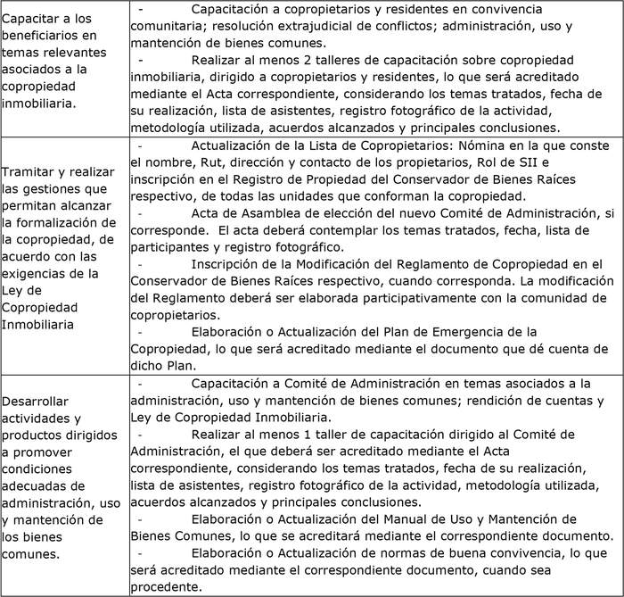 17. Los productos de asistencia técnica y social asociada a la Ley de Copropiedad Inmobiliaria, para los condominios de primera selección, corresponden a los señalados en el apartado "Capítulo Tercero: Proyectos para Condominios de Vivienda" numeral 1 "De los Servicios, Actividades y Productos de Asistencia Técnica y Social" literal c) "Gestión Técnica Social y Legal de Proyectos", numero 7) "Copropiedad inmobiliaria", de la resolución exenta 1.237, de 2019, citada en el visto 7 de la presente resolución. Por su parte, para los condominios en segunda o posterior selección, corresponderán los siguientes: