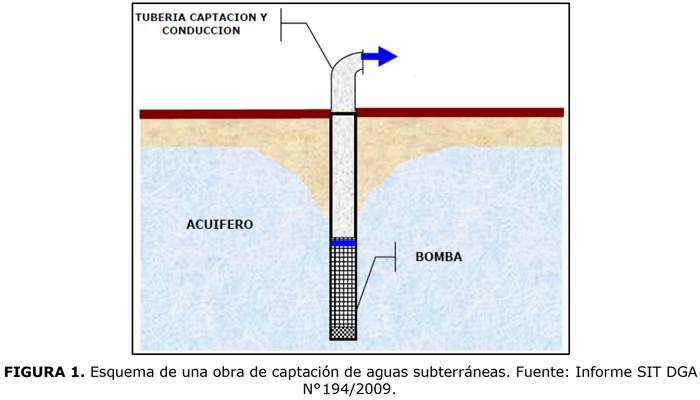 1. Obras de captación de aguas subterráneas: Aquellas instalaciones que permiten el alumbramiento de las aguas subterráneas y hacen posible la efectiva extracción de un caudal sobre el que se tiene o no derecho de aprovechamiento constituido, tales como: bombas de extracción, ya sean móviles o fijas; instalaciones mecánicas, eléctricas, tuberías, u otros (Art. 129 bis 9 del Código de Aguas, y Art. 52 DS MOP Nº 203/2014, Reglamento Sobre Normas de Exploración y Explotación de Aguas Subterráneas).