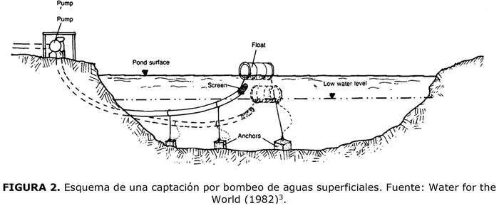 2. Captaciones de agua mediante tubería a presión: Son aquellas que permiten que el agua sea extraída o derivada mediante conducciones a sección llena, sin contacto directo con la atmósfera, permitiendo que, generalmente, el agua circule en ellas con presión superior a la atmosférica. La captación podrá ser satisfactoria utilizando un procedimiento de elevación e impulsión con equipos de bombeo o mediante su disposición en infraestructuras en que la presión superior a la atmosférica sea generada por meras razones de desnivel topográfico.