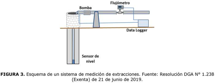 4. Sistema de medición de extracciones: Sistema que se compone de un sensor para medir caudales y volumen extraído (flujómetro o caudalímetro), de un sensor para medir el nivel freático (pozómetro, de presión, piezorresistivo, u otro) y de un data logger, en caso de corresponder, para el almacenamiento y/o respaldo de datos medidos en la obra de captación (Art. 67 y 68 del Código de Aguas; Art. 40 DS Nº 203/2013; Art. 1, numeral 1.1 de la resolución DGA Nº 1.238 (exenta) de 2019).