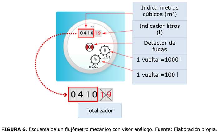 Por ejemplo, si la manecilla 0,01 m³ (10 litros) da una vuelta completa en 20 segundos, eso significa que hay un caudal pasante de 100 litros en 20 segundos, puesto que por cada número por el que pasa la manecilla, suma 10 litros, y como dio una vuelta completa en 20 segundos, se debe multiplicar x0,01 por 10. Entonces, se obtiene un caudal de 5 l/s. Del totalizador sólo deben registrarse números enteros, en el caso de la Figura 6, 410 m³.