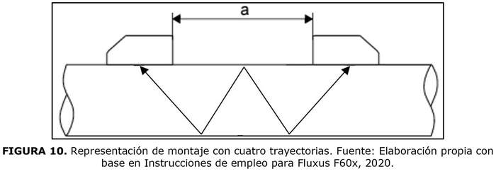. Método reflexión con cuatro trayectorias: Es adecuado para mediciones en tuberías donde la atenuación de la señal de los transductores es demasiado baja y, por tanto, es necesario aumentar la distancia de espaciamiento de los transductores.