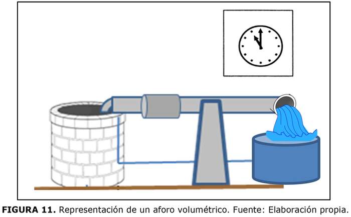 ii. Aforo Volumétrico: Método en que el caudal se mide directamente a través del llenado de un recipiente de volumen conocido en un período cronometrado e implica, en algunos casos, la desconexión de bridas o corte de tuberías.