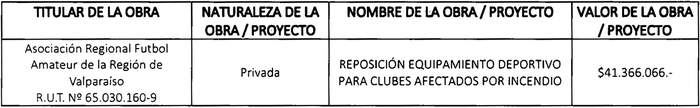 6. Que, a través de carta emitida por Rolando Ponce Vinnett, presidente de la Asociación Regional Fútbol Amateur de la Región de Valparaíso, el 22 de julio de 2024, manifiesta la disponibilidad de la Asociación referida para ser ejecutora de la obra "Reposición equipamiento deportivo para clubes afectados por incendio".