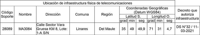 1. Autorízase a la concesionaria para modificar su concesión, individualizada en la letra e) de los Vistos, en el sentido de incorporar infraestructura física ya autorizada, conforme al decreto que se detalla en el siguiente cuadro: