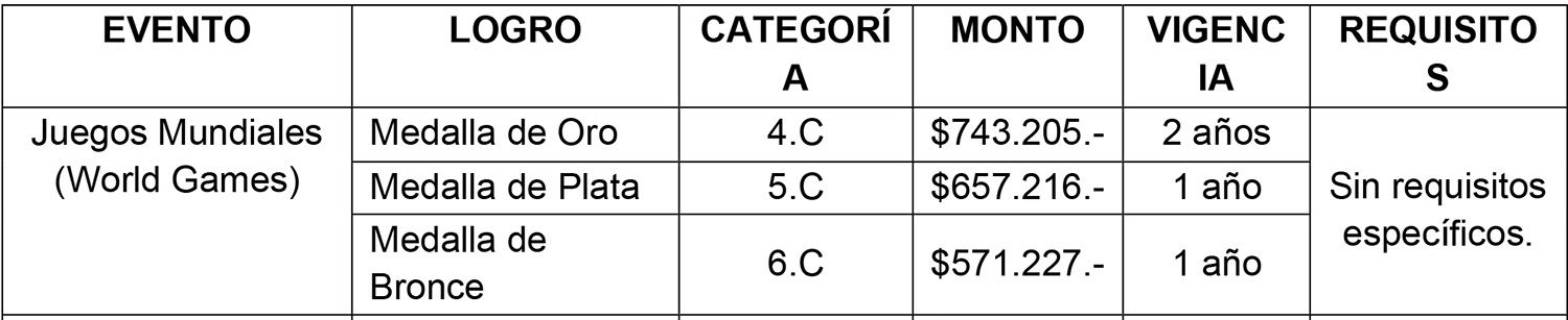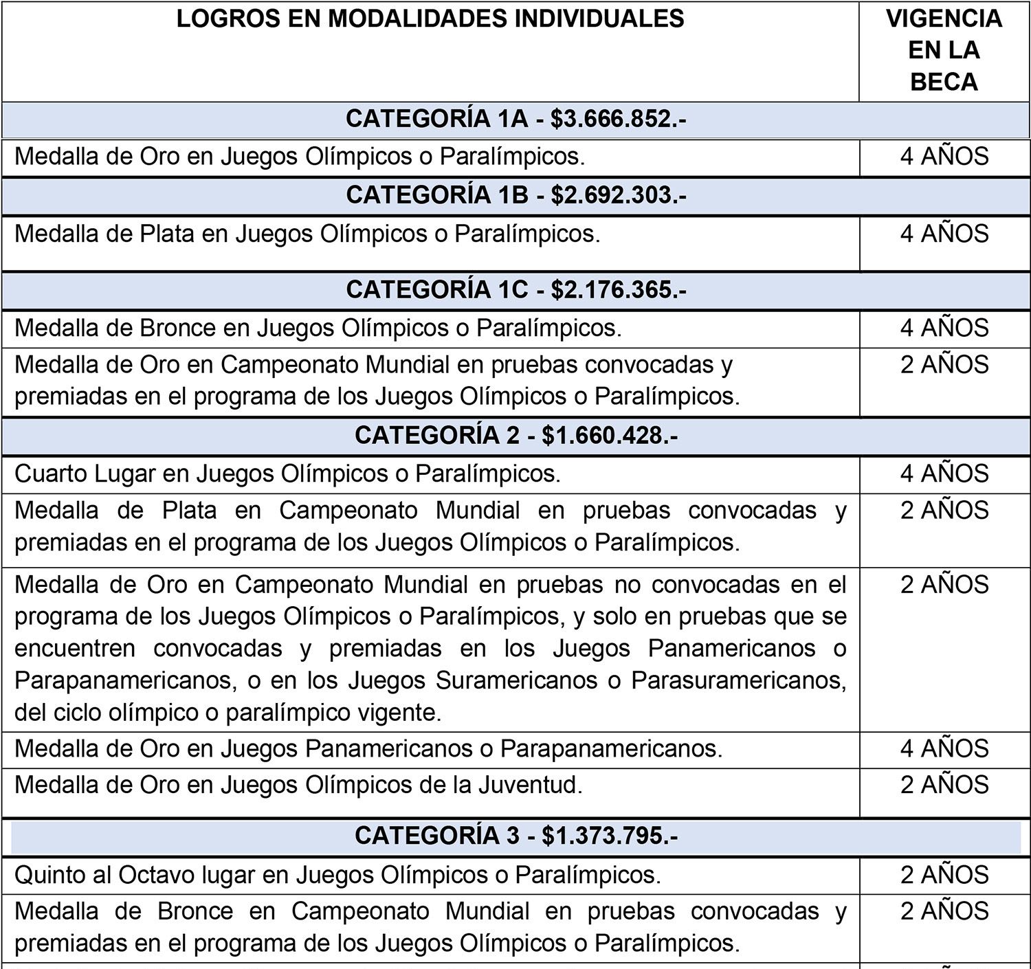 Las categorías, montos y años de vigencia en el Sistema de Becas, por logros obtenidos en categoría Juvenil y Todo Competidor, correspondientes a deportes individuales, del Ciclo Olímpico y Paralímpico de verano e invierno, son los siguientes: