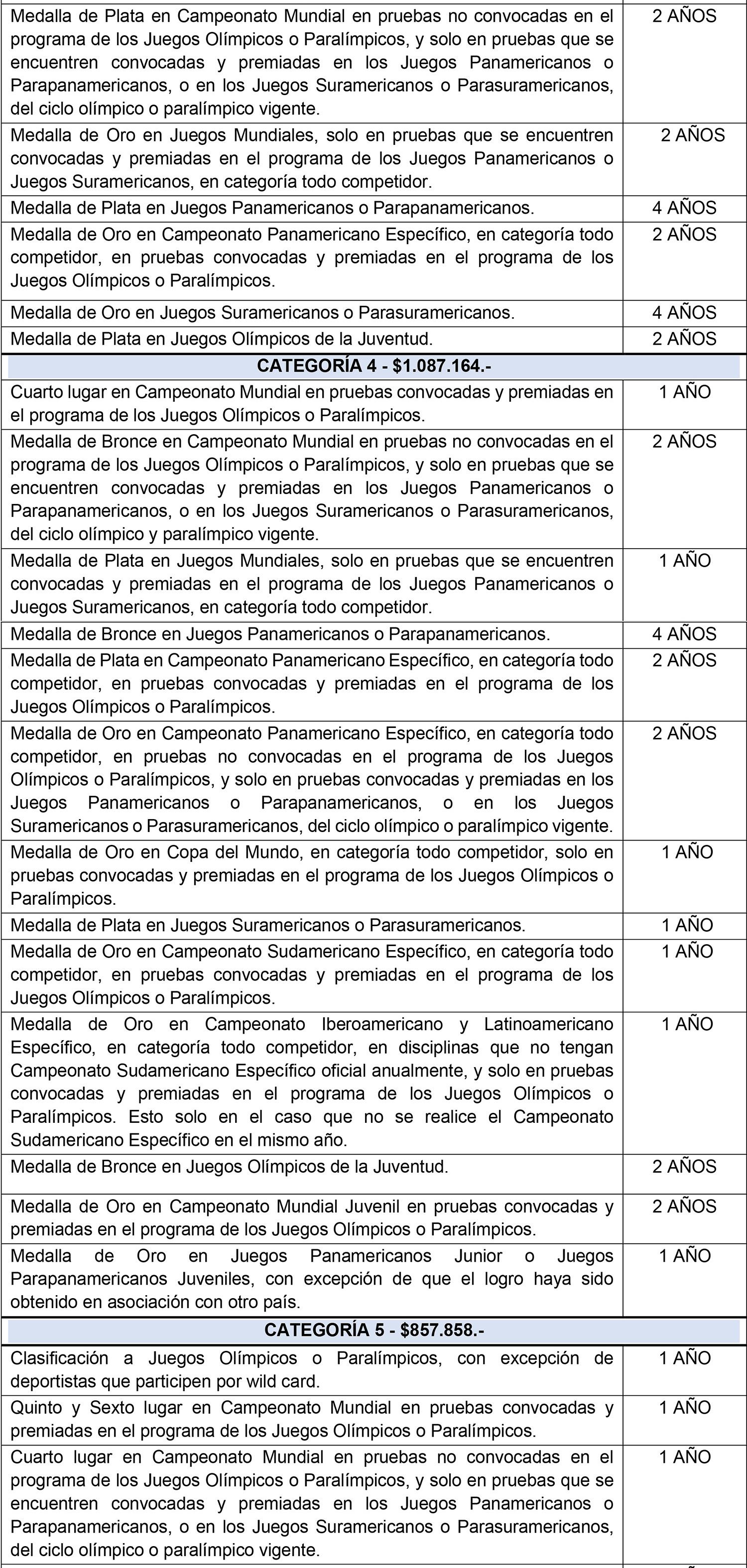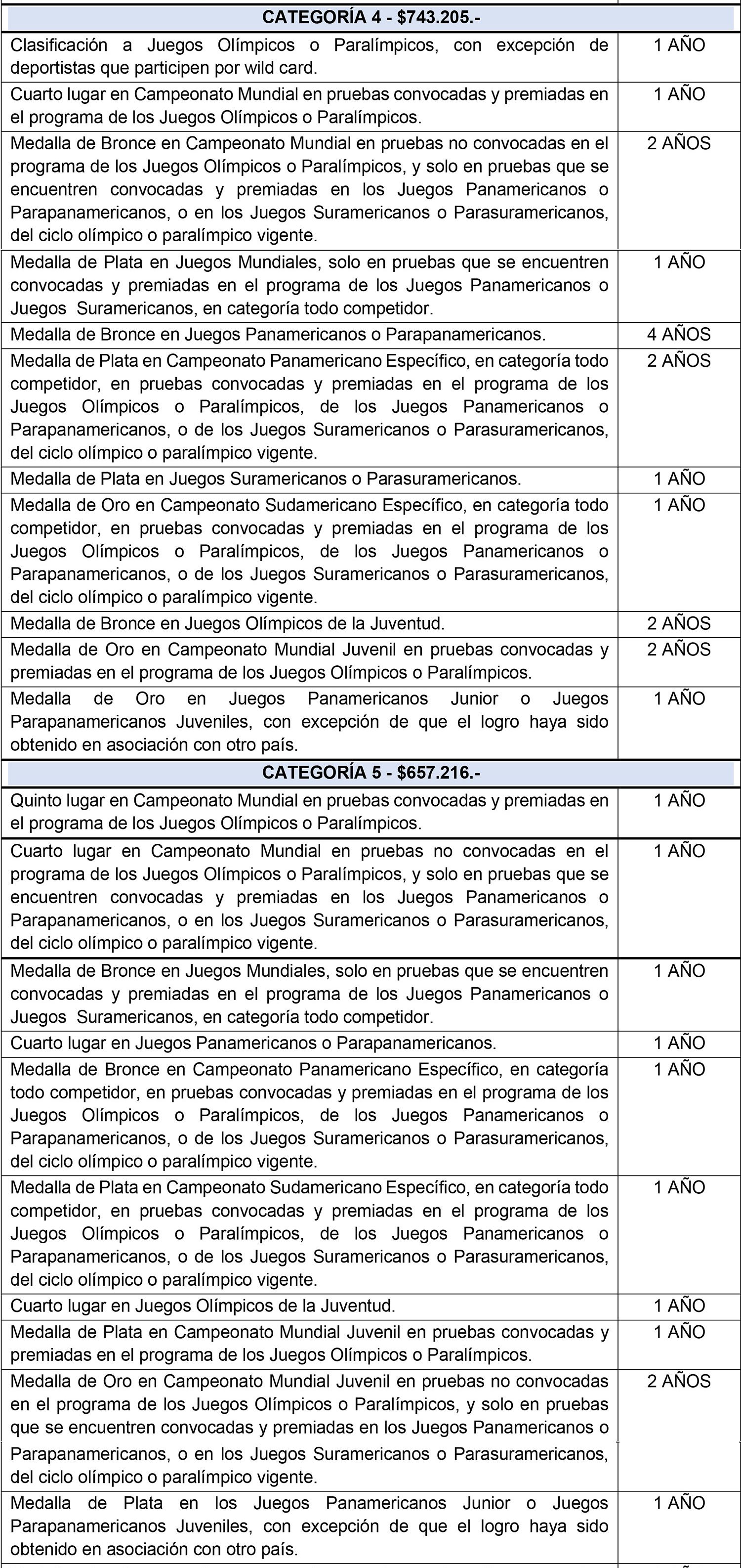 11. Que se agregan también, nuevos logros correspondientes a la categoría juvenil, para modalidades individuales y colectivas en el Ciclo Olímpico y Ciclo Paralímpico, de verano e invierno, correspondiendo dicho incentivo económico al monto líquido del sueldo mínimo actual.
