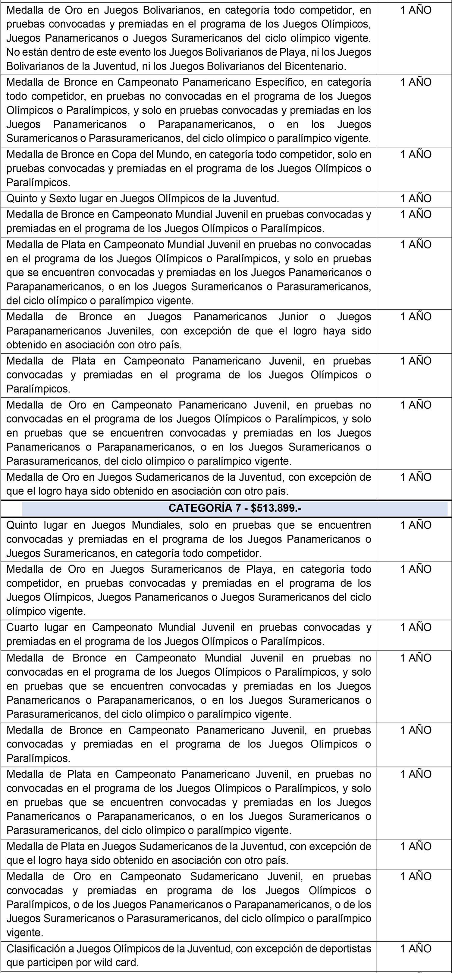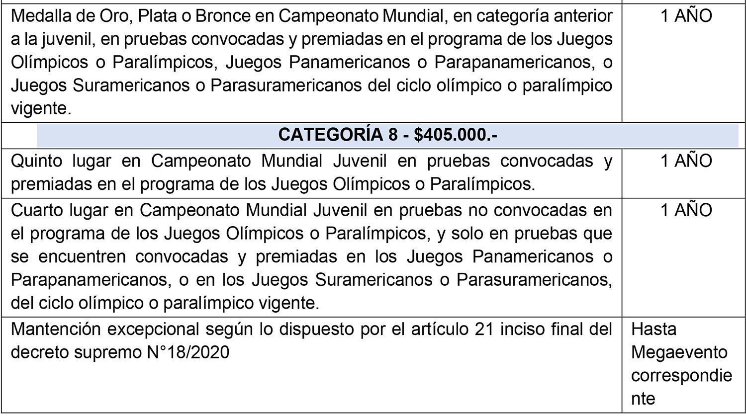 Respecto a los logros obtenidos por deportistas en la Categoría Juvenil y en la categoría inmediatamente anterior a la Categoría Juvenil, en pruebas no convocadas a los Juegos Olímpicos o Paralímpicos, a los Juegos Panamericanos o Parapanamericanos, o a los Juegos Suramericanos o Parasuramericanos, deberá considerarse que la prueba esté convocada y premiada en los Mega Eventos del Ciclo Juvenil, es decir, en los Juegos Olímpicos de la Juventud, Juegos Panamericanos Junior o Juegos Parapanamericanos Juveniles o Juegos Suramericanos de la Juventud.