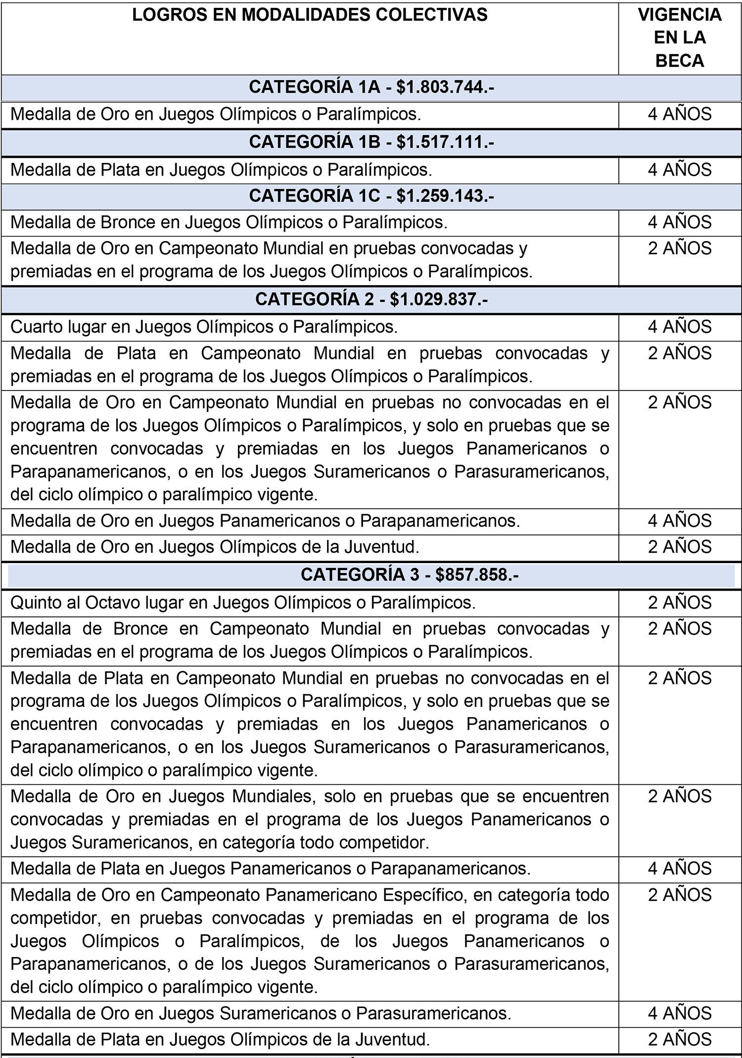 Las categorías, montos y años de vigencia en el Sistema de Becas, por logros obtenidos en categoría Juvenil y Todo Competidor, correspondientes a deportes colectivos, del ciclo olímpico y paralímpico de verano e invierno, son los siguientes: